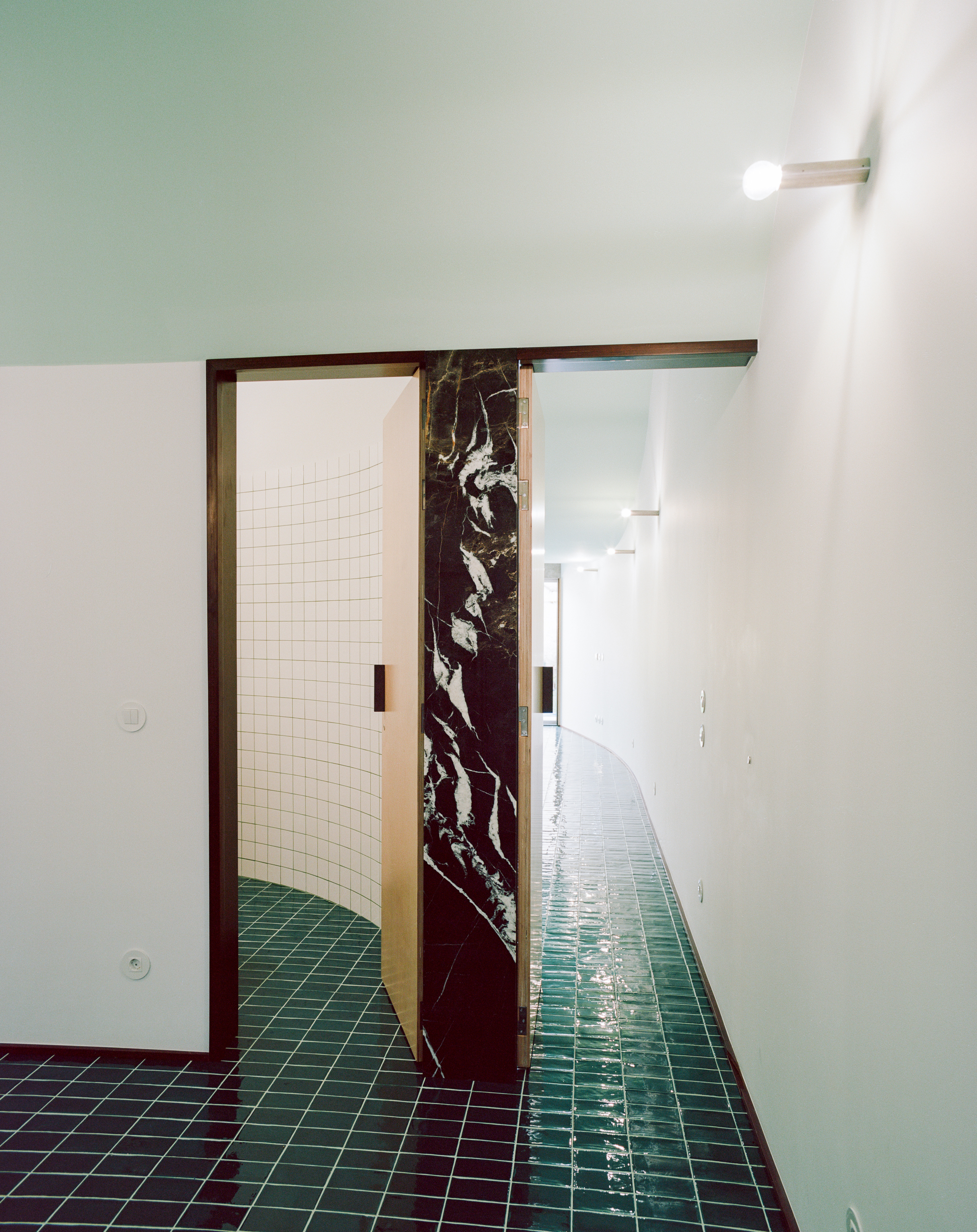 The geometry of a narrow house is settled within a few lines. The intervention happens both in plan projection and in section. Curved walls are intersected with sinuous ceiling resulting in a space that is not static. In the evening, multiple folds and creases create a bizarre game of light and shadow.