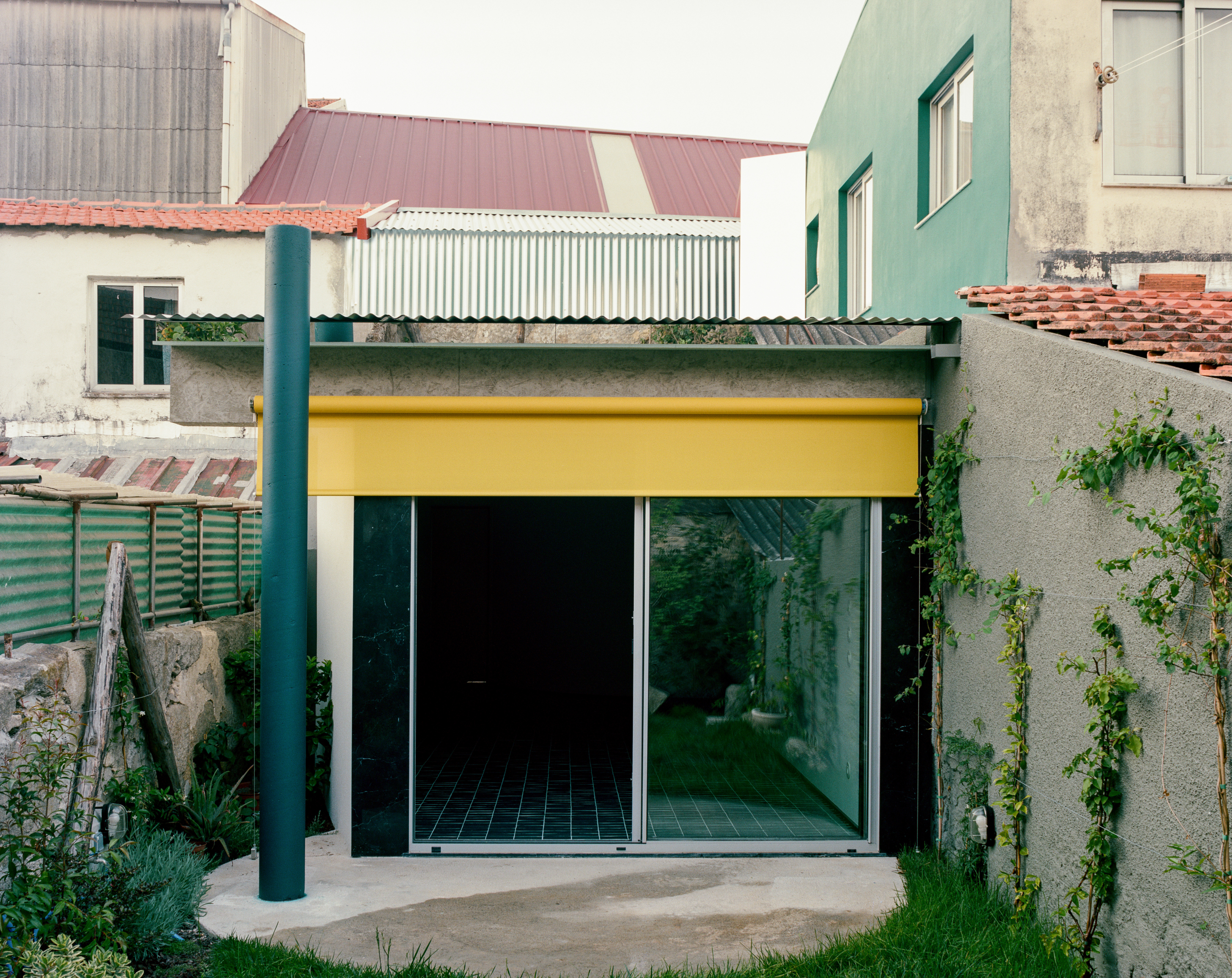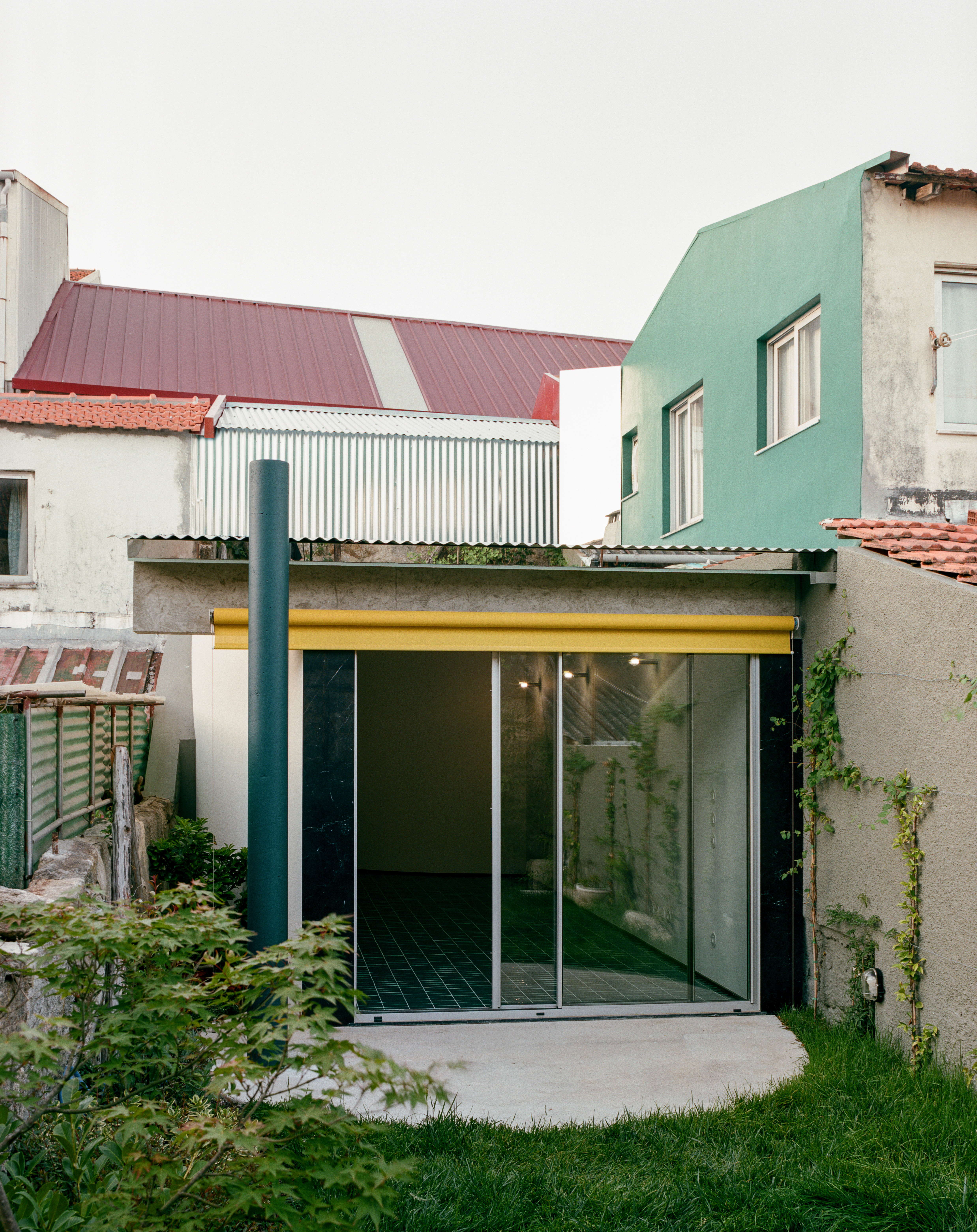 On the street front, the façade maintains an unassuming presence on the street. It looks like its neighbours but it also does not. It presents itself as a closed wall with a blue door and a small window. In contrast, the open back façade is an overlay of elements sitting within the whimsical garden: a large opening, accompanied by a concrete beam, a free standing blue column and a bright yellow shutter. Mirrors conceal chimneys and unwanted thicknesses, rendering the roof paper thin. Bold stripes of black marble frame both elevations.