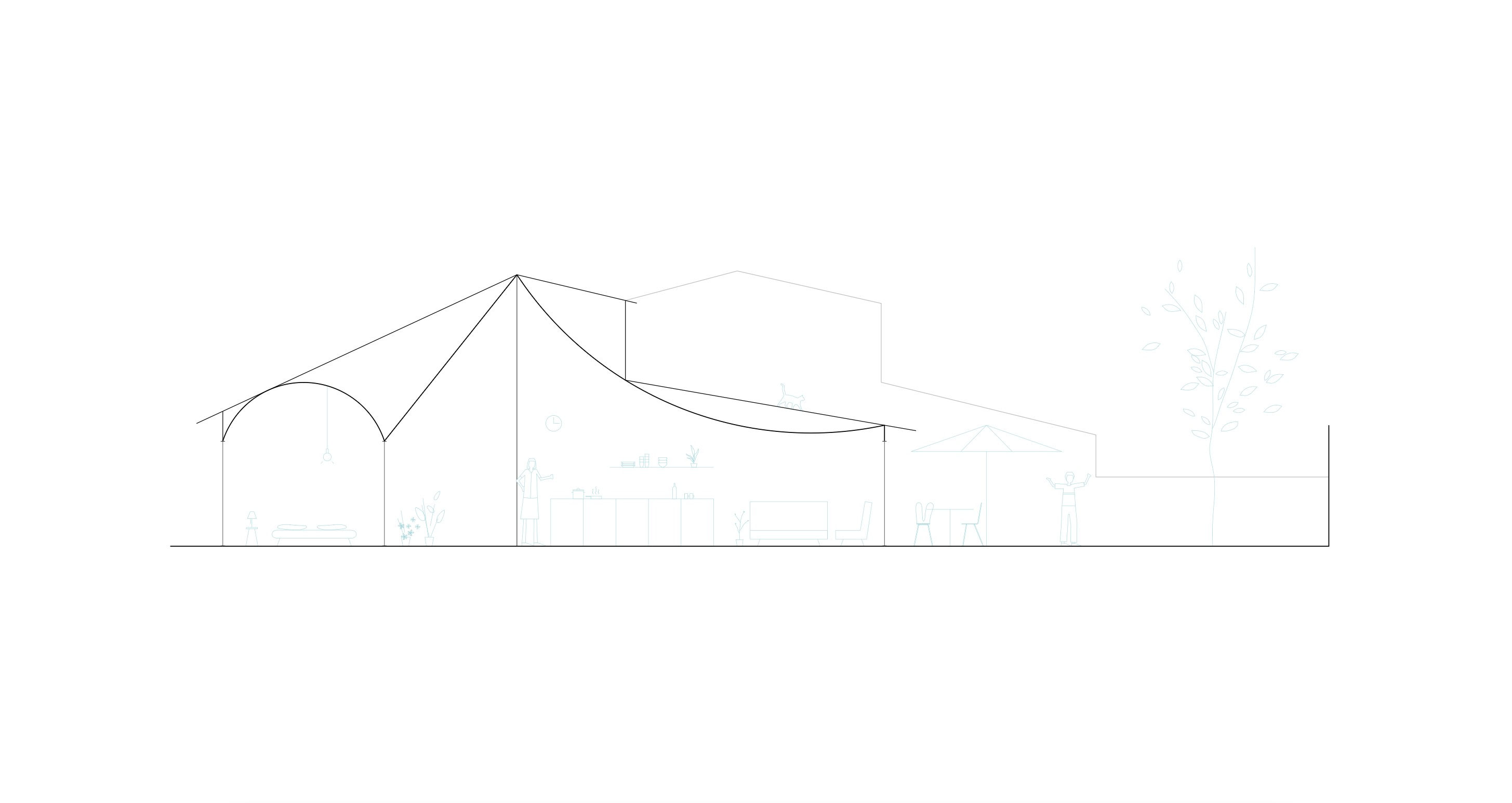 Open to the back garden, the living room unfolds between the two surfaces. Below, is a turquoise carpet of ceramic tiles, while above, a light green tent of vigorous ceiling—all concealed beneath a slender metal roof.