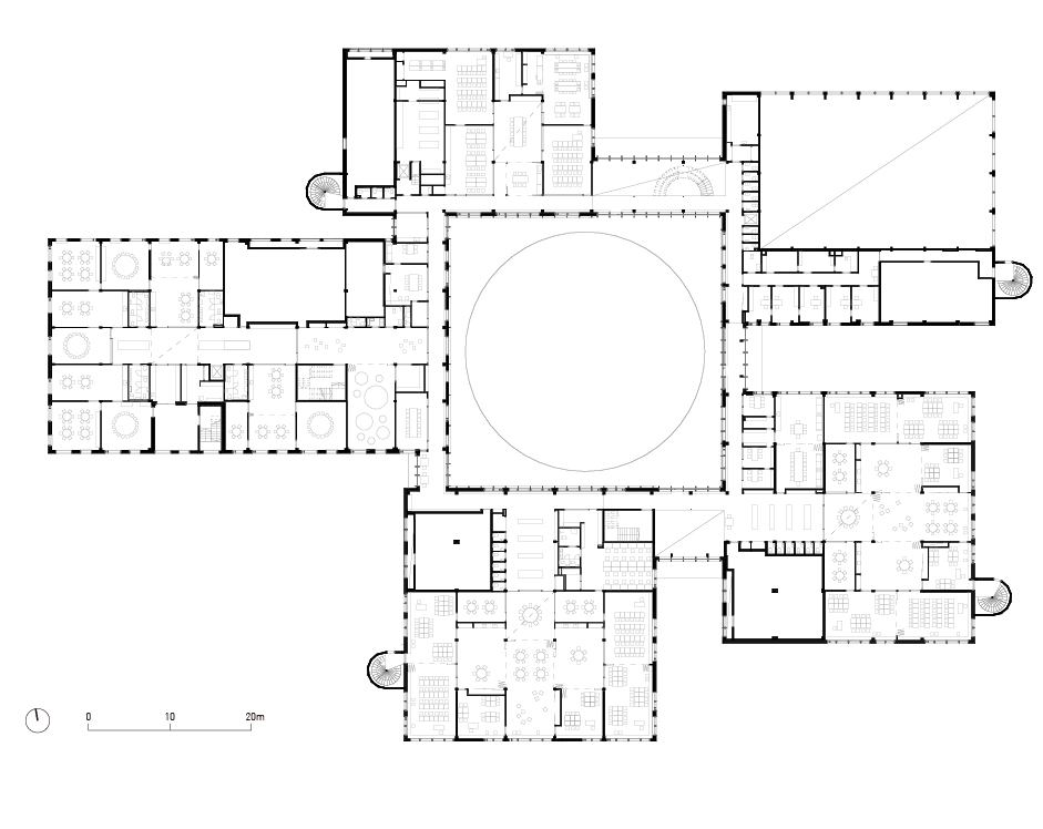 Designed from a learner’s perspective, the school offers a green and flexible environment that promotes well-being, concentration, and creativity. The distinct building blocks, connected by central common areas, create a framework for a human-scale learning environment where learners can easily navigate, meet, and learn from one another. The efficient layout ensures that all functions are within a short distance of the central space and entrances. Each blocks has its own unique character, housing learning spaces, canteen, sports hall, science and art facilities, and kindergarten. The multifunctional building also serves as a community center for local residents during evenings and weekends. Adaptable learning spaces, with movable partitions, can be reconfigured to suit different activities and easily adjusted to meet the learners’ needs. Local wood and natural materials enhance the connection to nature, creating an inviting, calm environment where all learners feel at home.