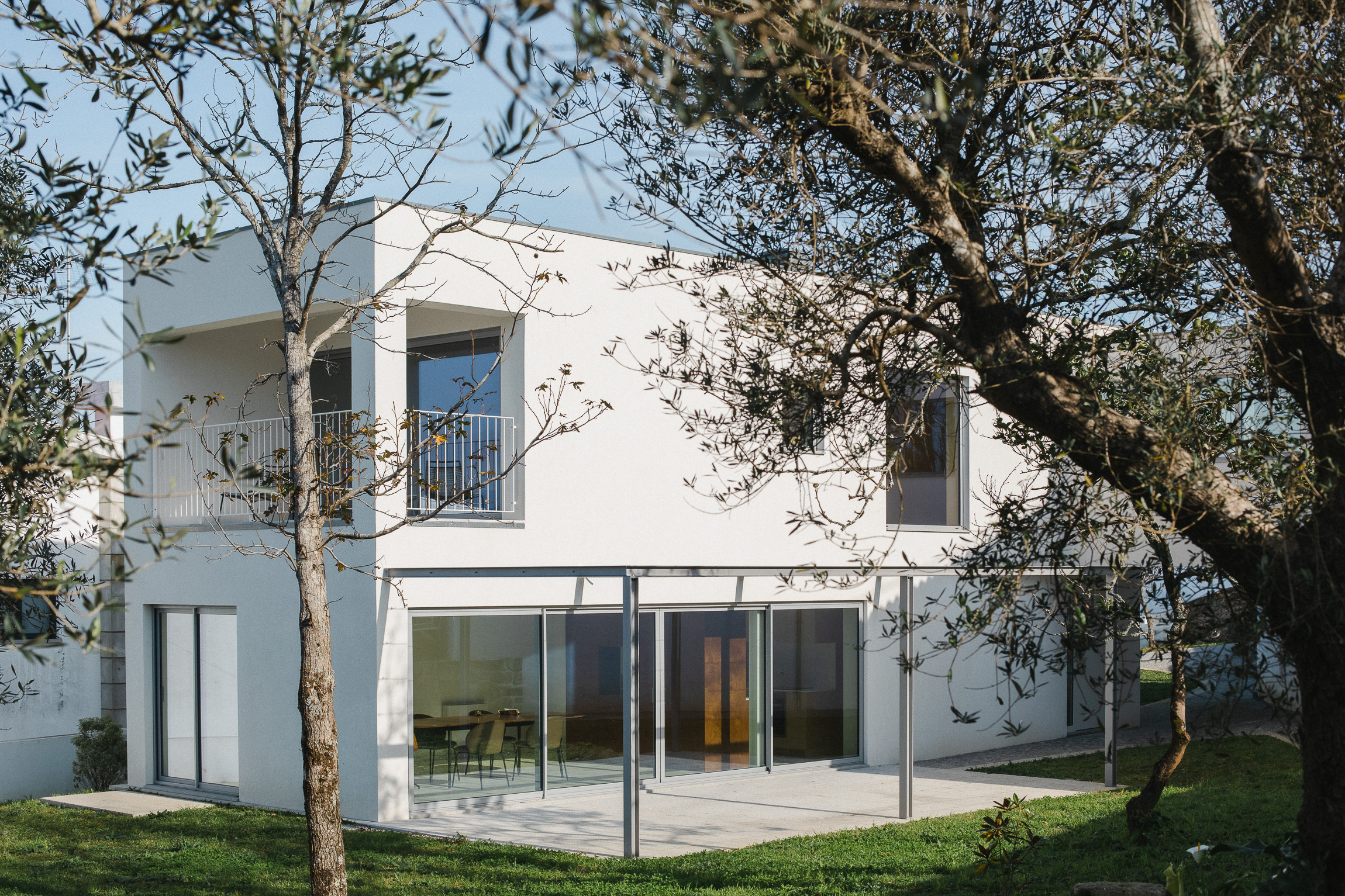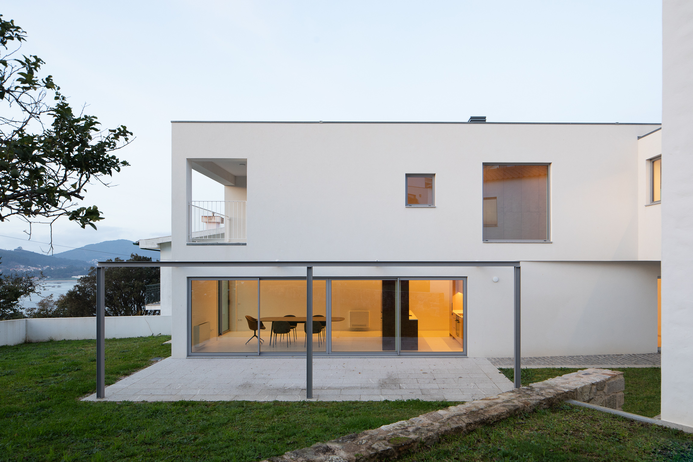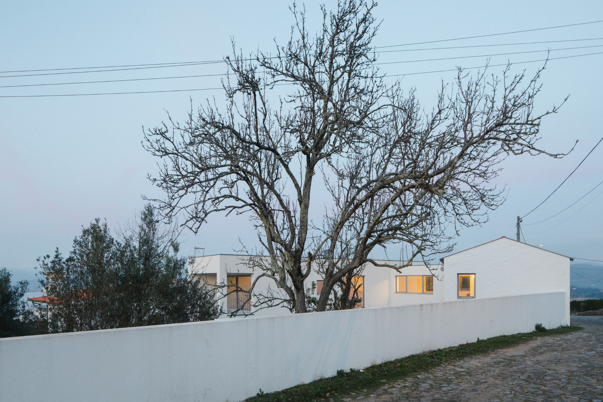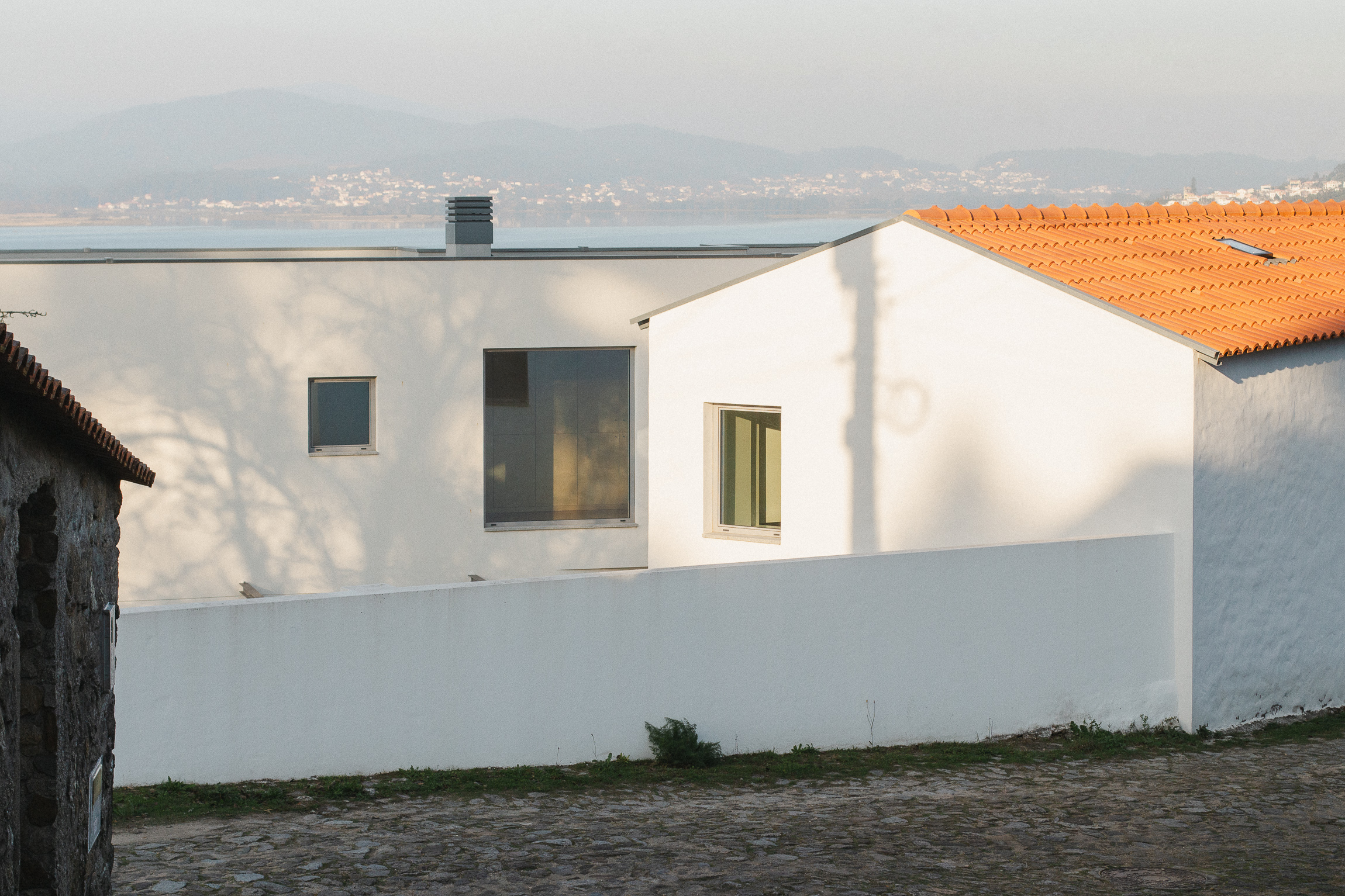 The presence of the Sinal in dialogue with the existing building and the landscape intensity determined the principles of the project. The pre-existing building in plastered and painted stone masonry, with a gable roof, is connected to a new volume that arises from intersecting alignments between façades and directing views from the interior to the distant landscape. The new volume, shaped and lightened by the voids in the white façade, is interrupted to the North by the narrow balcony, and to the West by the balcony that overlooks the river mouth and the road. Communication between the two volumes is made through a bridge under which the entrance to the house is located. Inside, the birch wood on the marble cement floor defines the spaces, from the entrance to the kitchen, like a box that guides us through the house and belongs to the two floors, incorporating built-in furniture. Complementing the kitchen and in contrast with the birch, the mahogany cabinet is a massive body interrupted by a void that lets the cook peek through. It also provides storage for the dining room, which extends toward the granite threshing floor, soon to be shaded by vegetation hanging from the pergola.