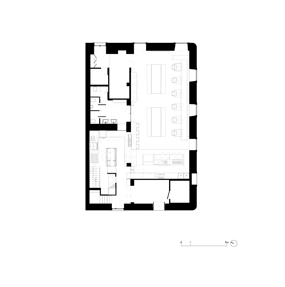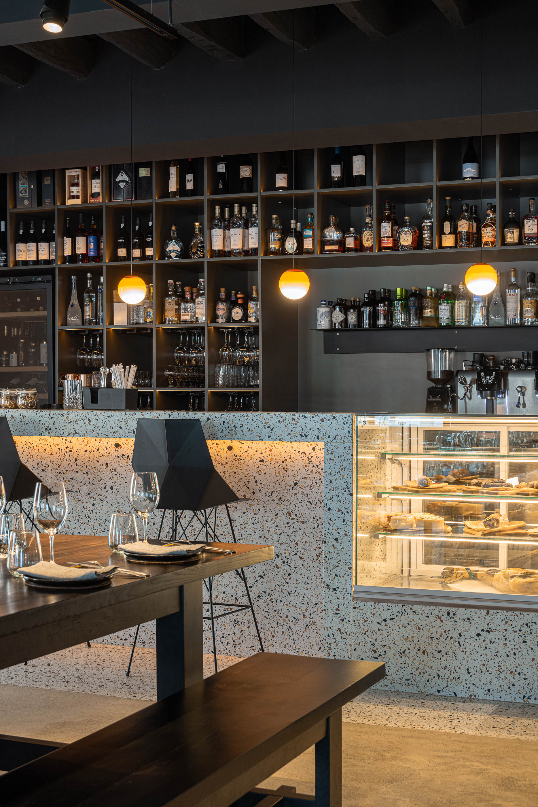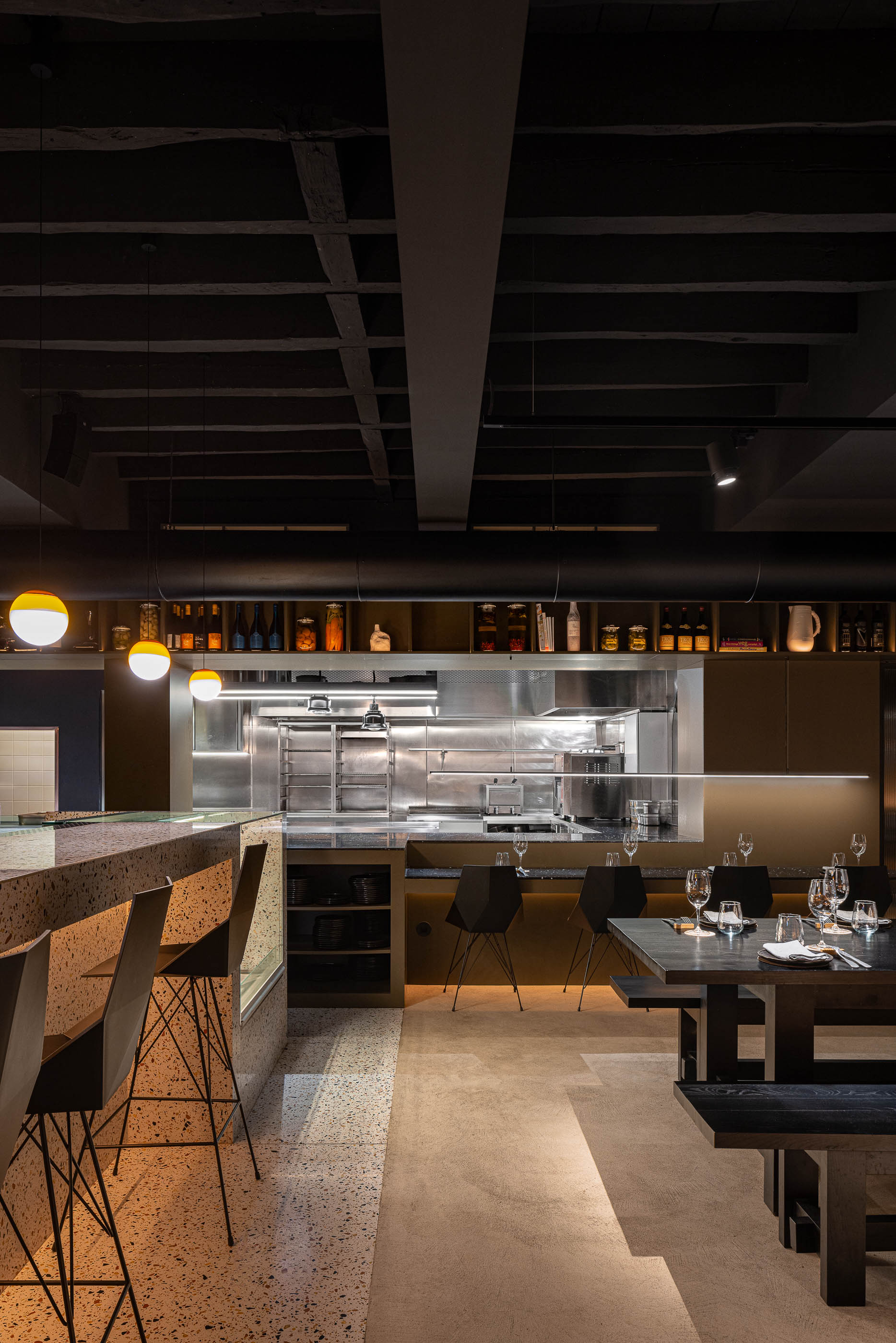 The open kitchen is a central element of the intervention. It is in constant visual contact with the dining room, allowing customers to observe the entire dish preparation process. This transparency highlights the culinary craftsmanship and creates a direct connection between the chef and the customers, with no secrets and with the intention of reinforcing the idea of sharing and familiarity.