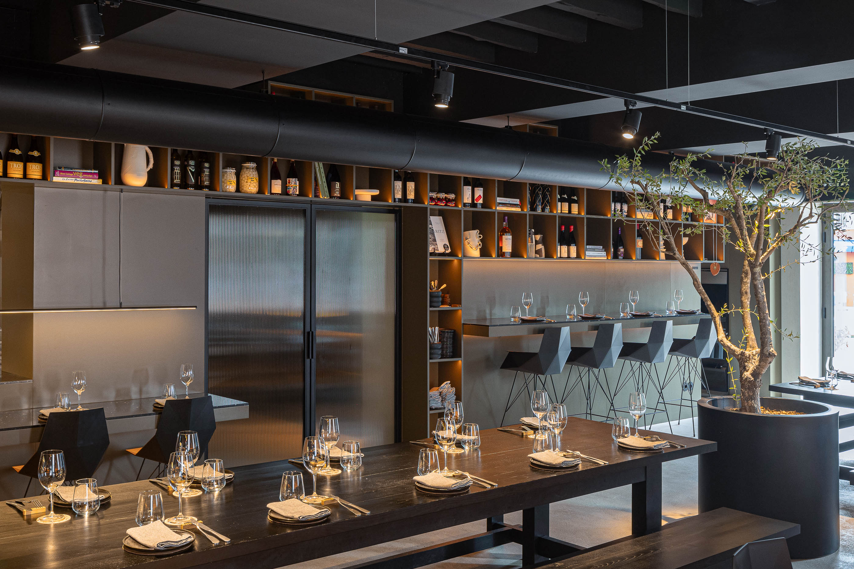 Recently, under new management, it was decided to refurbish and adapt this space to a new contemporary reality, giving it a renewed identity that marks the beginning of a new era. Developed in close communication with the new chef, the ambition was to create a visual and functional identity that was comprehensive, permeating everything from the kitchen to the overall atmosphere of the restaurant, with the intention of providing a holistic and hedonistic experience to customers. We chose to create an intimate space, with earthy colors and warm lighting, evoking a sense of relaxation, comfort, and familiarity.
