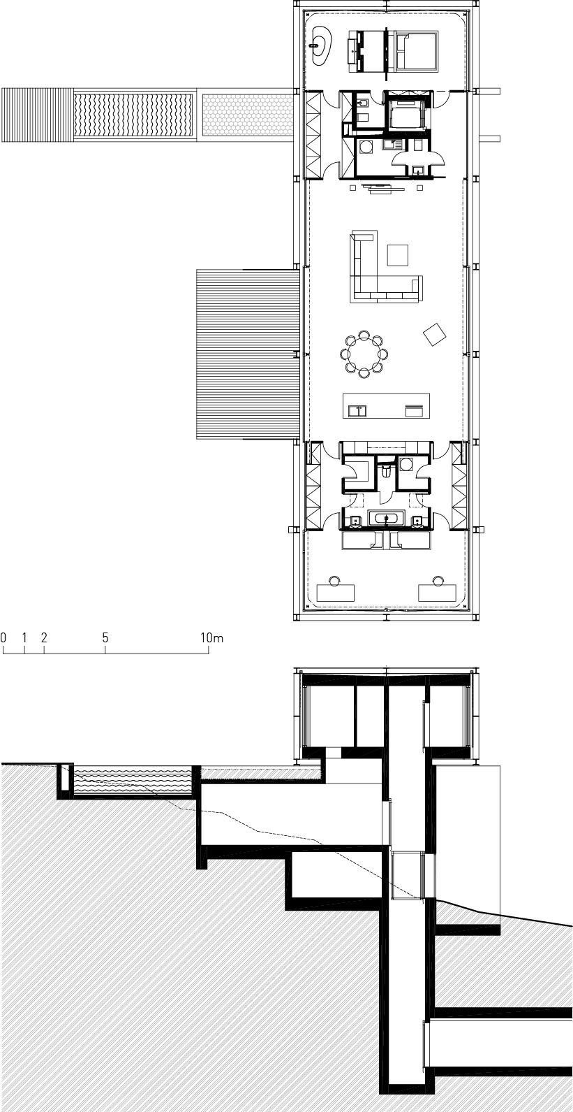 The building is entered via an underground tunnel from the garage, where one will also find a studio and a fitness area. The tunnel leads to the foot of one of the pillars, where an elevator takes residents to the residential level, passing an intermediate stop with access to the service room. The home’s heart is a cozy living room with a kitchen and dining area. From here, one can access the south-facing terrace, which connects the house with the vegetated terrain and the sunny upper part of the garden with a swimming pool. The protruding parts of the “bridge” contain two different worlds: the world of children’s rooms on one end and the primary bedroom with bath and views on the other.