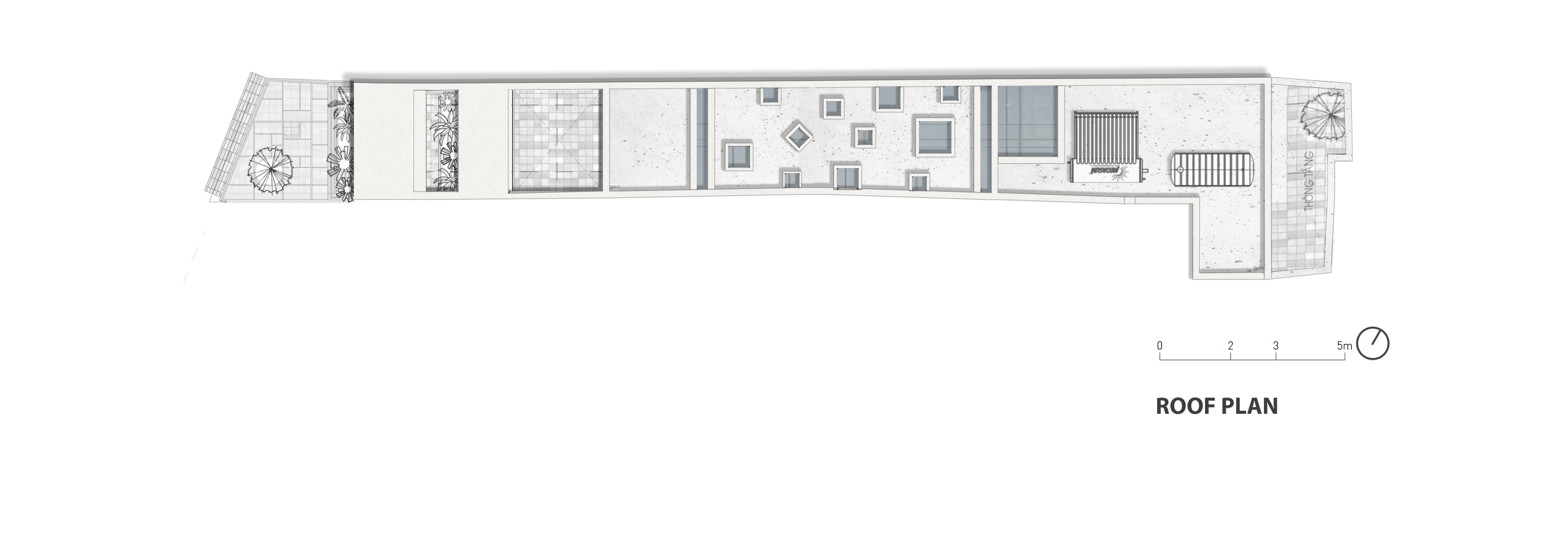 Developed from the sloping roof form of the traditional house, the facade of the building is a sloping concrete roof from the roof down to the 2nd floor with some cut-out for ventilation. It makes the facade of the house simple but unique, combined with green trees to create a buffer layer to prevent heat radiation from the west and increase privacy for the homeowner.