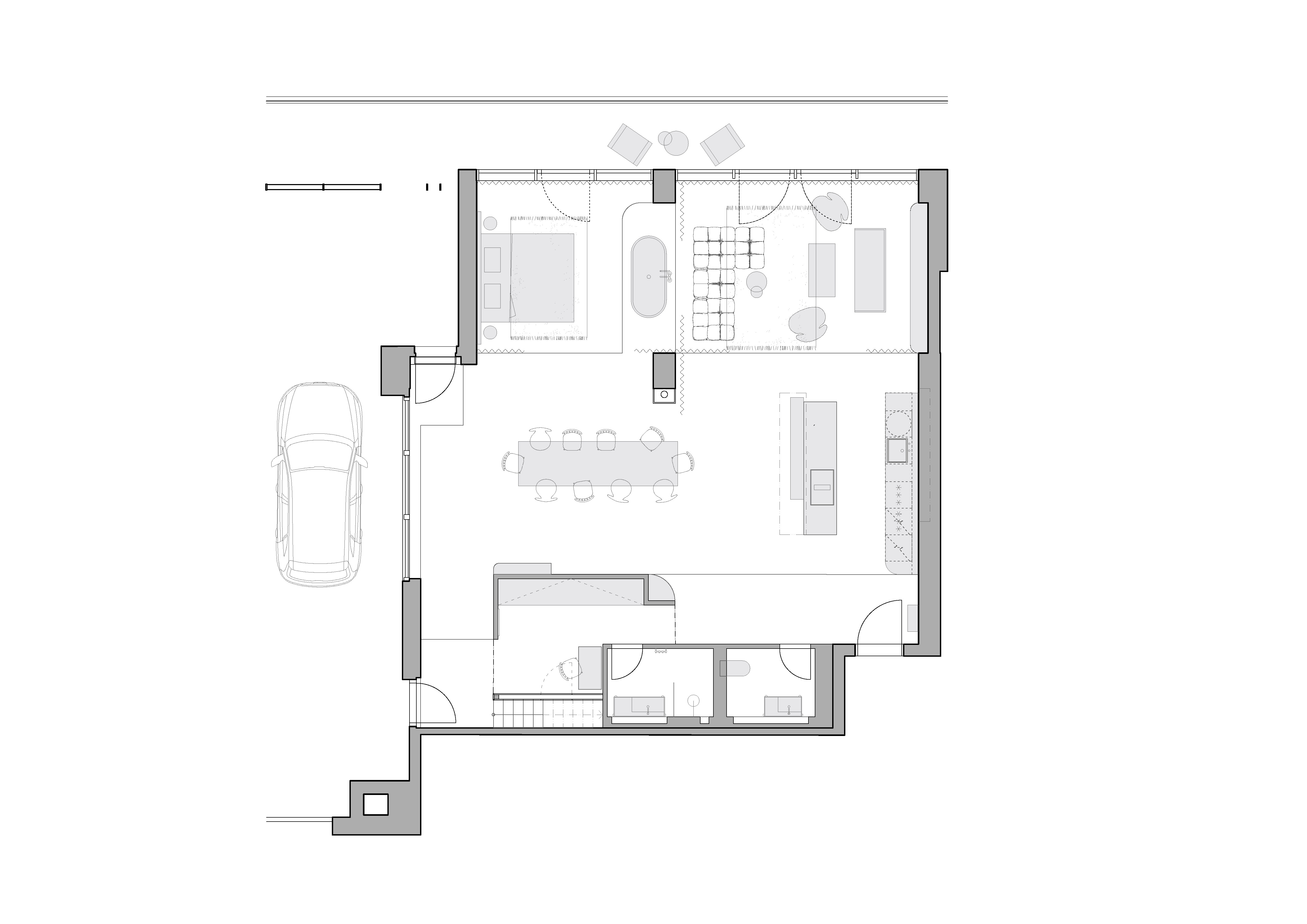 The heart of this space is the expansive central living area. It aligns along a central axis, housing a kitchen with a bar island, a spacious dining/conference table, and a retractable projection screen that conceals the panoramic strip windows, offering a view of the covered parking garage (an area dear to the car collector he is).
