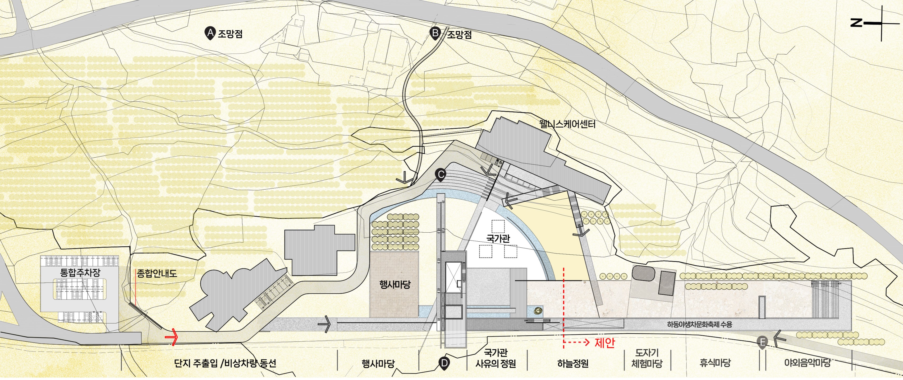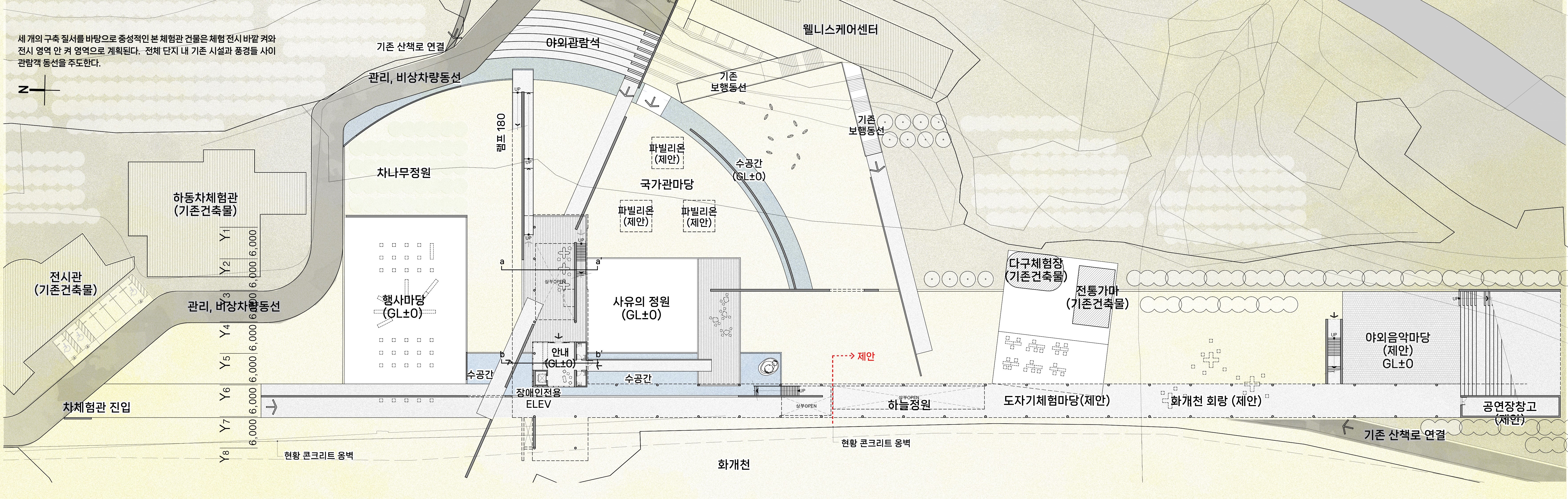 관음봉과 촛대봉사이 자연축과 진입과 화개천의남북축, 각 시설과의 연결축 세개의 질서를 구축하고 이로서 생기는 6개의 영역이 서로 다른 땅의 조형으로 귀결된다. 그 영역들은 행사마당 / 야외 공연마당 / 국가관마당 / 체험마당등 다양한 영역으로 확장된다.