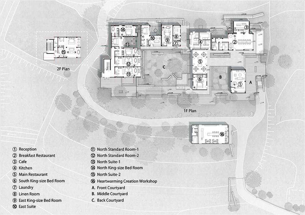 Based on the original building layout, integrate the scattered roofs and, taking functional needs into account, delineate the functional zones, ultimately forming a three-courtyard layout that unfolds around the trees.