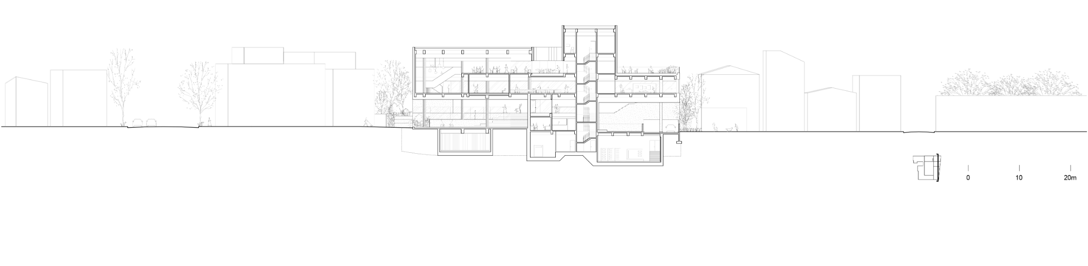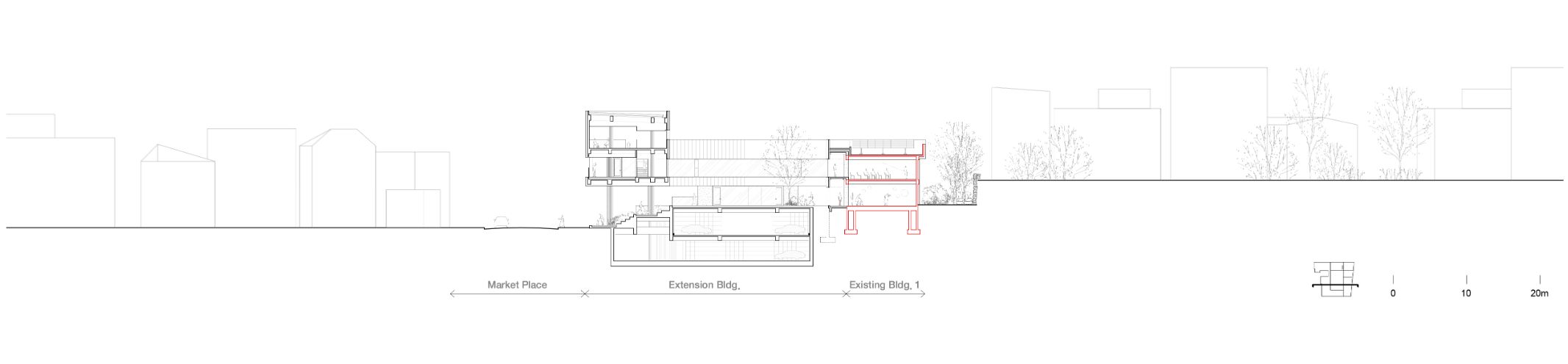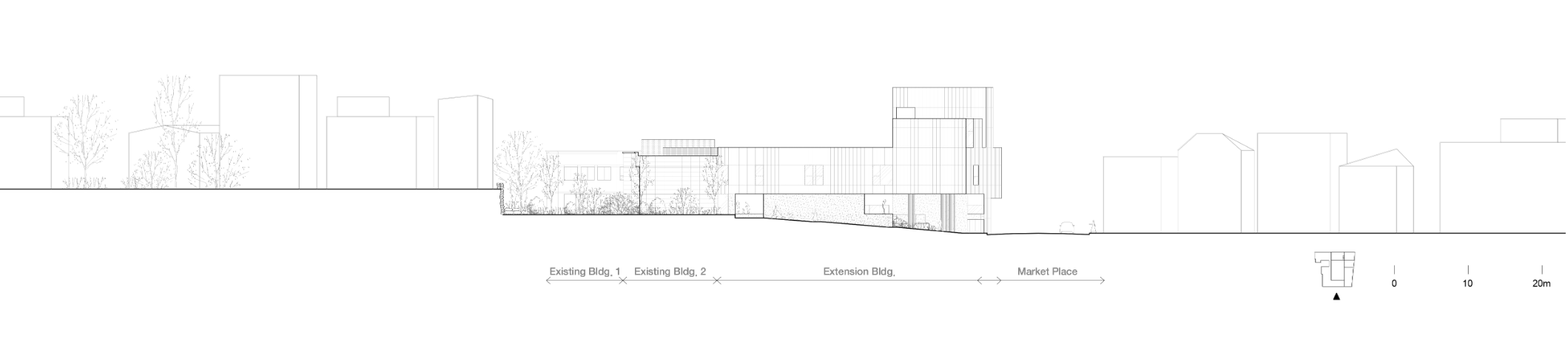 대지와 맞닿아 있는 도로인 금정로가 보여주는 특수성과 일상성, 차이와 공공성에 상응하는 이중적 경계면 설정이 어울림센터 설계의 중요한 출발점이 되었다. 건축은 도시의 일부이며 전체를 닮아 있다. 부지는 주민들이 20년 넘게 이용해 온 등기소와 법원 건물이 위치하고 있으며, 도로변과 2.7m의 단차가 있었다. 기존의 등기소와 법원 건물, 대지의 단차는 그대로 유지된 채 도로변 대부분을 비워 넓은 계단 광장을 조성하여 금정로와 연결했다. 주변 건물들과 대비되는 스케일의 팽팽한 면을 가로와 평행하게 배치하여 가로의 흐름과 공간을 드러내고, 오일장의 배경이 되도록 한다. 금촌어울림센터는 설계공모 당선 이후 민간과 군인의 복합커뮤니티 시설에서 도시재생시설로 프로그램의 성격과 구성이 전면 변경되었다. 어린이, 청소년, 청년, 군인의 교육, 문화, 복지, 창업 등을 위한 7개 부서 13개 팀이 운영하는 센터는 복합적인 시설 이용자를 통합하고, 각자 활용이 가능한 공간 구성을 필요로 한다. 사방으로 열리고 이어지는 다공질의 마당은 어울림센터에 전용되거나 도시에 일방적으로 귀속되지 않으며, 서로 다른 이들을 허용하고 교류하게 하는 공공적 커뮤니티 장소가 되었다. 공간은 필요의 정도와 쓰임의 밀도에 유기적으로 대응하며, 다양한 요구와 변화를 담아내는 공간으로 기능하게 된다.