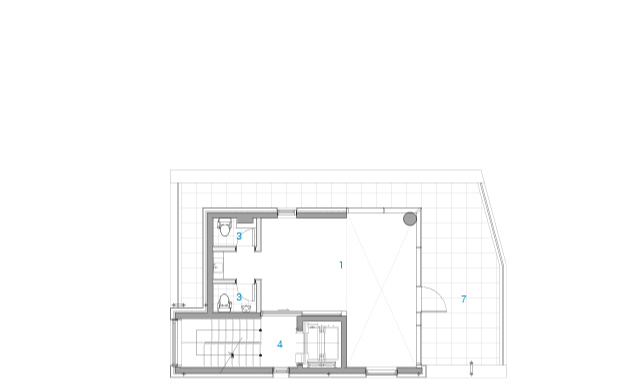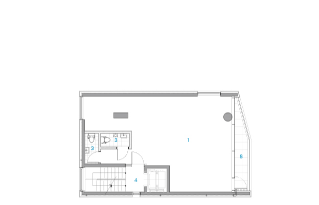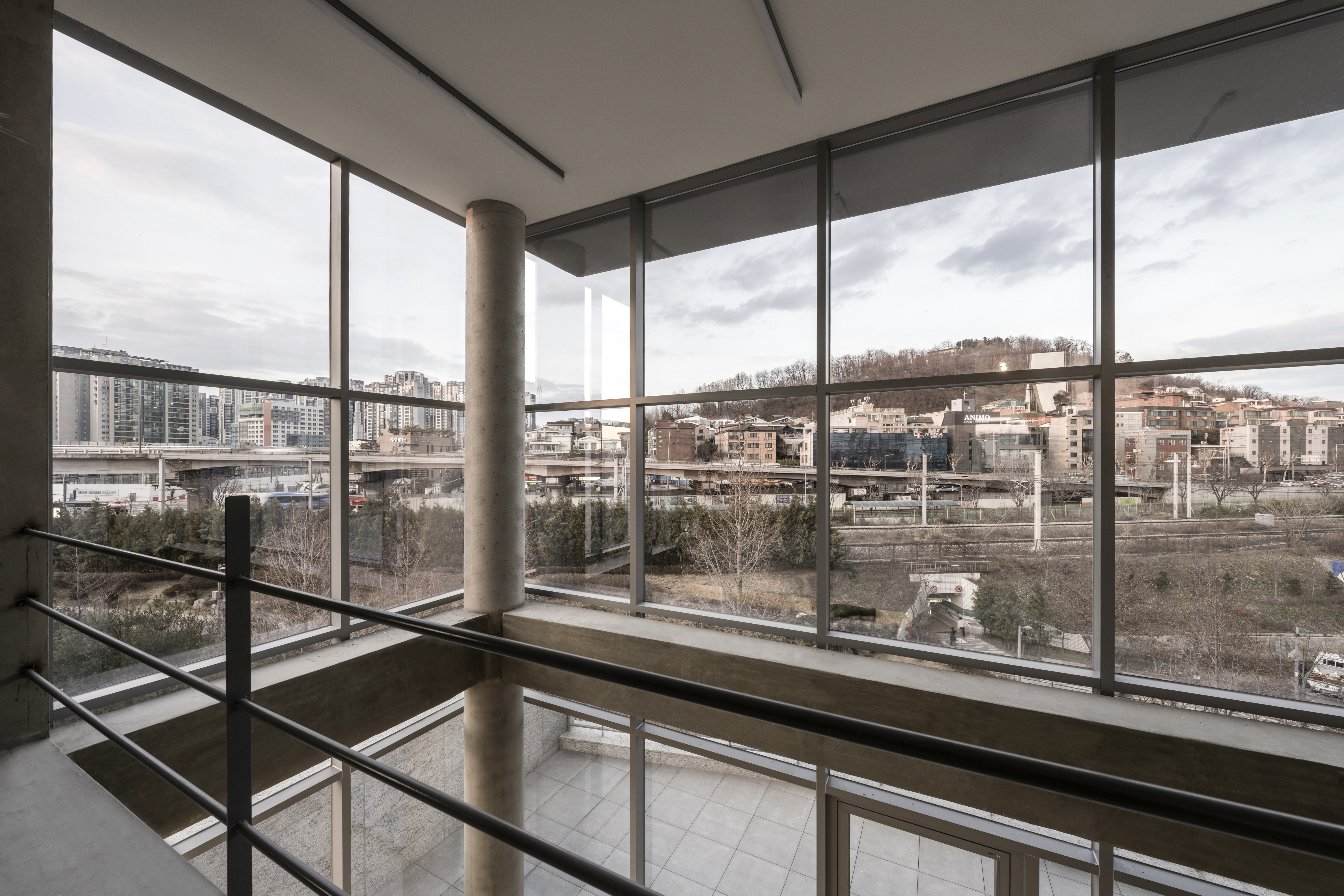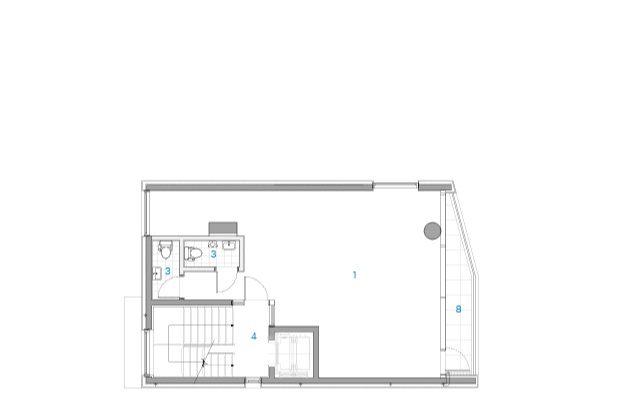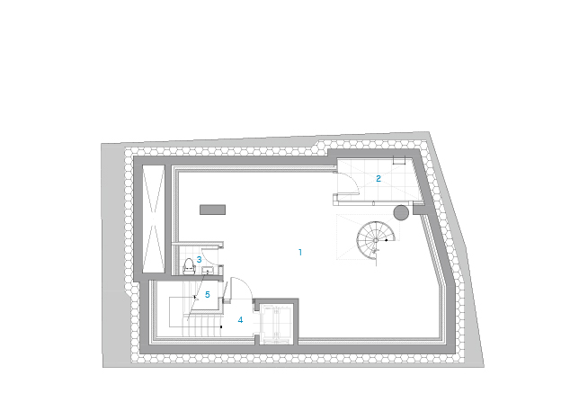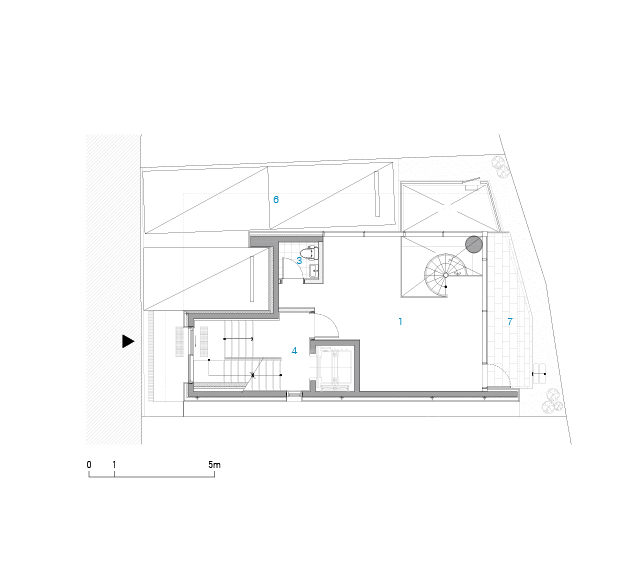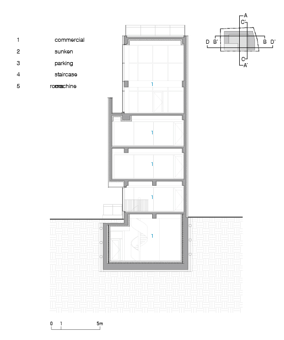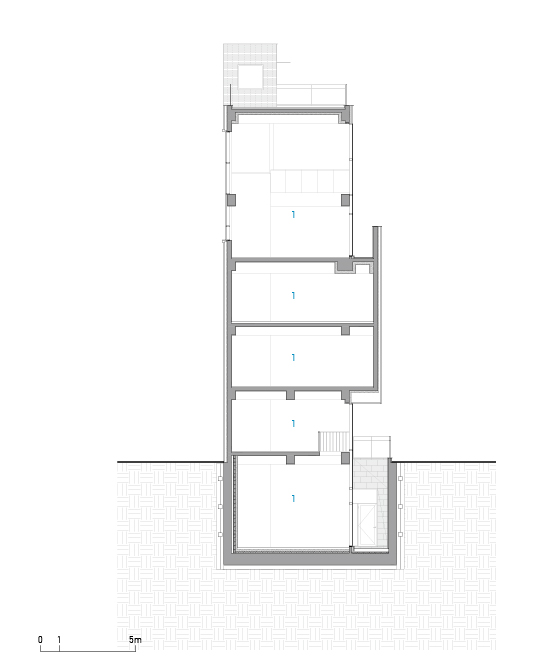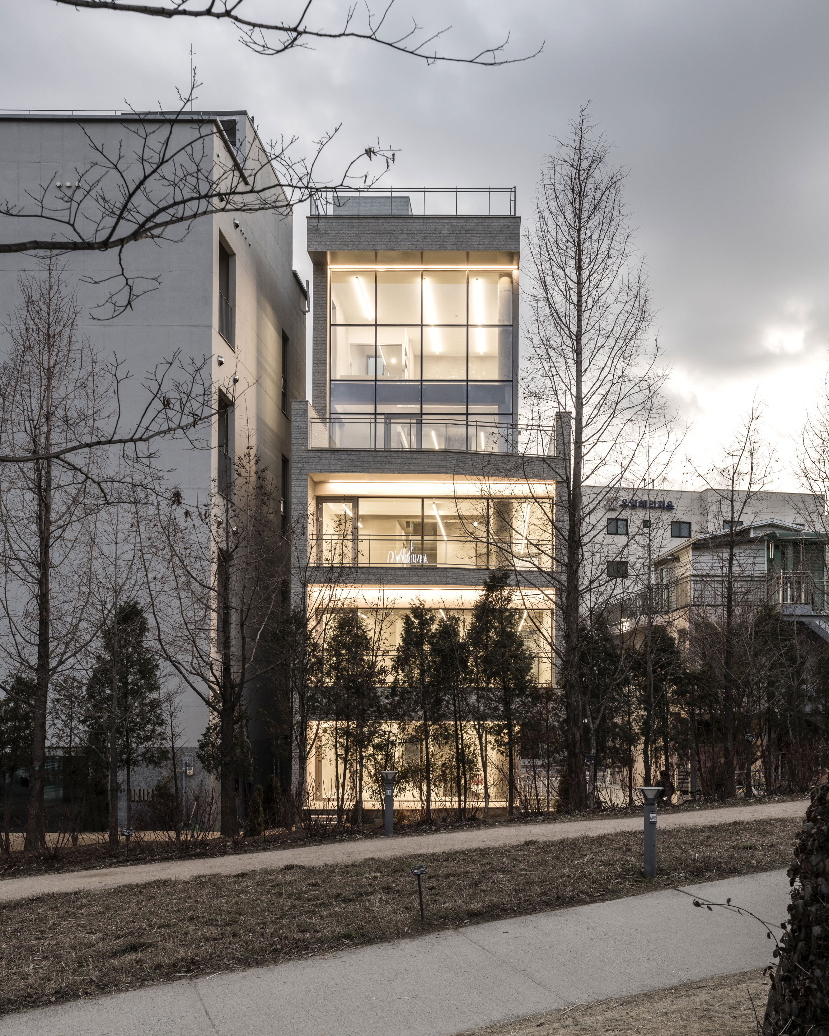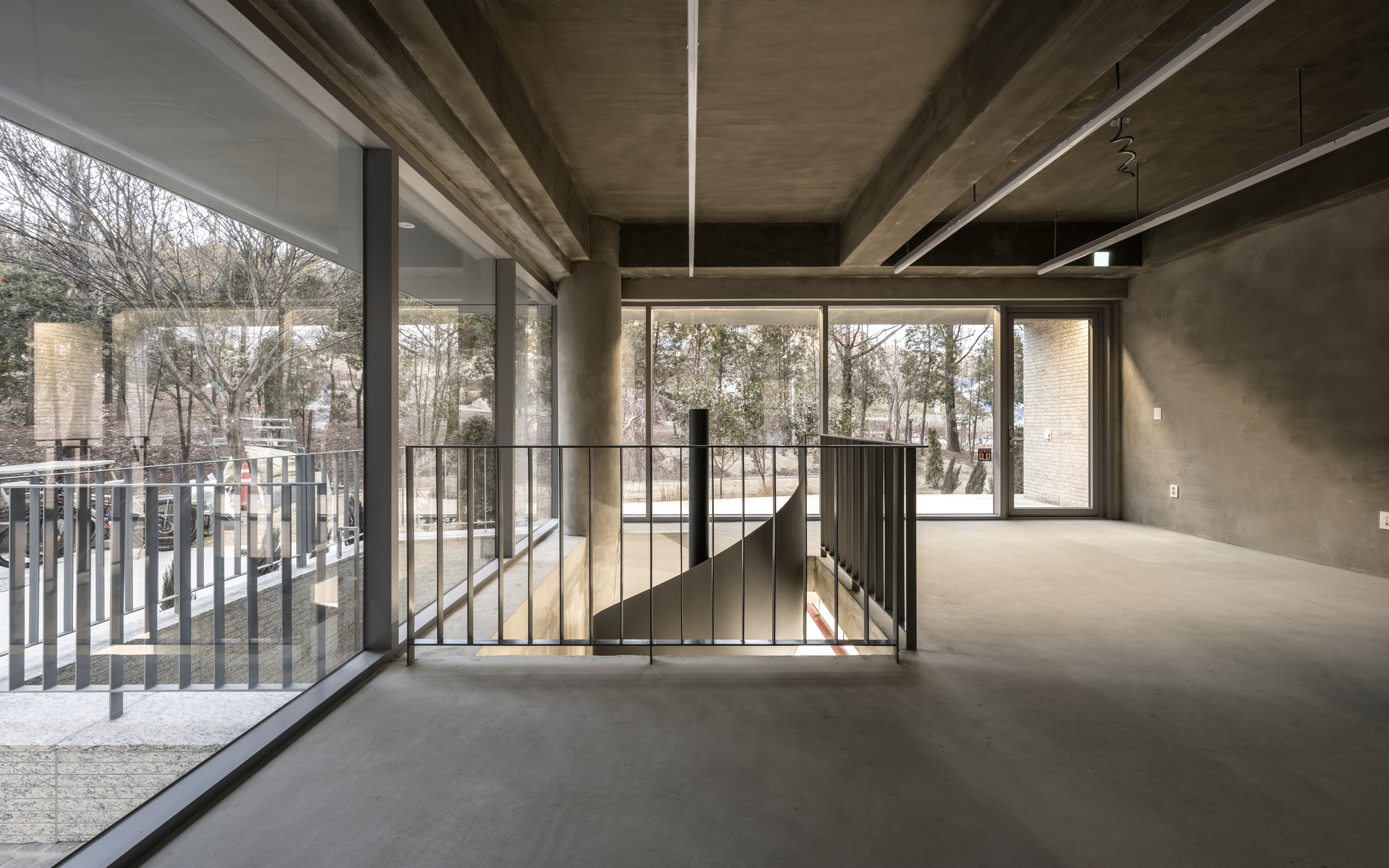대지는 경의선 숲길의 말단부에 위치하며, 전면의 20m 도로와 후면의 공원은 대비되는 콘텍스트를 갖고 있었다. 도로 측으로는 개구부를 적정량 이하로 구성하여 묵직한 양감을 부여하고, 공원 측으로는 창의 면적을 최대화하여 숲과 시지각적 교감을 만들고자 하였다. 건축물의 석재 가로 메지는 50mm마다 커팅하여 질감의 변화를 주고, 창대석과 인방은 혹두기 처리하여 묵직한 개구부의 매듭을 만들었다. 전면의 인접한 대지는 충분한 거리가 있어 일조권 제약을 받지 않아 자유롭게 공간을 구성할 수 있었다. 근린생활시설의 용도에 따라 다양한 하부 프로그램이 수용될 수 있도록 전용공간을 대공간으로 구성하였고, 각층에 외부 공간을 구성하여 자연과 자연스러운 교감의 기회를 만들었다. 경의선 숲길의 자연과 깊은 교감을 나누고 공간의 가치를 누릴 수 있을 것으로 기대한다.