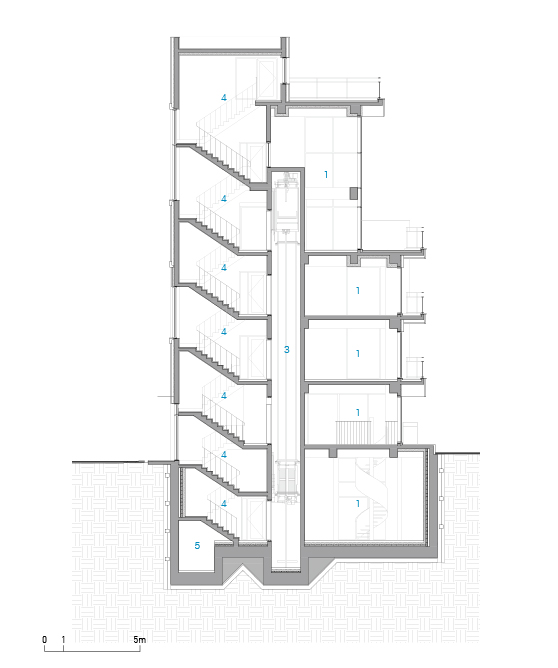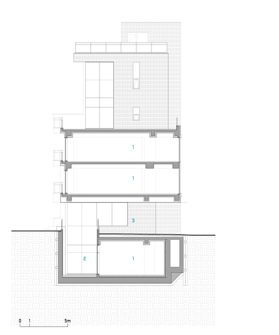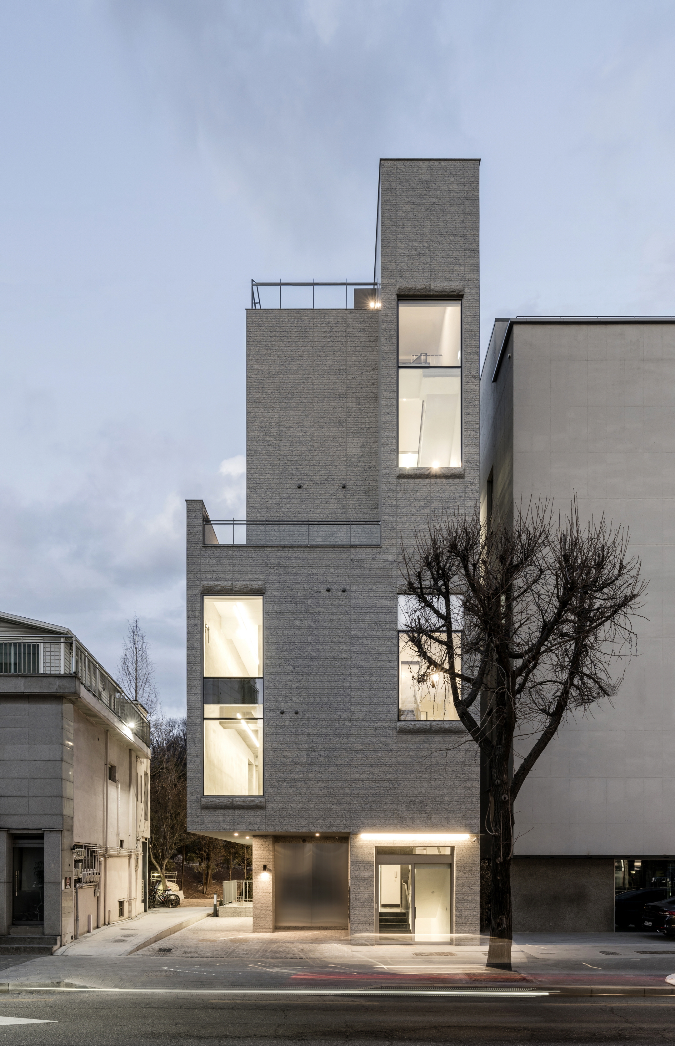 대지는 경의선 숲길의 말단부에 위치하며, 전면의 20m 도로와 후면의 공원은 대비되는 콘텍스트를 갖고 있었다. 도로 측으로는 개구부를 적정량 이하로 구성하여 묵직한 양감을 부여하고, 공원 측으로는 창의 면적을 최대화하여 숲과 시지각적 교감을 만들고자 하였다. 건축물의 석재 가로 메지는 50mm마다 커팅하여 질감의 변화를 주고, 창대석과 인방은 혹두기 처리하여 묵직한 개구부의 매듭을 만들었다. 전면의 인접한 대지는 충분한 거리가 있어 일조권 제약을 받지 않아 자유롭게 공간을 구성할 수 있었다. 근린생활시설의 용도에 따라 다양한 하부 프로그램이 수용될 수 있도록 전용공간을 대공간으로 구성하였고, 각층에 외부 공간을 구성하여 자연과 자연스러운 교감의 기회를 만들었다. 경의선 숲길의 자연과 깊은 교감을 나누고 공간의 가치를 누릴 수 있을 것으로 기대한다.