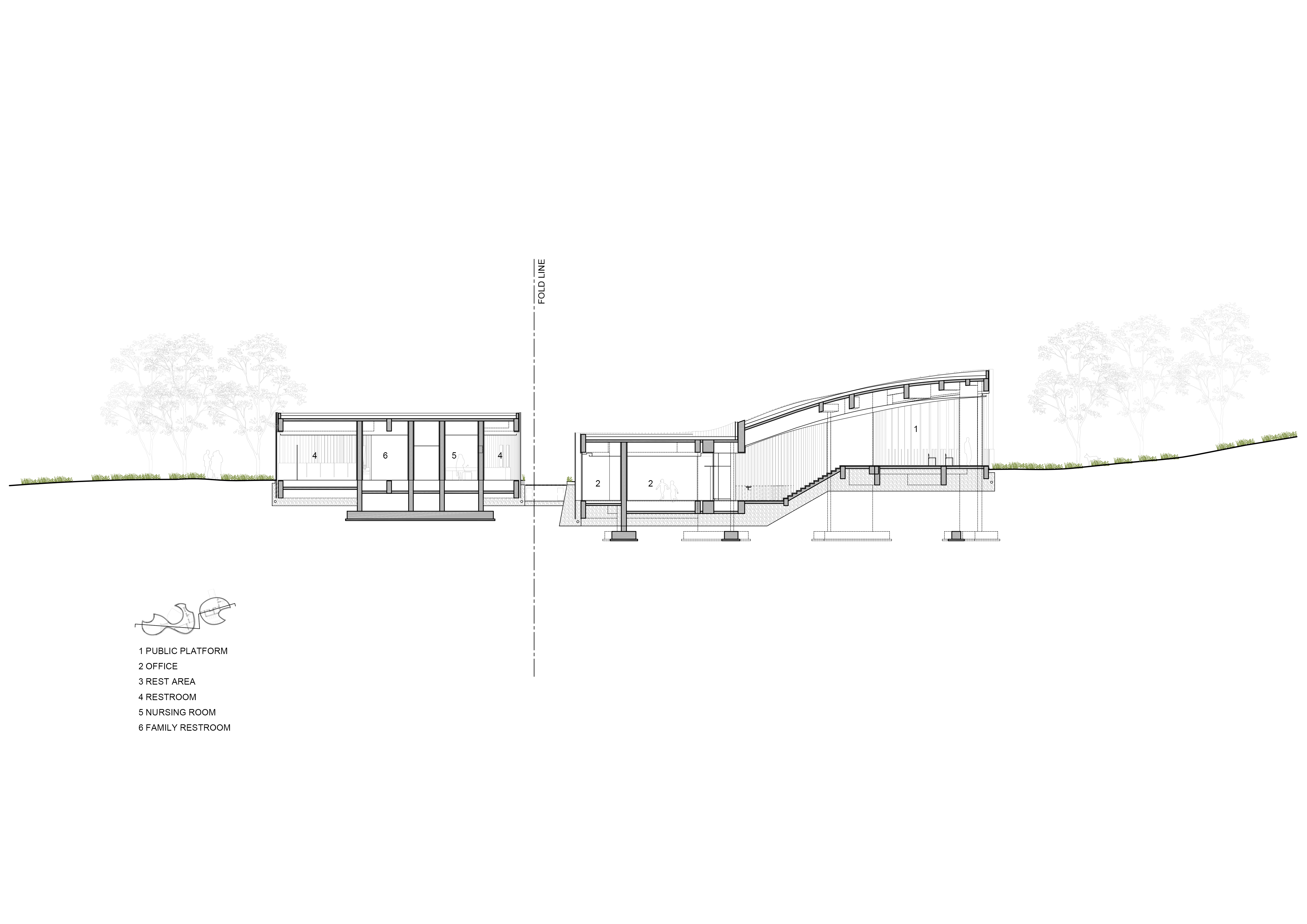 The architects proposed preserving all native trees by strategically interweaving two service buildings among them with minimal disturbance to the site. The curvilinear east building is shaped by invisible arcs centered on the trees, allowing its winding form to elegantly meander among the trunks and bushes. The west building features a series of trapezoidal structures that are either cantilevered, embedded, or placed on the ground. These structures act as “metal henges” that anchor directionality and resonate with the natural rhythm of the forest.