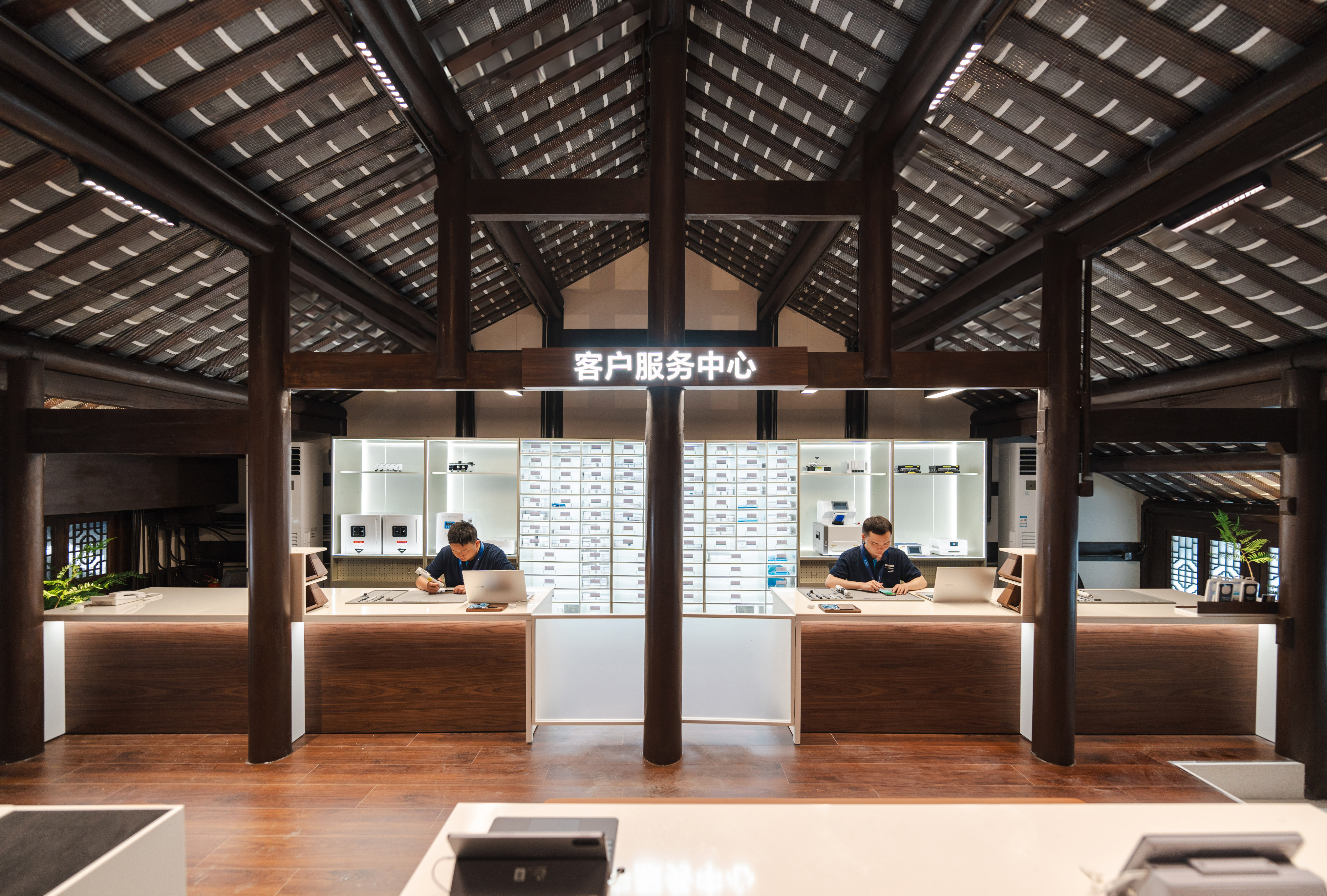 At the northernmost end of the store, a tea and coffee area merges with a workspace in a “sunlit space”. All seating areas are equipped with fast-charging stations, catering to those who need a brief stop to work, recharge, or unwind. The after-sales area features an embedded countertop, complemented by a full-length transparent display cabinet on the back wall, which, together with the clean white lighting, creates a sleek, modern ambiance. The VIP area, inspired by traditional Chinese reception halls, is arranged symmetrically with classic Chinese furnishings like yoke-back armchairs and four-immortal tables, reviving the etiquette of traditional Chinese hospitality.