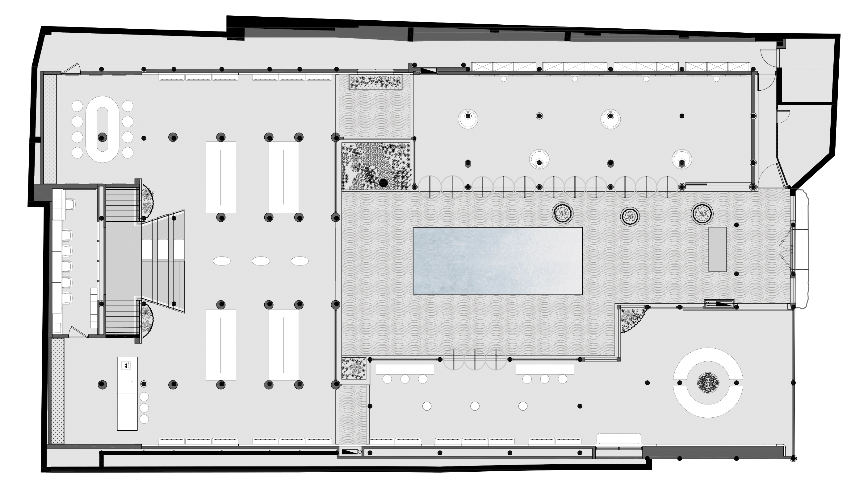 In alignment with Kuanzhai Alley’s renovation ethos—where each courtyard is given its distinctive landscape and feature, the central courtyard extends the grey tile motif from the roof to the ground, mirrored in a tranquil waterscape. The symmetrical ground design seamlessly connects the reflective waterscape with the indoor gallery. The ground is paved with tiles, arranged in a way that mimics stones with grooved patterns, with lighting hidden inside. The building’s windows and doors, featuring a blend of glass and intricate wooden carvings, striking a balance between the warmth of timber and the cool tones of tiles and bricks.