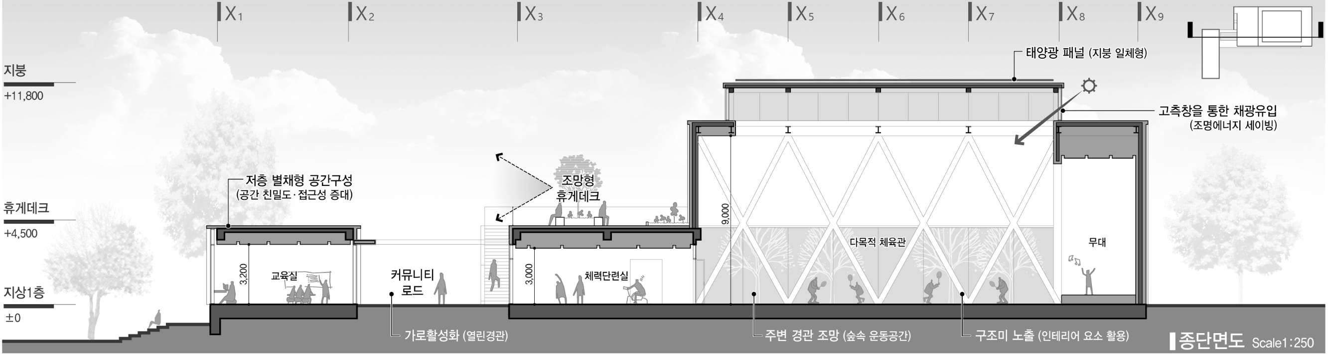 사이트 인근의 행정복지센터, 보건소, 우체국, 치안센터, 노인회관 등 주요 시설 또한 밀집되어 있지만 그들간의 연결성은 뚜렷하지 않고 여가 및 문화시설의 부족으로 지리적-문화적 거점의 가능성만을 가지고 있다. 이곳에 다목적체육관 및 교육실 프로그램을 주변 시설과 연결(Link)하여 주민들이 한데 모이는 새로운 마을의 구심점(Unity)으로 역할하고자 한다. 넓은 부지를 활용한 야외무대와 게이트볼장 및 족욕 쉼터는 문화와 행사, 건강 및 휴식의 공간으로 자연과 함께 마을의 공원으로 역할하며 주민들의 커뮤니티를 결집 및 확장시킬 것이다.