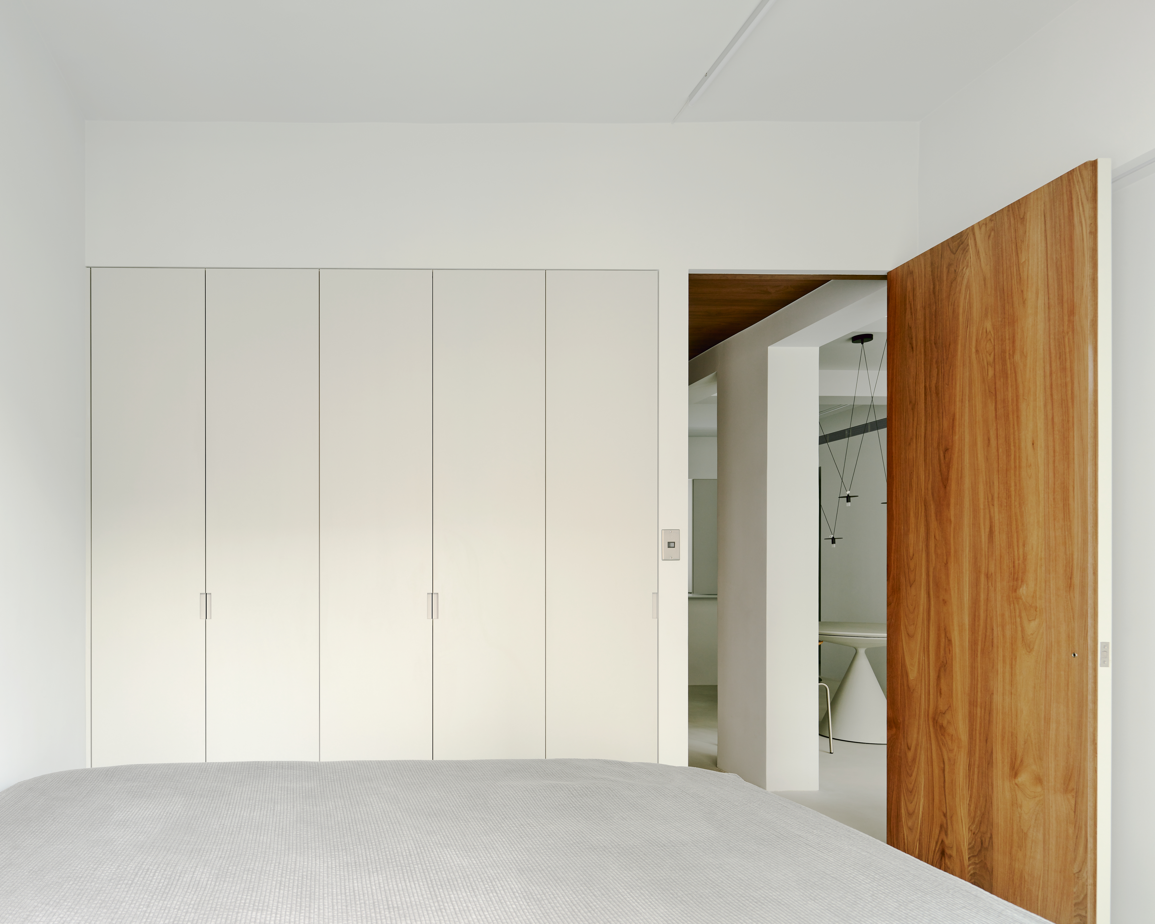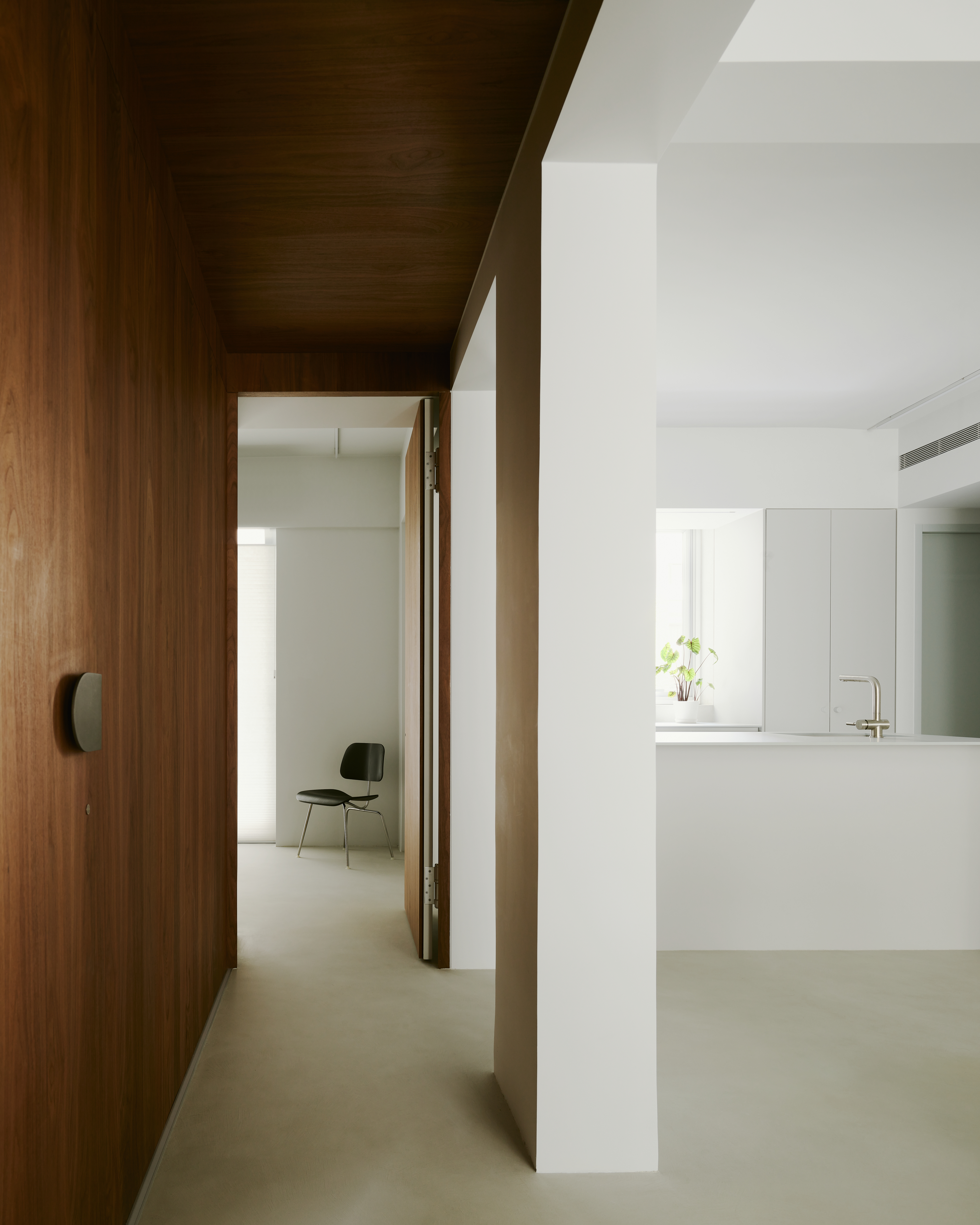 The ceiling and elevation of the bedroom corridor area are finished with a walnut wood veneer to reduce the coldness of the space. We intentionally concealed the bedroom and bathroom doors in the wall to hint at the private attributes of this area. The two bedrooms are placed at the left and right ends of the corridor area to include the guest bath space. The consistent warm tone elevation contrasts with the gray space to highlight the permeability of the spatial structure and the relationship between beams and columns.