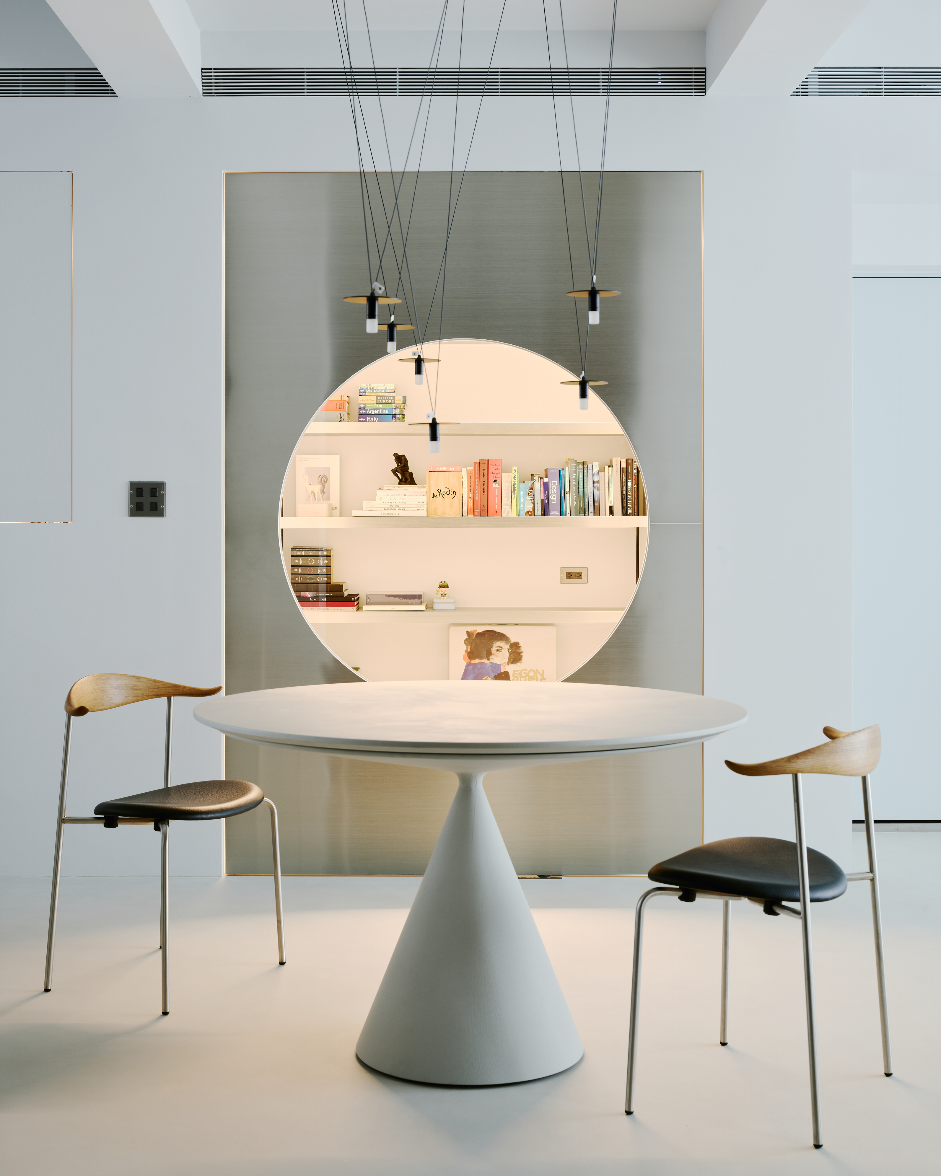 The study room with a stainless steel finished revolving door, was deliberately widened to cope with the symmetrical frame of the cloister columns., A door piece was added with a round moon window to achieve the effect of extending the line of sight from the inside of the room out. The stainless steel finish panel helps diffuse the light but maintains the brightness of the interior space.