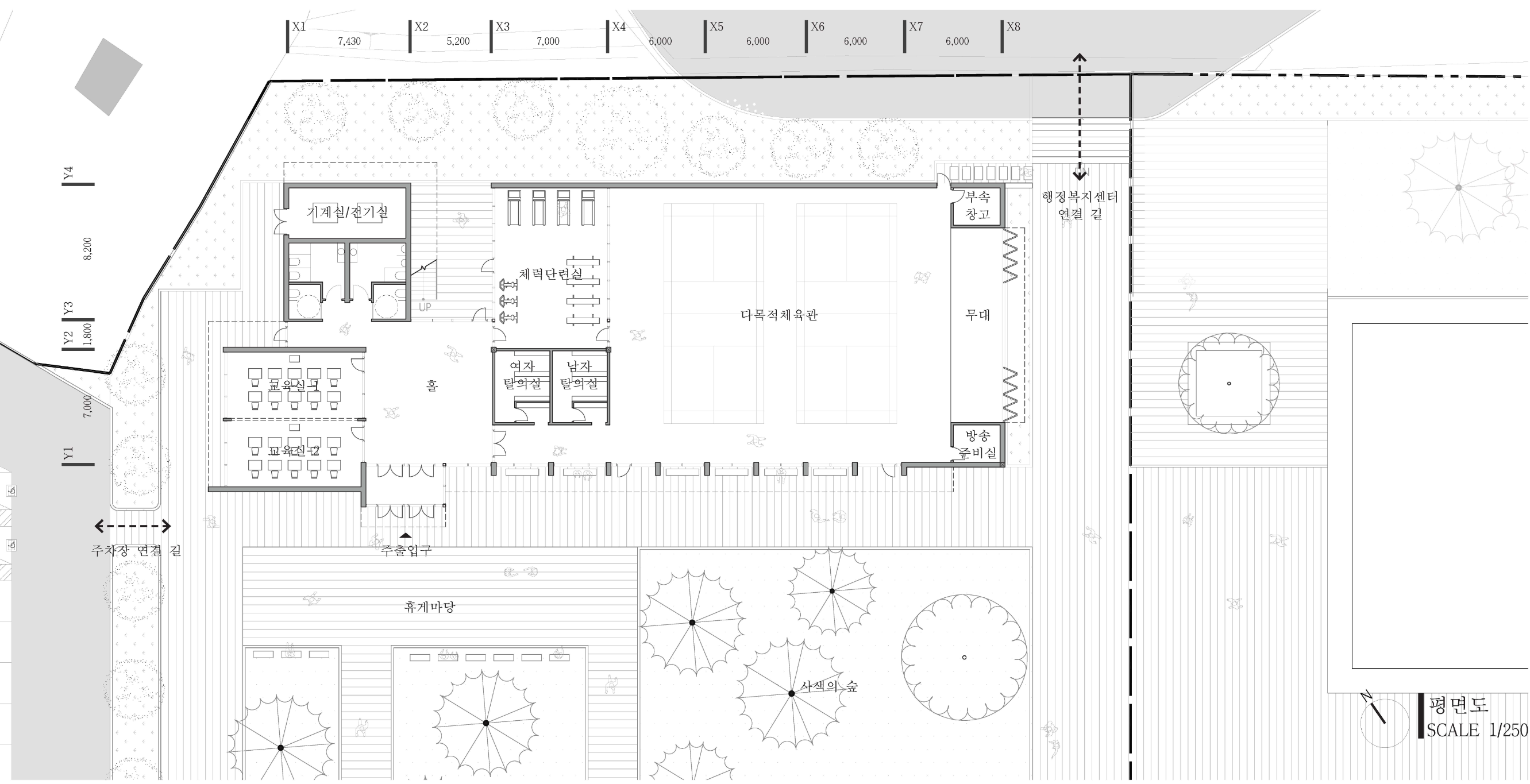 넓지 않은 전면 보행로에서 체육관의 형태가 위압적이지 않게 주민들에게 다가갈 수 있도록 석탑을 쌓듯이 수평의 선을 쌓아 형태를 분절하였다. 역사문화도시 부여의 단아한 모습을 드러내기 위해 저층부는 외벽재료로 석재를 사용하고, 주민들이 잠시 쉬어 보호수목 정원을 바라보며 쉴 수 있게 목재의 회랑을 제안한다.