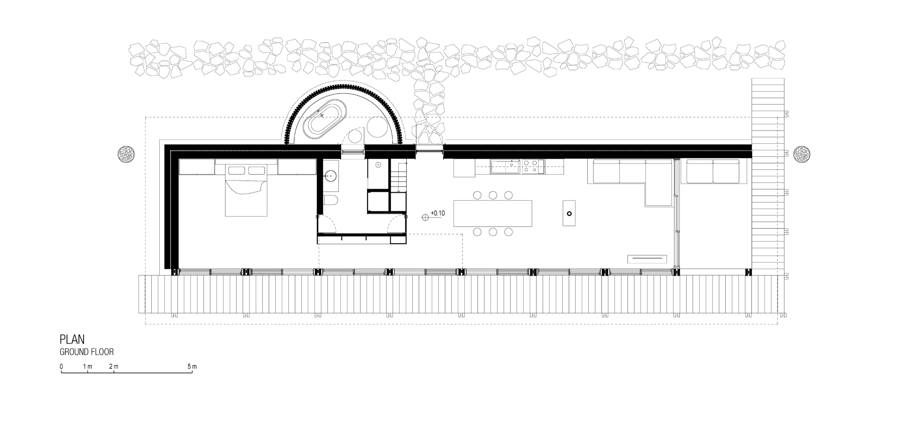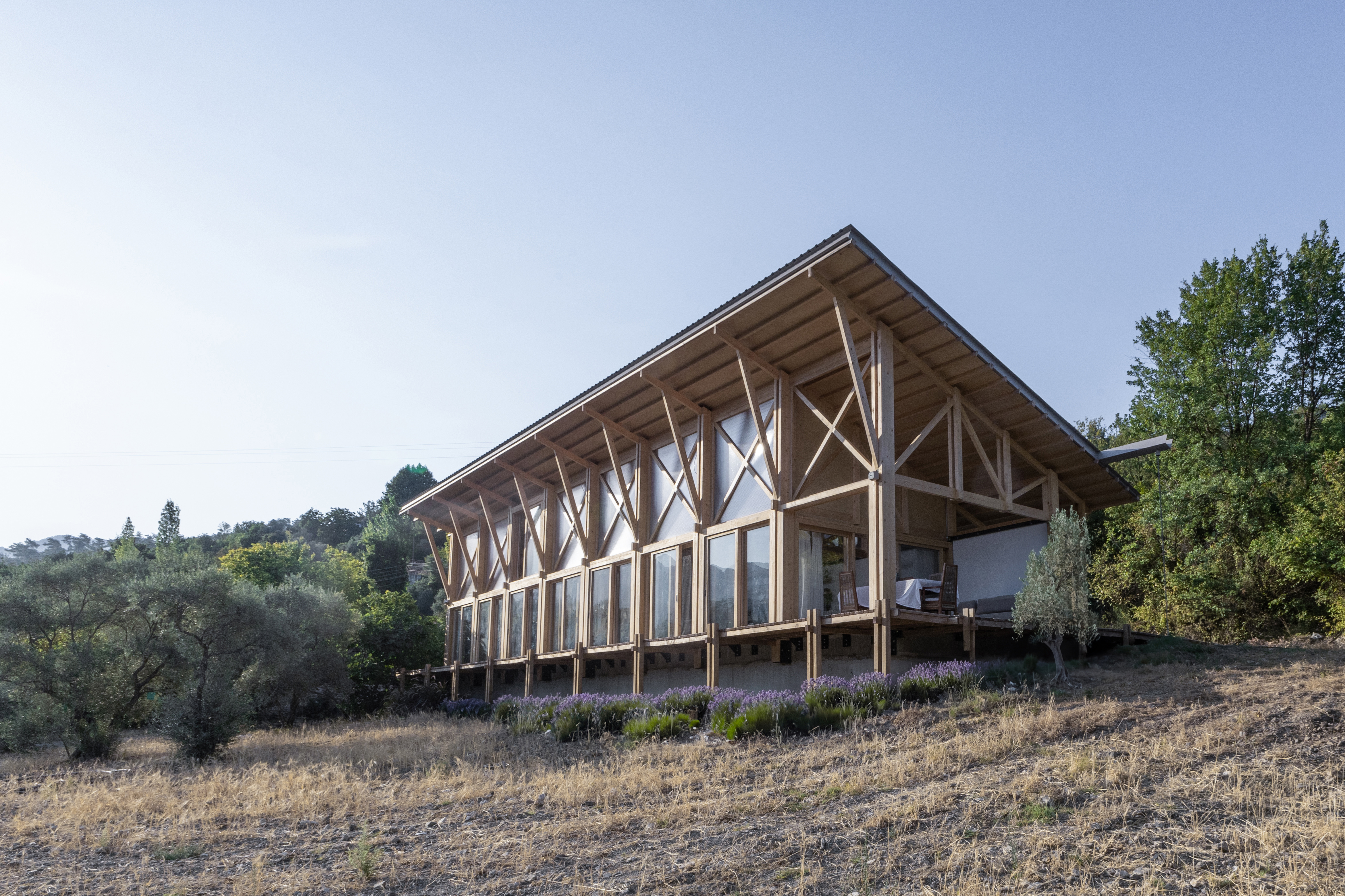 This house is a modern interpretation of Mediterranean architectural traditions, skillfully blending a timber structure with reclaimed stone walls to create a residence that is both visually striking and environmentally responsible. The contrasting façades are a deliberate response to the local climate, providing comfort, energy efficiency, and a strong connection to the surrounding landscape.