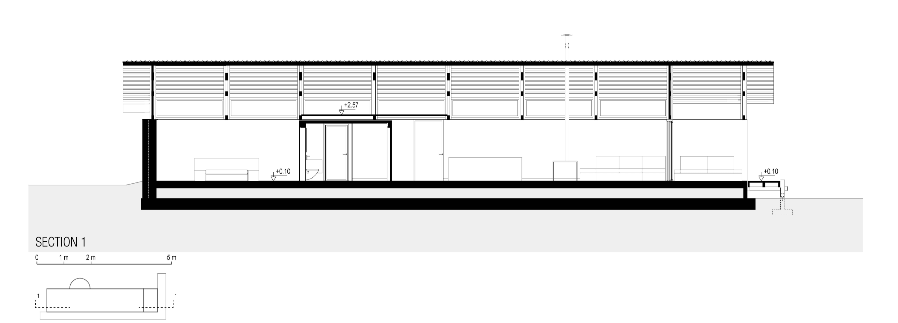 In contrast, the north-facing façade is designed to be transparent, featuring large windows and glass doors framed by the timber structure. This façade maximizes the influx of soft, indirect northern light, creating a bright and welcoming living space. The transparency of this side also offers stunning views of the surrounding landscape, seamlessly connecting the interior with the outdoors. Energy-efficient glazing ensures the house remains warm during cooler months, complementing the design approach.