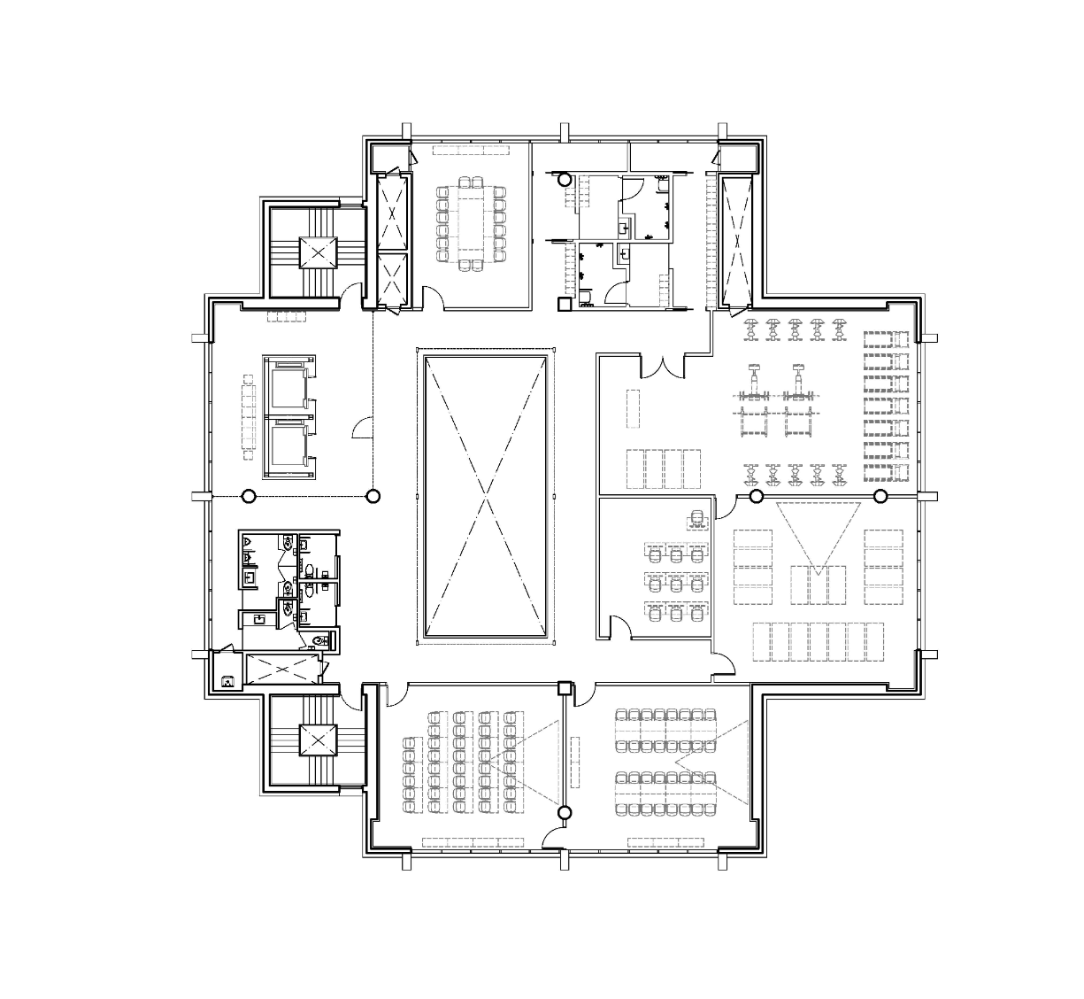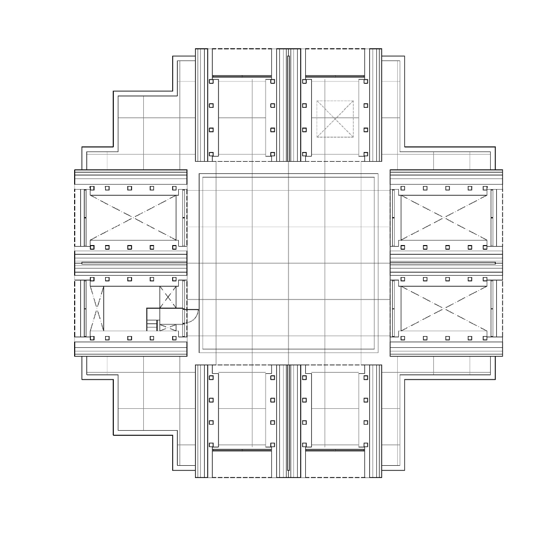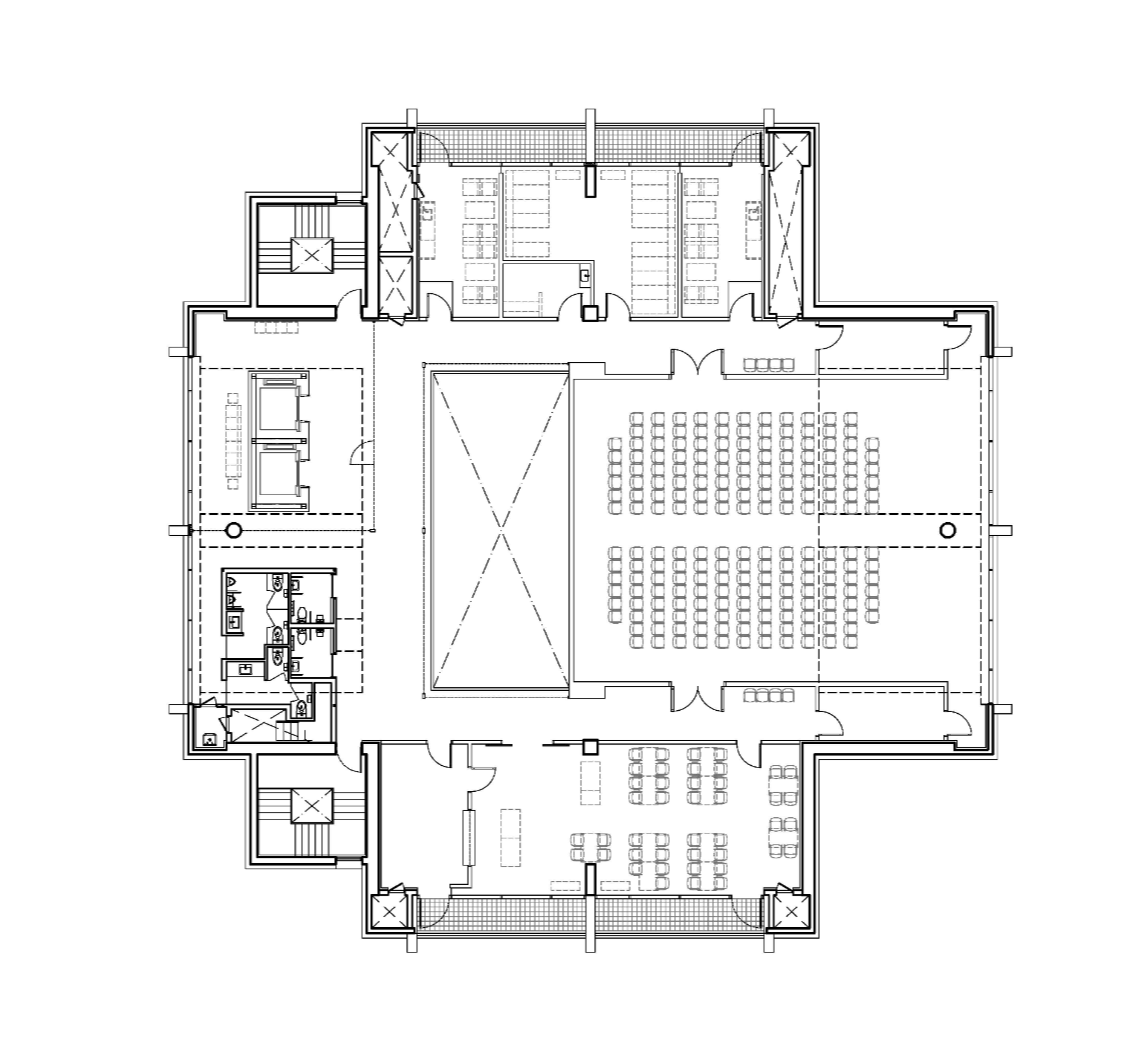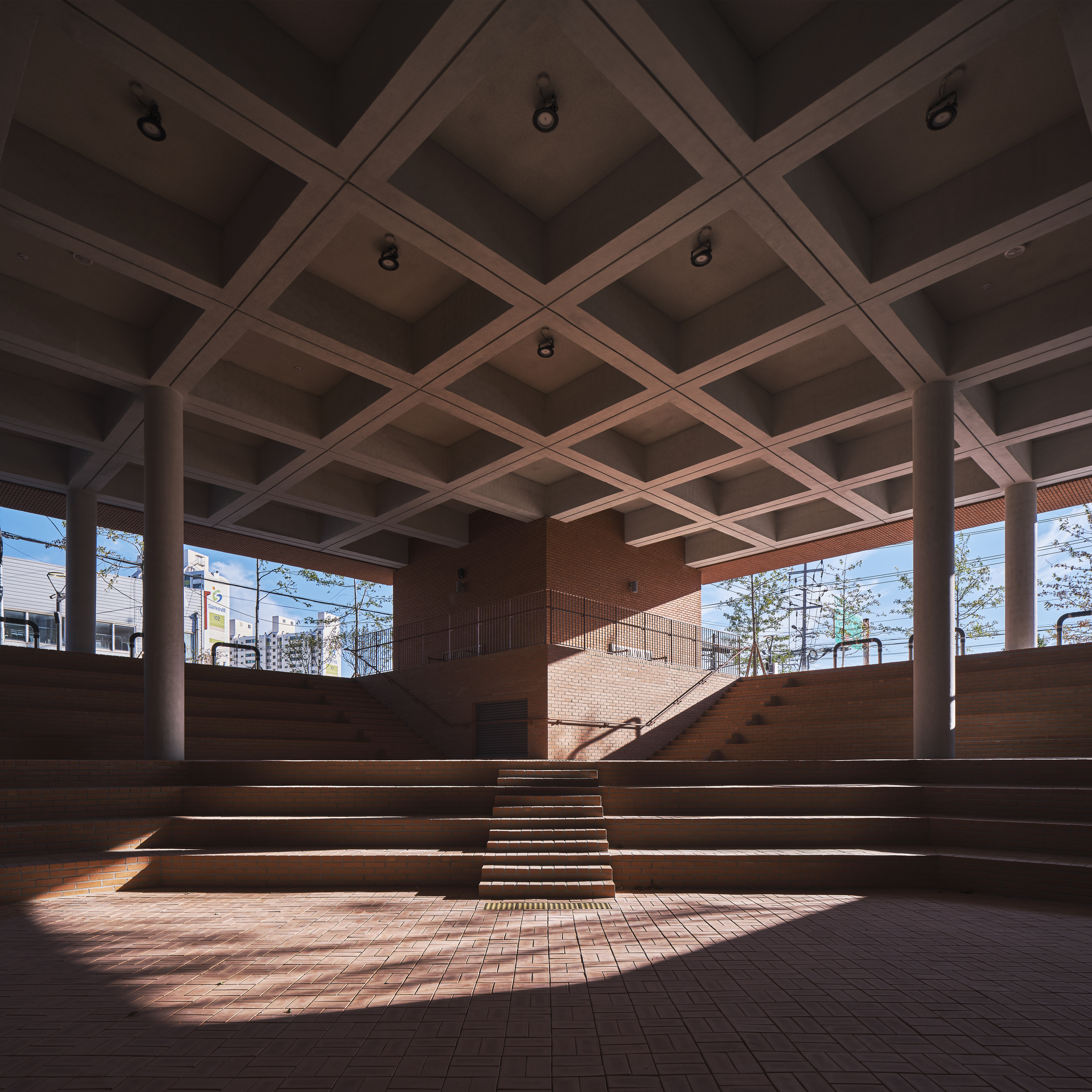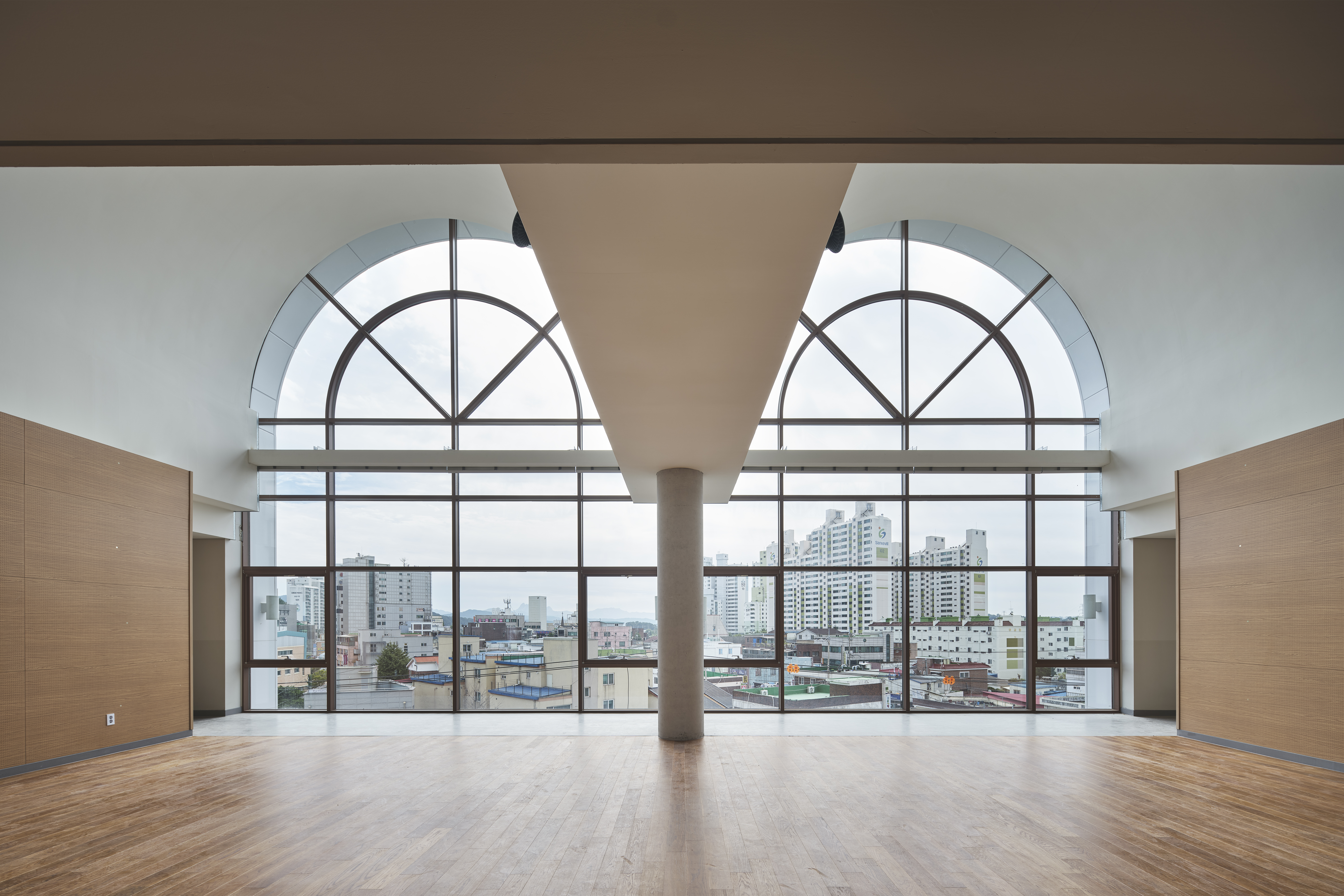 행정복지센터의 광장은 건물과 지면의 분리에 의해 형성된 ‘수직적 틈’에 해당하고 원형의 산책로(지름 45m)에 의해 규정되며 지하와 연결된 썬큰 광장에 의해 확장된다. 광장은 다양한 이벤트를 수용하여 사회적, 문화적 커뮤니티가 발산되는 지역의 중심 공간이다. 십자형의 평면은 계단실을 외부 코너로 분리하고 4면은 모두 개방된 공간을 가진다. 또한 중심 보이드에 의해 수직 개방공간을 가지고, 십자형 볼트지붕의 고창은 내부 공간을 더 밝고 풍요롭게 만들어 준다. 내부 공간의 중심에 위치한 민원실의 대기홀은 3개층 높이의 개방감을 가진다. 상층부의 주민복지시설과 시각적으로 연결되어 읍 단위의 공공청사에는 할애하기 어려운 근무자와 방문자, 지역 주민 모두를 위한 로비와 같은 역할을 한다.