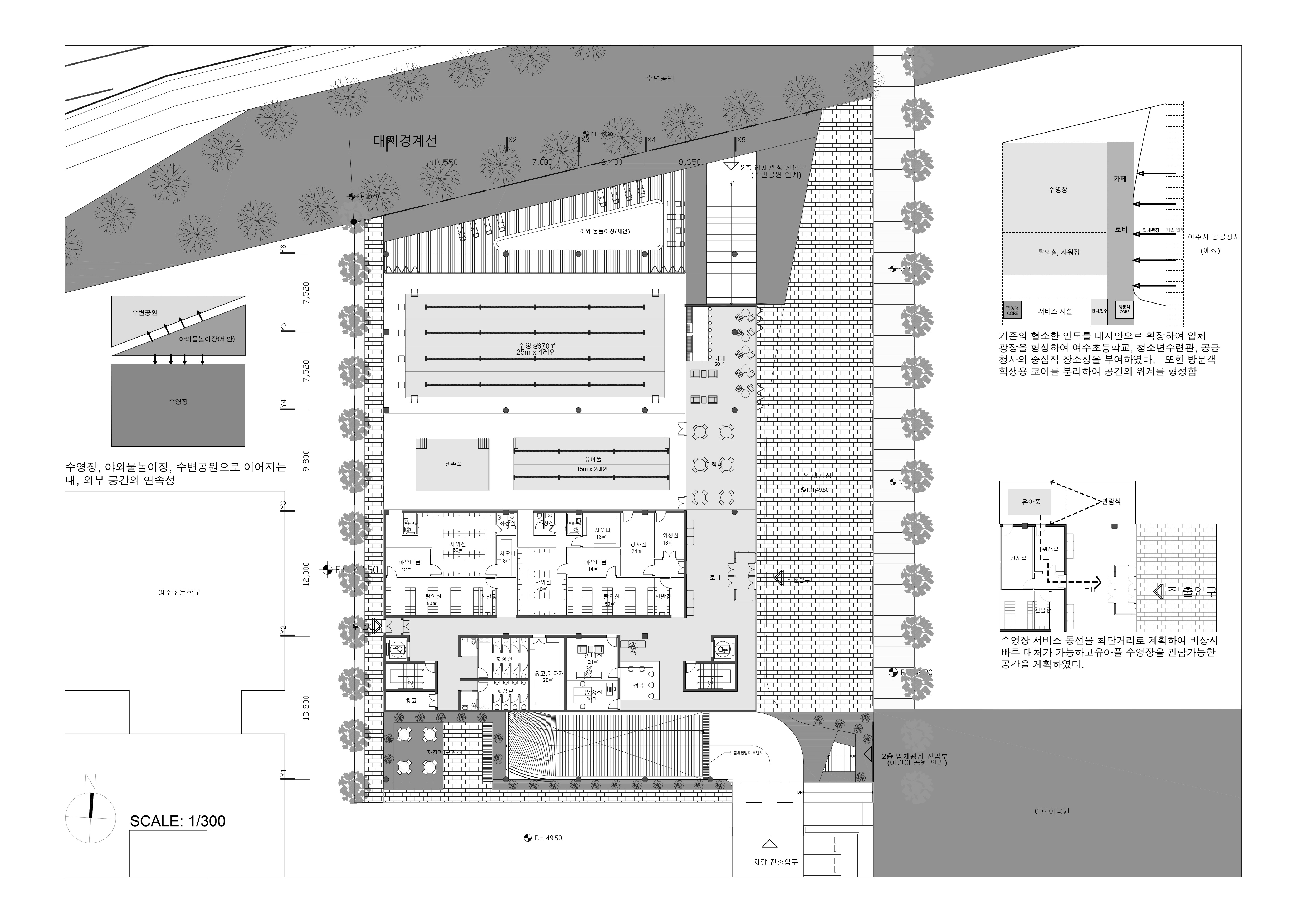 여주초등학교와의 연결성과 외부이용자들의 접근성을 고려하여 주요시설들은 여주초등학교쪽으로 광장은 보행자도로쪽으로 배치하였고, 중앙의 공유마당을 통해 주변과 연결되고 소통할 수 있게 하였습니다.