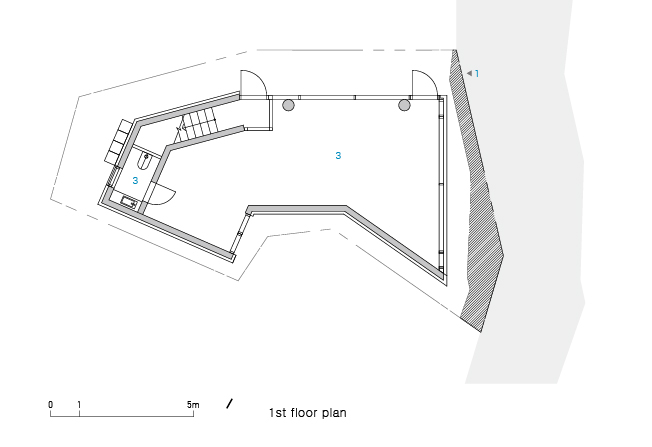 대지는 한쪽으로 꺾여있어 동서로 길고 일조가 불리한 상황이었다. 반듯한 평면 계획이나 최대 용적률 확보가 어려운 상황에 따라, 후면의 옹벽과 대지경계선에 최대한 근접하게 설계했다. 건축물이 도로에서 반듯하게 보이도록 옥탑에 장식벽을 설치했다. 접근 동선과 시점에 따라 직각으로 보이는 장식벽은 일조에 의한 계획 제한의 가상선에 최대한 근접하여 실제보다 건축물이 더 커보이게 한다. 건축가는 면적을 전략적으로 활용하기 위해 2층과 3층에 발코니 등의 서비스 공간을 최대한 넓게 계획하고, 옥탑의 계단탑이 면적에 포함되지 않도록 건축 면적의 1/8 미만으로 하였다. 이로 인해 1층의 근린생활시설의 주차장 의무 설치 면적의 제한에서 벗어나 넓게 사용할 수 있었다.