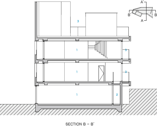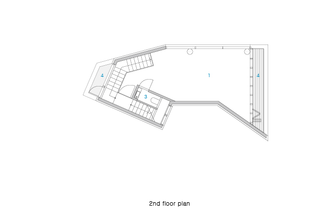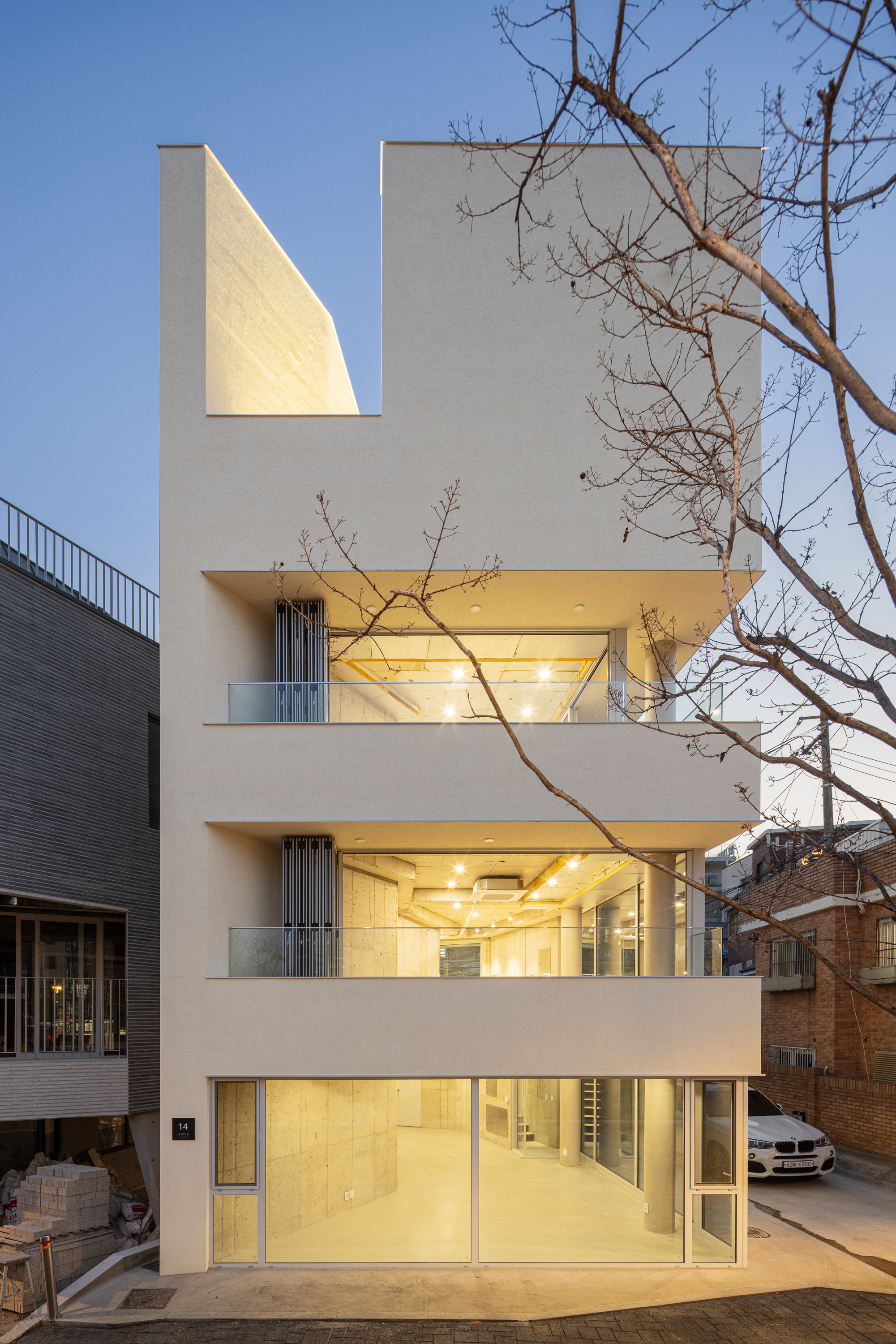 대지는 한쪽으로 꺾여있어 동서로 길고 일조가 불리한 상황이었다. 반듯한 평면 계획이나 최대 용적률 확보가 어려운 상황에 따라, 후면의 옹벽과 대지경계선에 최대한 근접하게 설계했다. 건축물이 도로에서 반듯하게 보이도록 옥탑에 장식벽을 설치했다. 접근 동선과 시점에 따라 직각으로 보이는 장식벽은 일조에 의한 계획 제한의 가상선에 최대한 근접하여 실제보다 건축물이 더 커보이게 한다. 건축가는 면적을 전략적으로 활용하기 위해 2층과 3층에 발코니 등의 서비스 공간을 최대한 넓게 계획하고, 옥탑의 계단탑이 면적에 포함되지 않도록 건축 면적의 1/8 미만으로 하였다. 이로 인해 1층의 근린생활시설의 주차장 의무 설치 면적의 제한에서 벗어나 넓게 사용할 수 있었다.