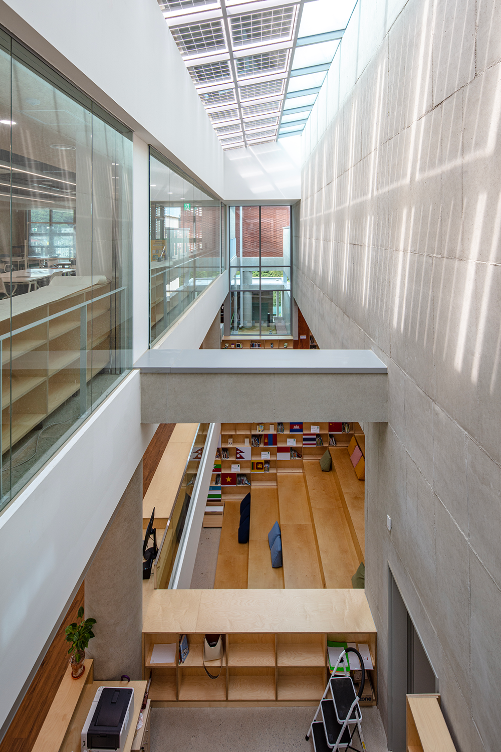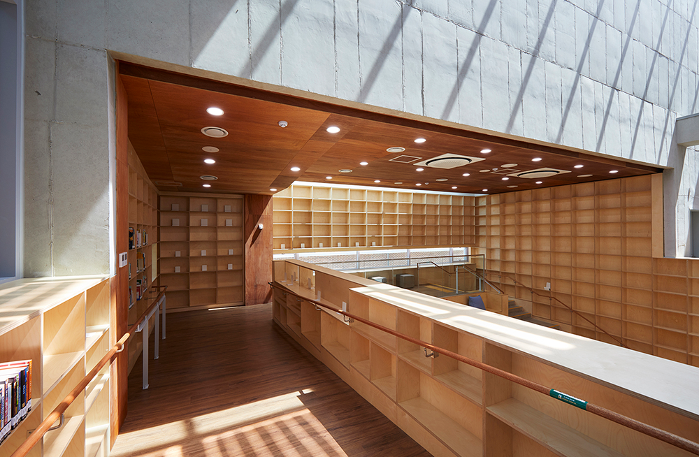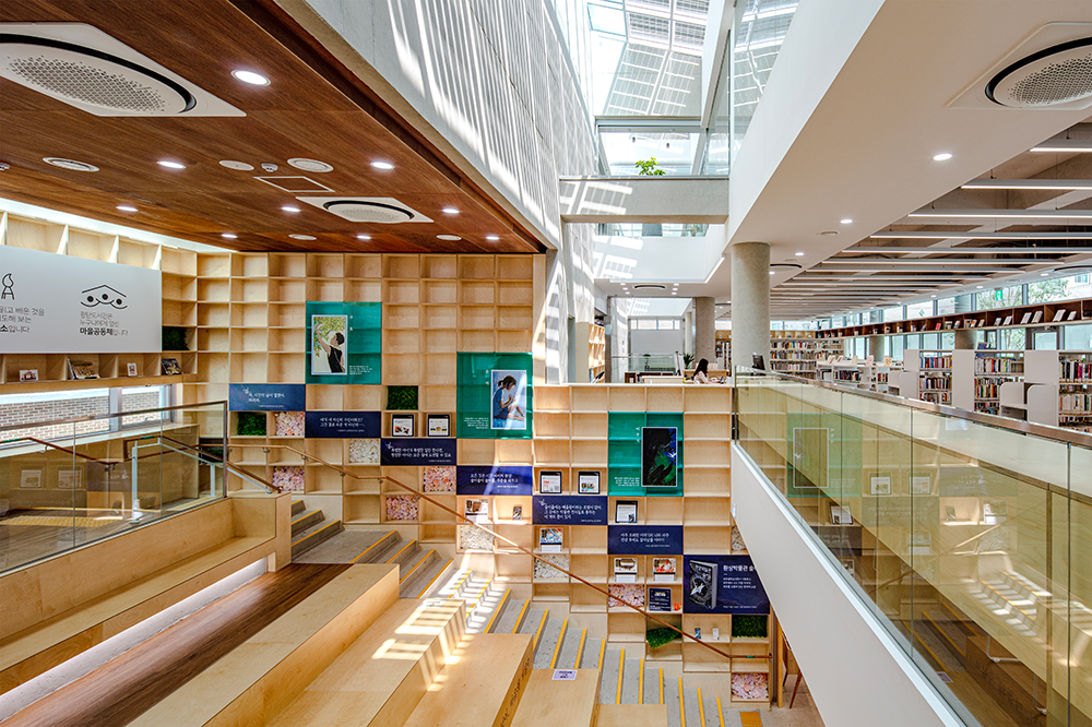 한적한 주변의 첫인상처럼 도서관과의 만남도 조급하거나 급격하지 않고 점진적이다. 방문객은 마당으로 먼저 들어서게 된다. 마당에는 자그마한 나무가 있는데, 오랜 세월이 지나면서 점차 마을의 정자목으로 자라나길 기대하며 고른 회화나무다. 바닥의 붉은 점토벽돌은 반듯한 마당에 적당한 활기를 불어넣고, 필로티로 구획된 안쪽 마당은 초화류로 조성되어 싱그러운 느낌을 준다. 마당과 면한 내부공간은 지역 주민과 인근 학생을 위한 다양한 행사와 전시, 소공연 등이 열리는 마주침 공간과 다목적실이다. 이곳에는 폴딩도어가 설치되어 문을 열면 마당으로 확장된다. 마당은 접지면에만 있는 것이 아니다.
