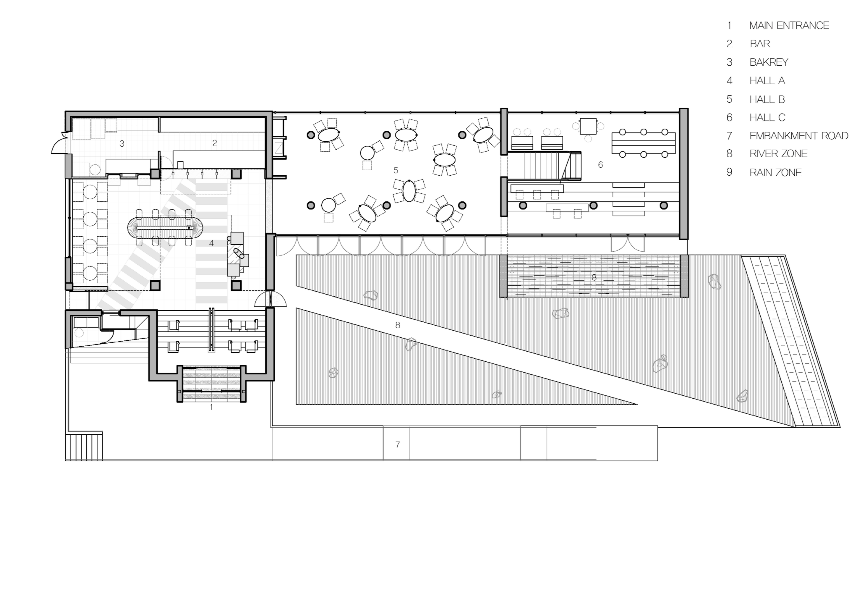 출입구와 연결 A 매스는 높은 천장과 긴 세로 창을 통해 기차의 역사 같은 공간감을 준다. 뚝방길은 걸음을 통해 사람과 도시, 자연, 공간의 내부와 외부를 연결한 공간이다. 하나의 연속된 길처럼 느껴지도록 연출하여 자유롭게 걷고 순환하며 공간을 경험하게 한다. 리버 공간은 빗방울과 물의 표면 등 다양한 현상적 모습을 담은 사색 공간이다. 금호강의 흐르는 느낌을 대지로 끌어와 물의 움직임을 담은 수공간을 설계했다. C 매스의 낙수 공간은 날씨와 상관없이 비를 맞으며 걸을 수 있는 특별한 경험을 선사한다. 선셋 공간은 빛의 연출을 통해 낮과 밤의 아름다움을 담았다. 천창을 통해 들어오는 빛은 시간대에 따라 변화하며 벽을 향해 다양한 패턴을 만들어 내고, 서향의 통창은 자동으로 커튼이 열려 노을이 지는 순간을 극적으로 바라볼 수 있다.