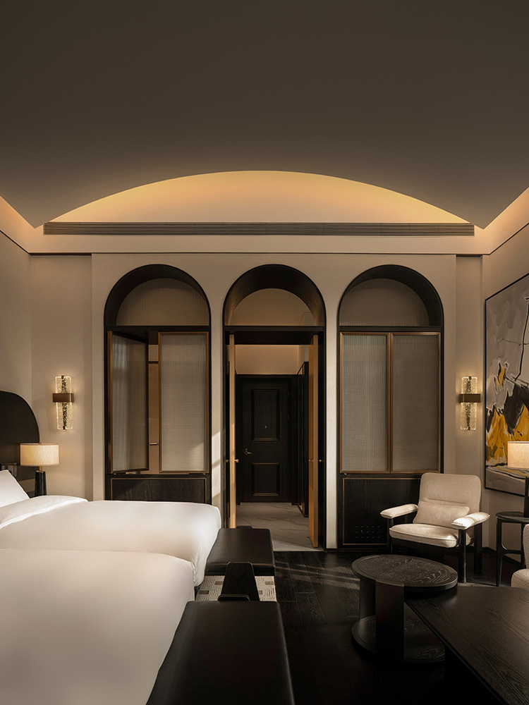 객실은 프랑스 건축의 핵심 요소인 아치를 모티브로 했다. 곡선과 직선이 조화를 이루는 아치형 천장이 공간의 분위기를 강조하고, 자연스러운 목재 질감을 더해 동양과 서양의 요소와 미학을 통합했다.