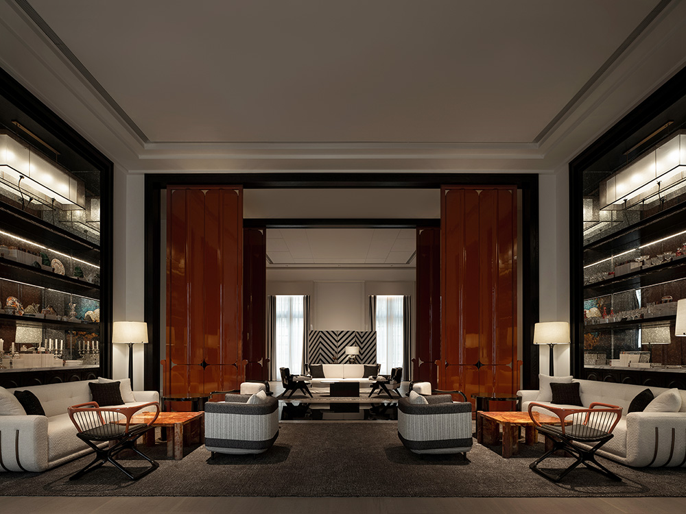 로비의 백색과 흑색 조합의 마감재와 가구는 고급스럽고 세련된 느낌을 자아내고, 붉은색의 패널과 포인트 가구는 공간에 자유롭고 밝은 느낌을 더한다. 복고풍의 바닥 패턴은 흑백 줄무늬에 스크린을 보완하여 시각적으로 현대적인 느낌을 돋보이게 표현했다.