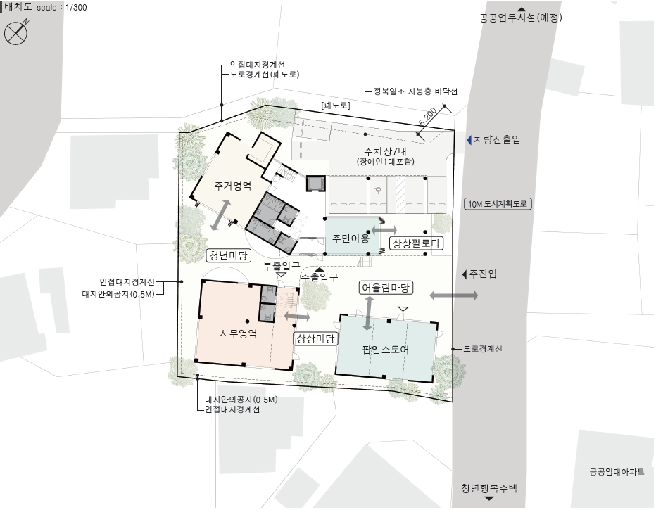 그래서 우리는 이곳이 마을의 일부로 읽혀 거부감이 덜하고, 길이 대지 내부로 자연스럽게 이어져 청년과 주민의 시선이 마주칠 수 있는 빈도수를 높이는 것이 중요하다 생각했다.