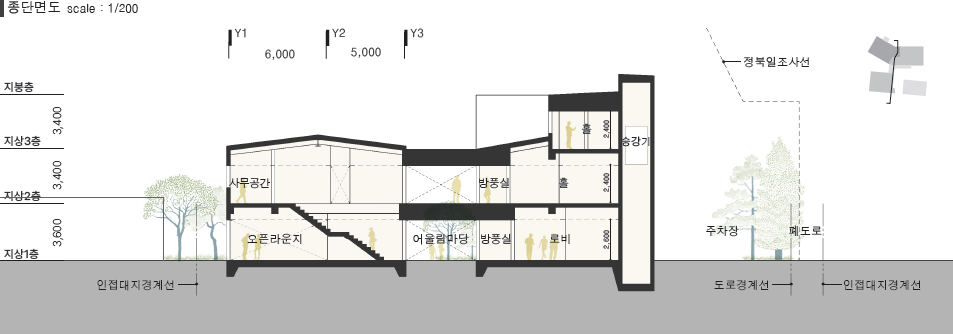 우리는 대지 안에 3~40평 남짓한 기존 집들의 크기를 닮은 건물을 적당한 거리를 두고 배치했다.