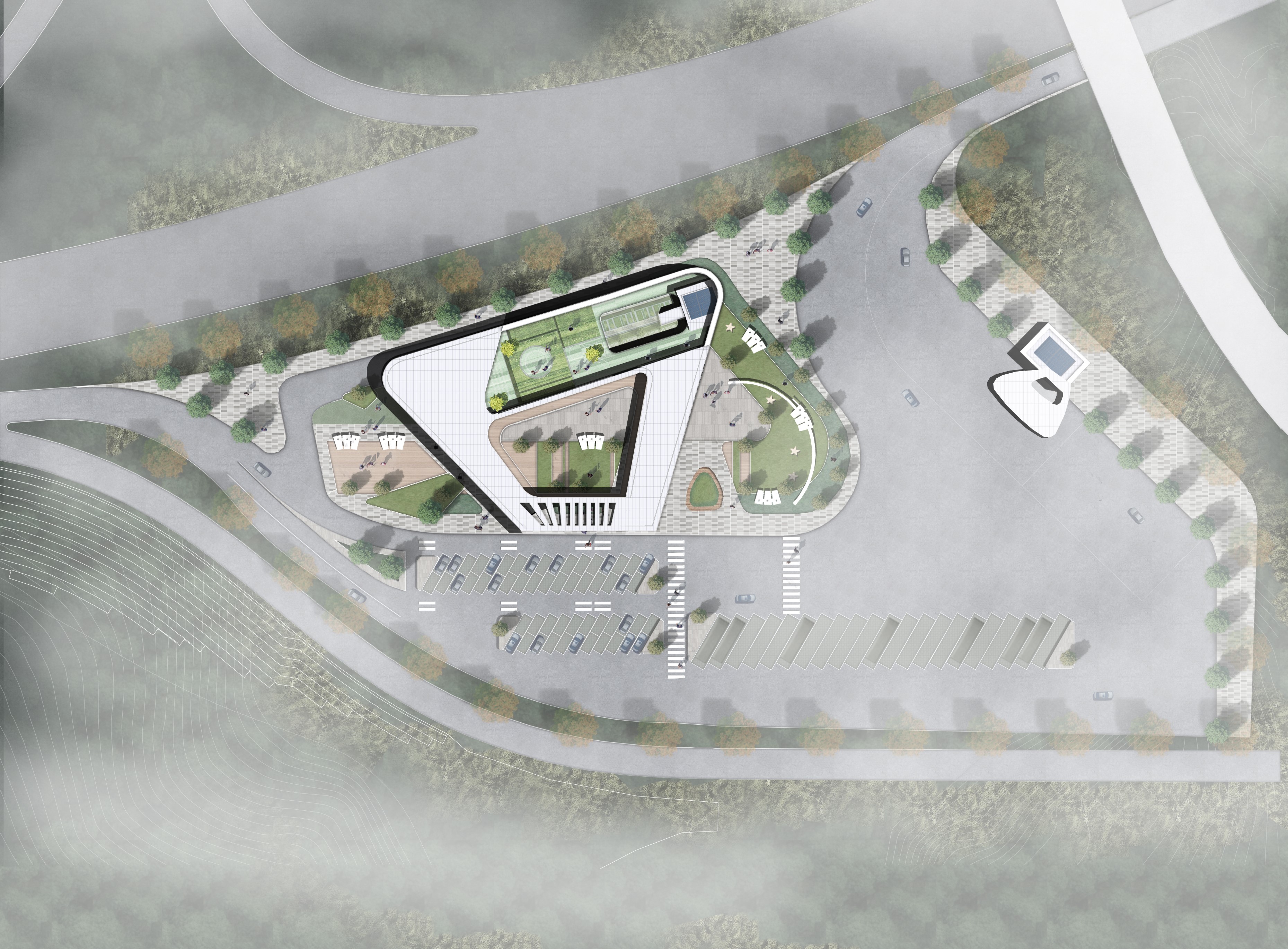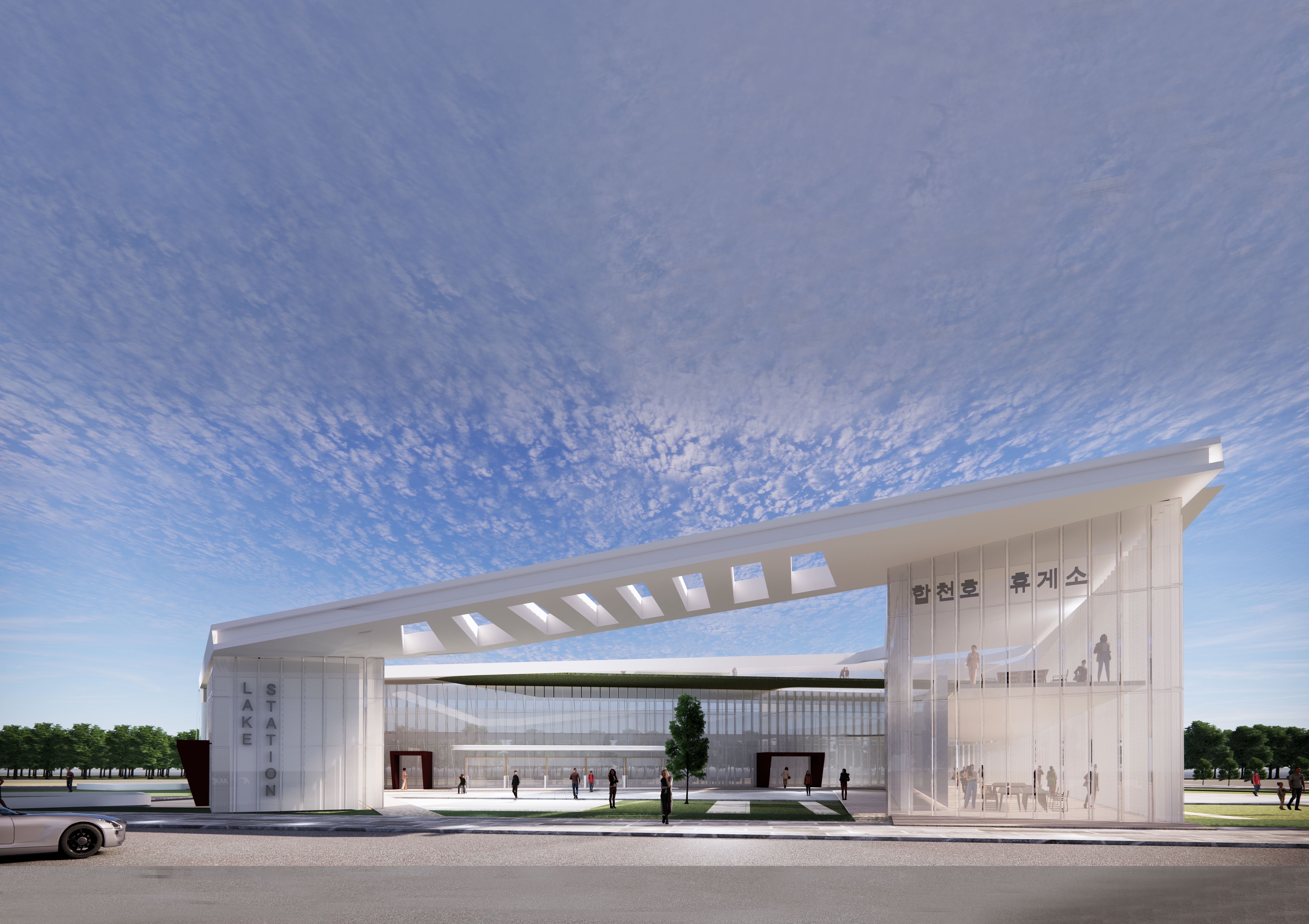 저희가 제안하는 합천호 휴게소 [Lake-Station]은 다양한 쉼터를 제공하는 자연 속 휴게시설입니다. 합첩군의 지명 유래(세개의 고을이 합하여 이루어진 곳)를 모티브 삼아 지역의 상징적 요소를 담아낸 외부공간을 계획하였습니다. 또한 역사적 상징인 '악견산성'의 이미지를 부여하여 '고리'라는 요소를 통해 사람들을 담아내는 형상을 입면 디자인에 담아내었습니다. 상징적인 흐름이 강조된 공간과 형태를 담아내어 다양한 소통과 교류로 채워진 편의공간을 제공함으로서 자연과 더불어 생기가 돋아나는 휴게소를 제안합니다. [Lake-Station]에는 특화된 전망 휴게데크를 계획하였습니다. 전망 휴게데크는 물빛광장, 그린나래 중정과 연계하여 인근 합천호를 조망할 수 있는 상징적 공간을 제공합니다.