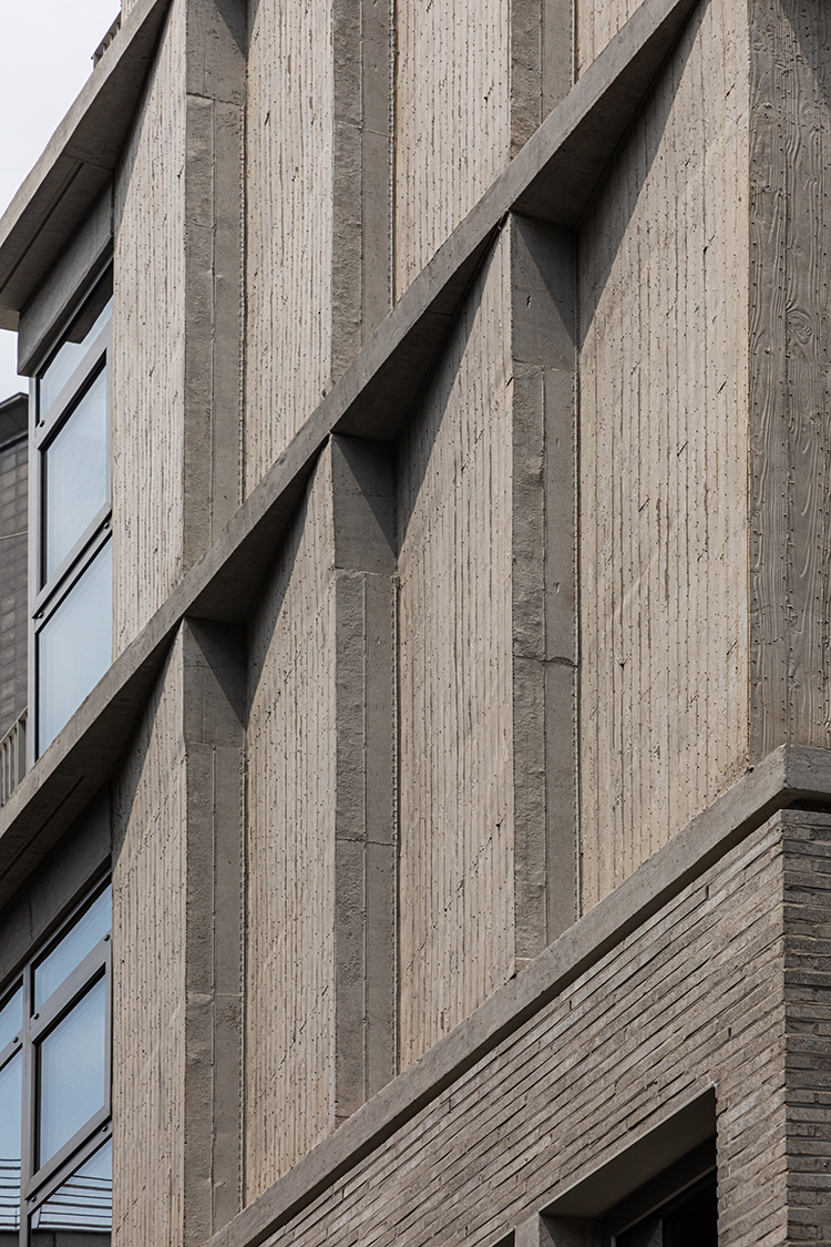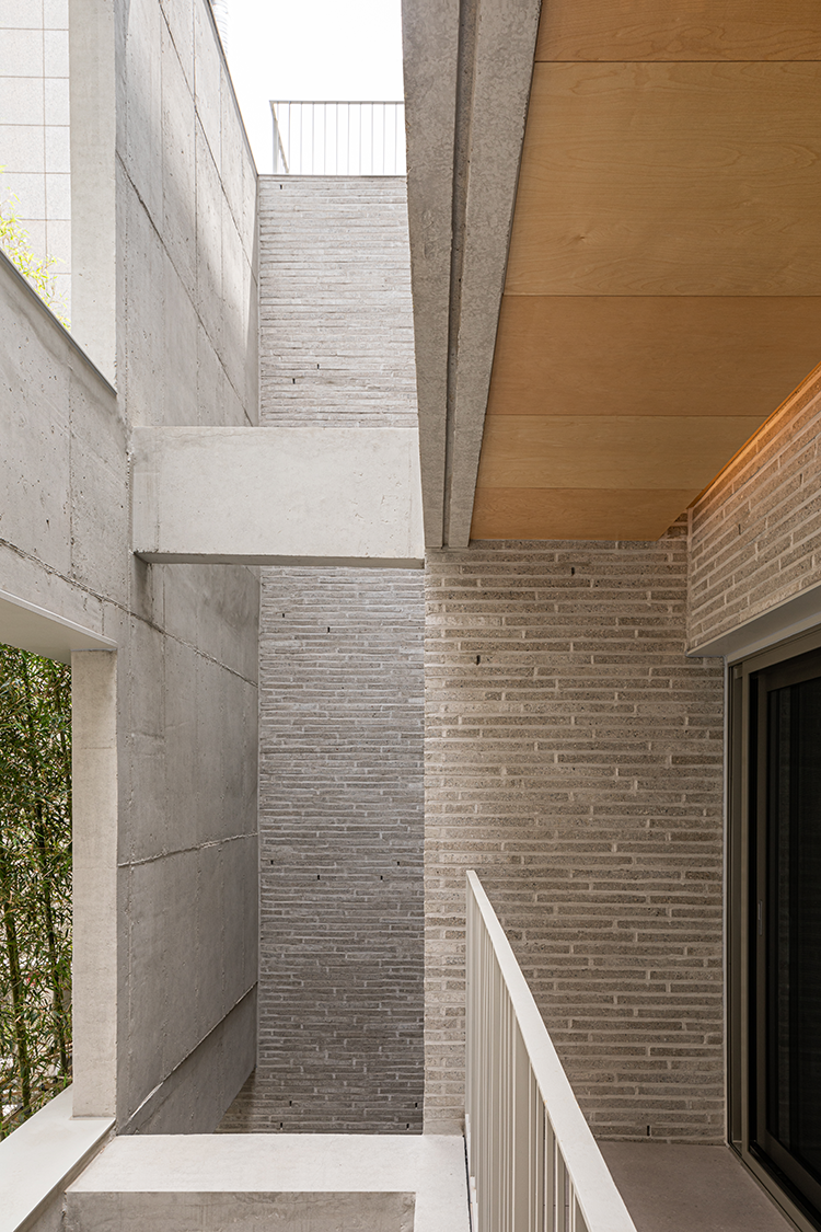 건축주는 영화와 드라마의 감독으로, 그 작품들의 분위기가 건축물의 입면과 재료에 은유적으로 표현되어 있다. 건축물의 외부 마감은 노출 콘크리트와 종석이 드러난 벽돌이 사용되었다. 지상 1층의 매끈한 곡선 형태 외벽과 원기둥은 매끈한 노출 콘크리트이지만, 상부층의 외벽은 이와 대조되며 다소 거친 송판 노출콘크리트가 적용되어 대조된 느낌을 준다. 특히, 송판 노출콘크리트는 거친 재질감을 더하기 위해 콘크리트 타설 시 생긴 작은 요철들을 제거하지 않고 존치했다. 또한 구조적 역할을 하는 벽체에 덧살을 대고, 각도를 조절하여 시간대에 따라 파사드의 표정은 계속 변화한다. 벽돌은 코너부의 크기를 몇 가지 정도로 다르게 하여, 줄눈의 패턴이 반복되지 않고 자연스러우면서 불규칙하게 조합되어 있다. 회색빛의 콘크리트와 벽돌은 멀리서 바라보면 하나의 재료처럼 느껴지기도 하지만, 건축물에 가까워질수록 각각의 재료가 가지고 있는 미묘한 색상 차이와 재질감을 경험하게 된다.