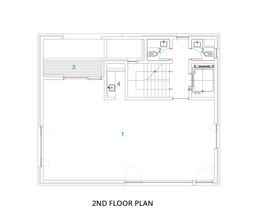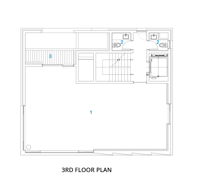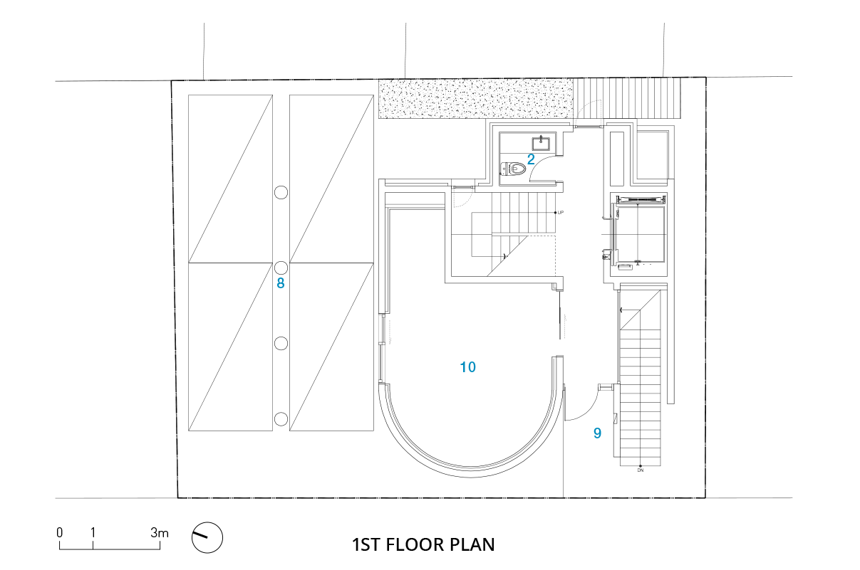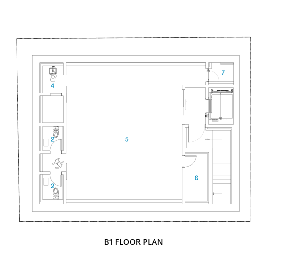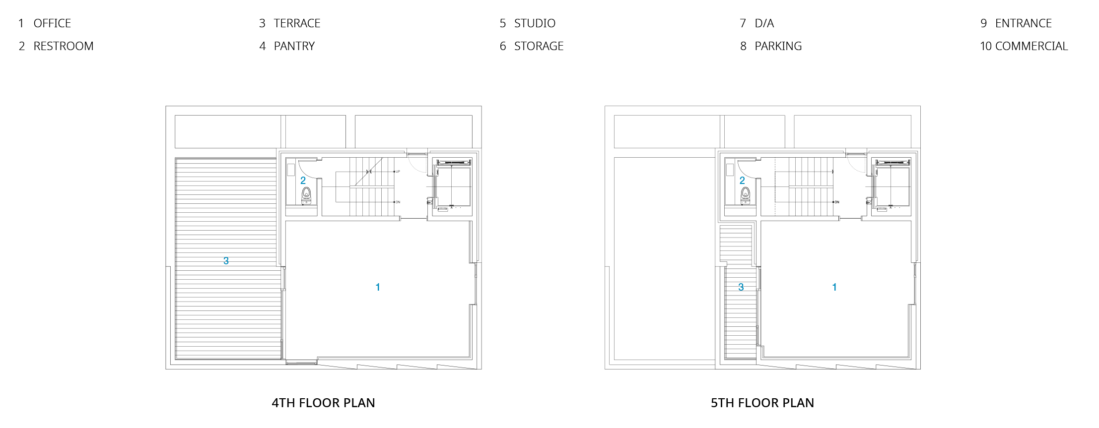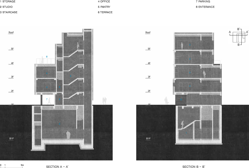 지상층의 사무 공간과 지하층의 스튜디오 공간이 상호 간섭되지 않도록, 전면도로에서 지하층으로 바로 접근할 수 있는 외부 계단을 만들고 지상층과 지하층의 진입 동선을 분리했다. 지하층은 스튜디오 또는 연습실 등의 용도를 위해 7.9m의 높은 층고로 계획했다.