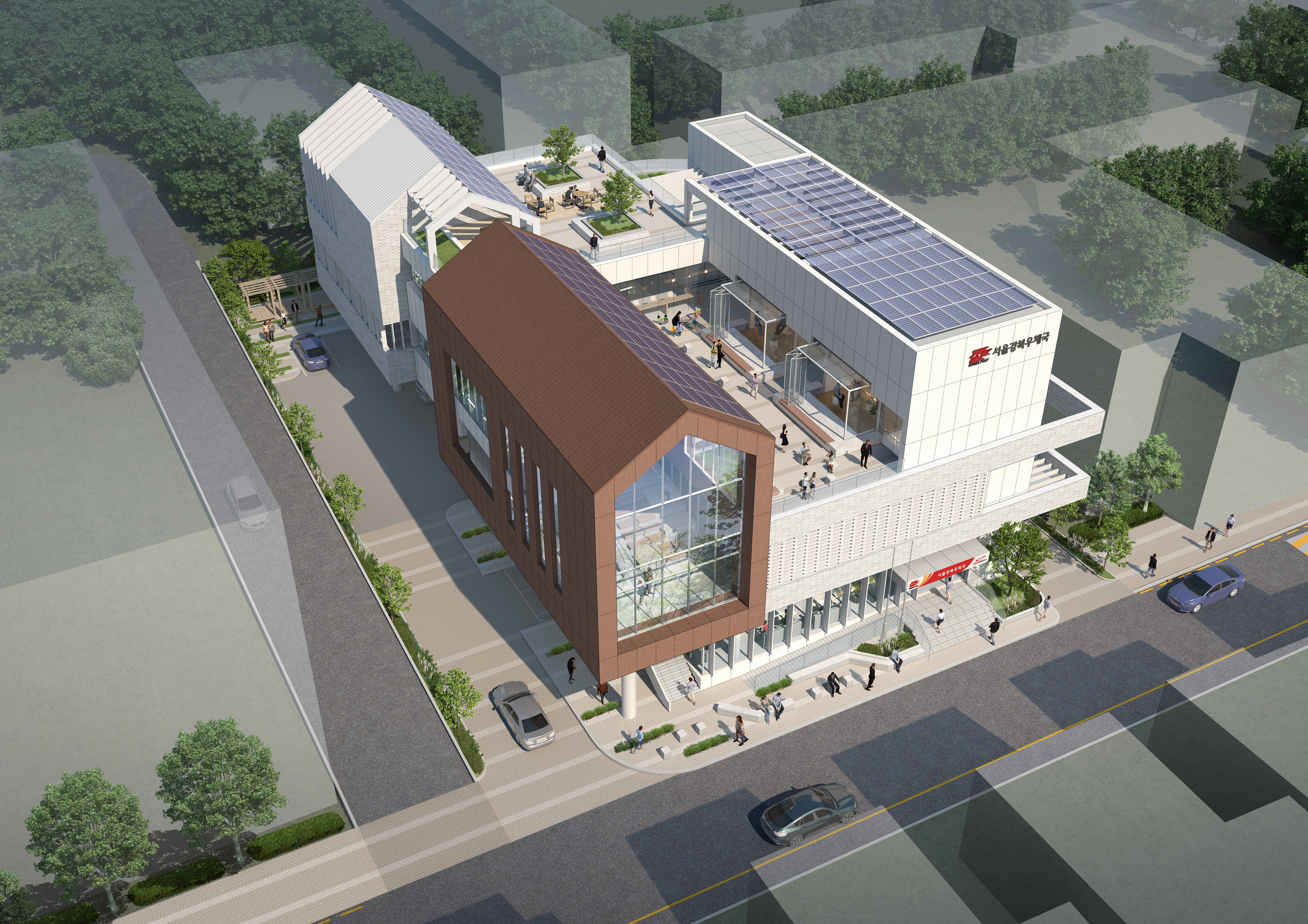 서울 강북우체국은 기본적인 기능에 충실하면서도 밀집된주거지역에 조그만한 틈을 만들어, 지역주민들이 쉬어가고 함께할 수 있는 다목적 팝업공간을 품고있는 우체국입니다. 협소한 대지의 특성을 고려해 우체국의 우편,물류,영업기능을 원활하게 수행하면서도 다목적 팝업공간인 우정 스퀘어는 주민소통, 휴식,교육, 전시, 홍보, 영화관람, 음악회, 지역행사시 플리마켓의 장소로 제공되며, 이용자의 다양한 니즈에 유연하게 변화하는 공간으로 계획하였습니다.