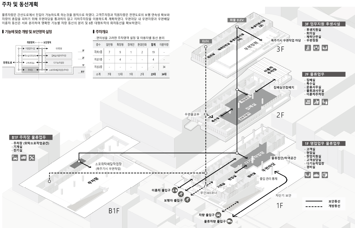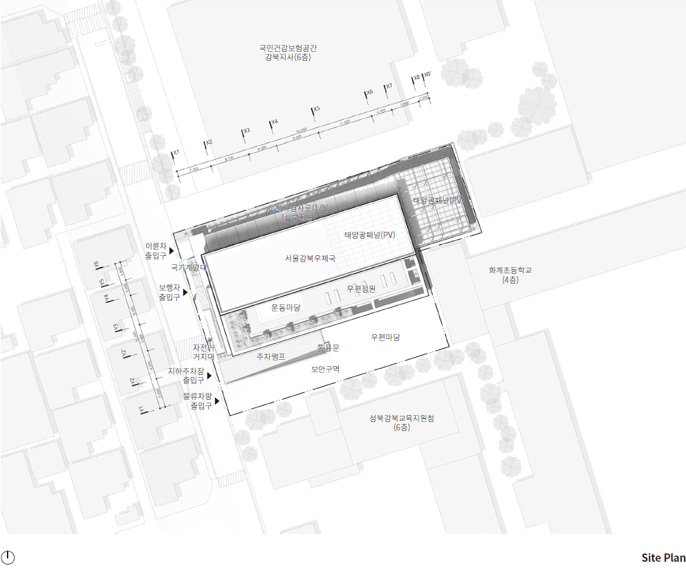 서울강북우체국은 우정사업 환경 변화에 대응하고, 우체국의 노후화로 인한 시설 개선 및 안정성 확보를 위해 새롭게 자리 잡는다. 밀도 높은 도시블록 속 인접한 공공건축물과의 경계에 위치하며, 공공건축물로서 공공성 회복, 지역 주민을 위한 신속하고 편리한 우편 서비스를 제공하고자 한다. 도로가로는 보행자와 차량의 동선을 명확히 분리하여 이용자의 안전을 최우선으로 하고, 물류의 신속하고 안전한 이동이 가능하게 동선 계획을 수립한다. 넓은 우편마당을 두어 이동 시 시야 확보를 통해 도로상황을 인지할 수 있게 하고, 대형 우편차량의 회차를 원활하게 한다. 다층의 외부 휴게 공간은 내 · 외부를 유기적으로 연결하여 사무 공간과 휴게실 쾌적하게 하고 거주성을 높인다. 합리적인 우체국 배치와 간결한 조형은 효율적인 토지이용 계획과 경제성을 가지길 기대한다.