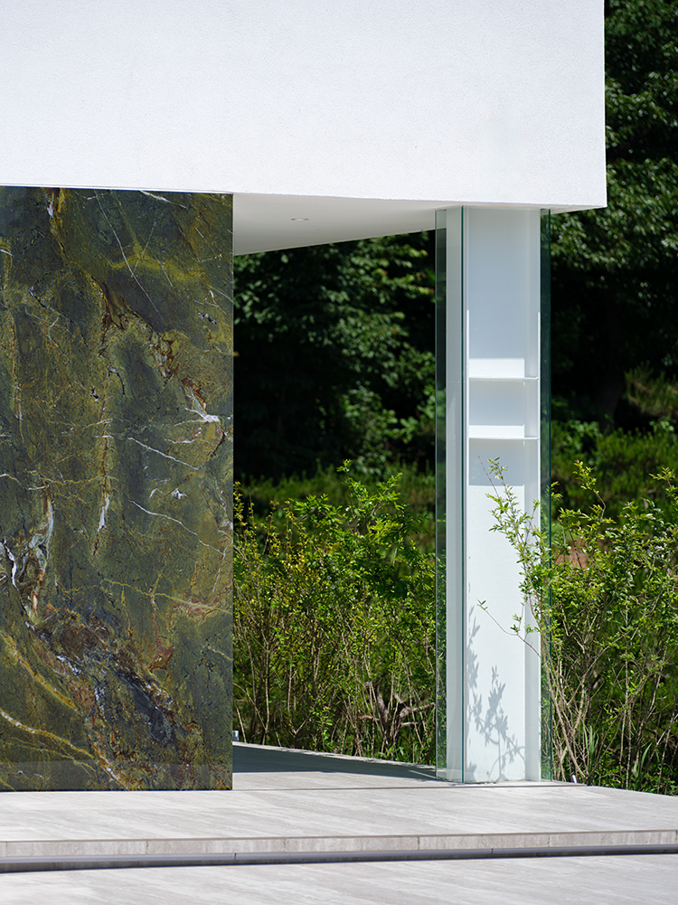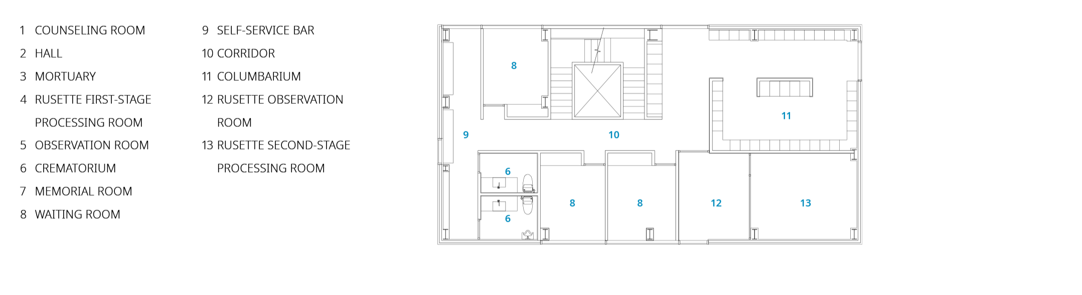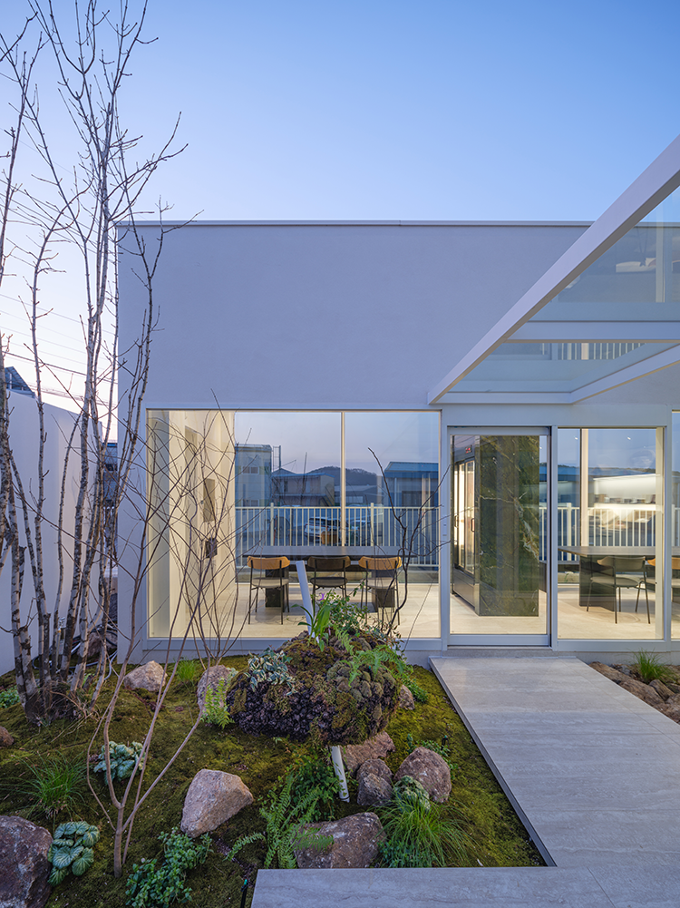 건물을 받치고 있는 철골 기둥은 기존 건물의 구조체이다. 옛 건물의 모습을 감추는 대신 최소한의 면 처리와 투명 유리로 마감했다. 옥상의 휴게 공간인 정원은 가볍고, 기존 건물의 구조에 하중의 부담을 주지 않는 나무껍질로 바닥재가 깔려있다. 외피의 구성은 여러 면과 소재로 나누어져 의도된 비율로 나누었다. 높낮이를 달리하며 면과 면을 가르는 창호와 주변 자연이 투영된 타일의 얽혀 상자를 포개 놓은 형태가 되었다. 이렇게 정제된 선과 면의 공간에서 슬픔을 이해하고 위로하며, 서로에게 의미 있는 마지막 인사를 할 수 있는 장소가 되었다.