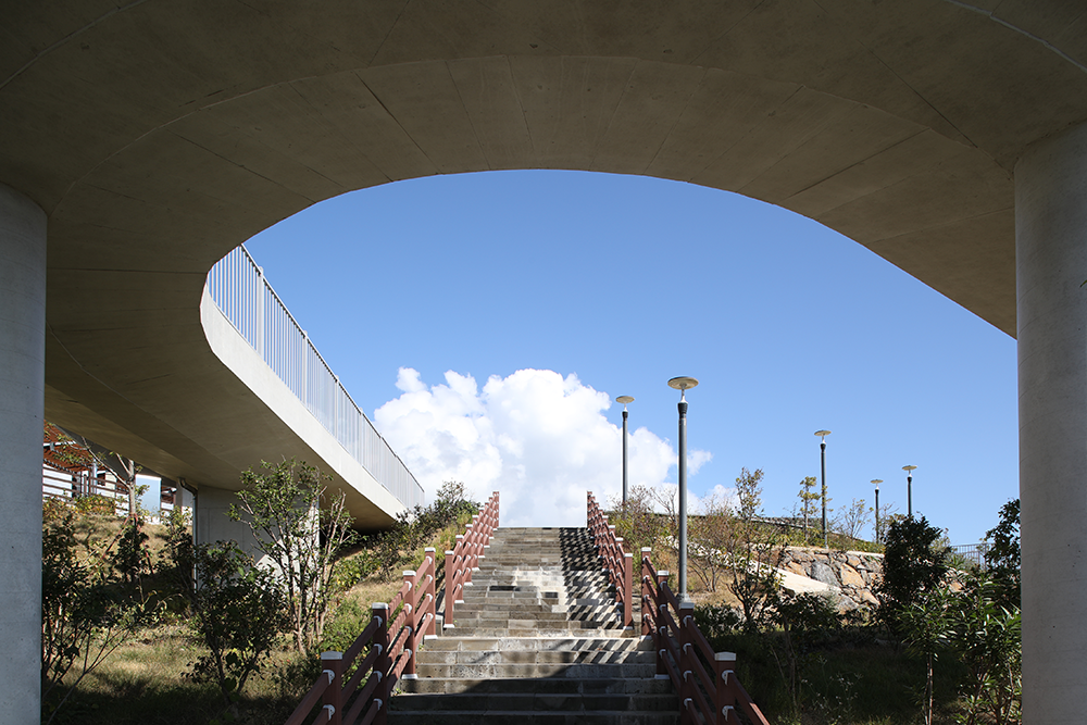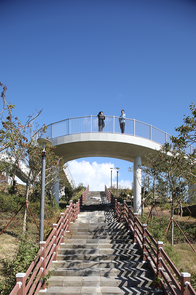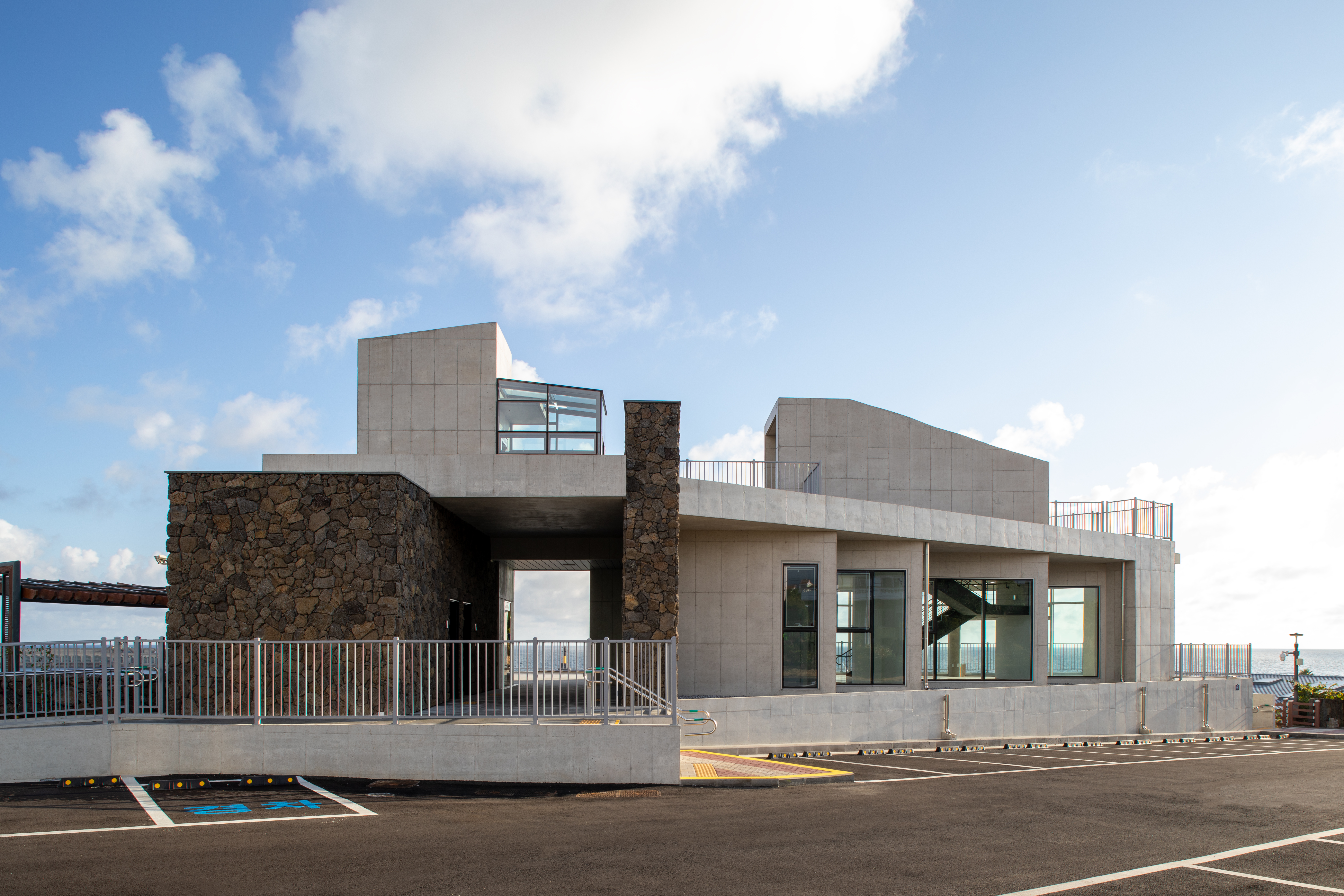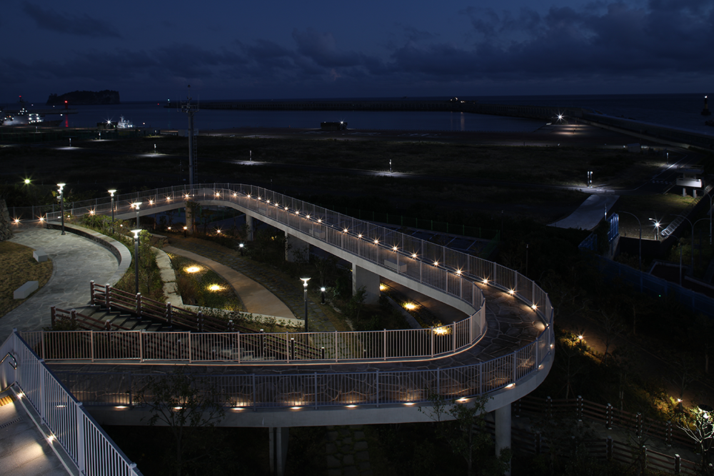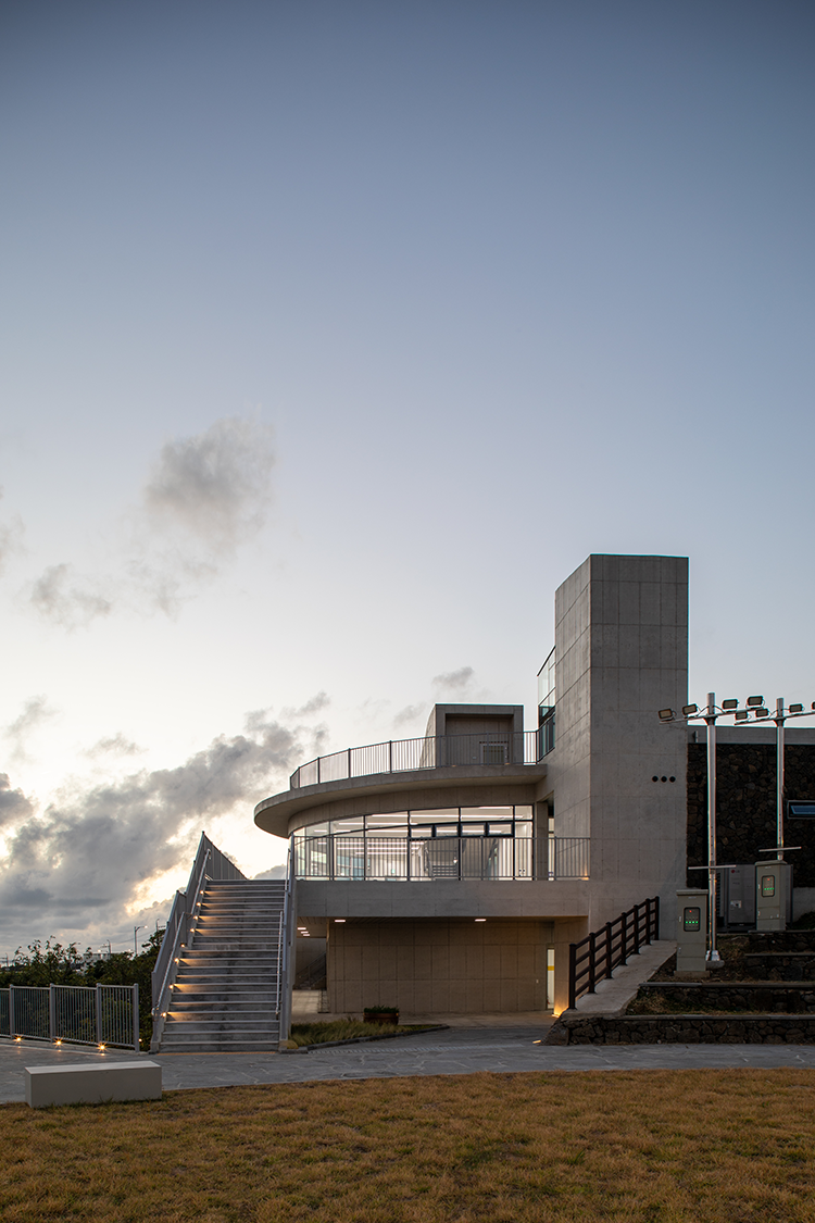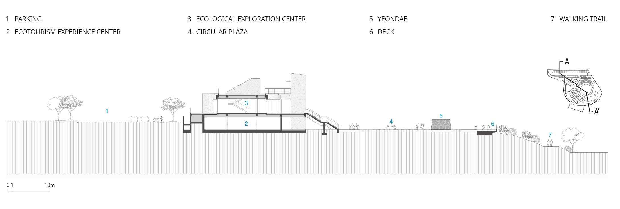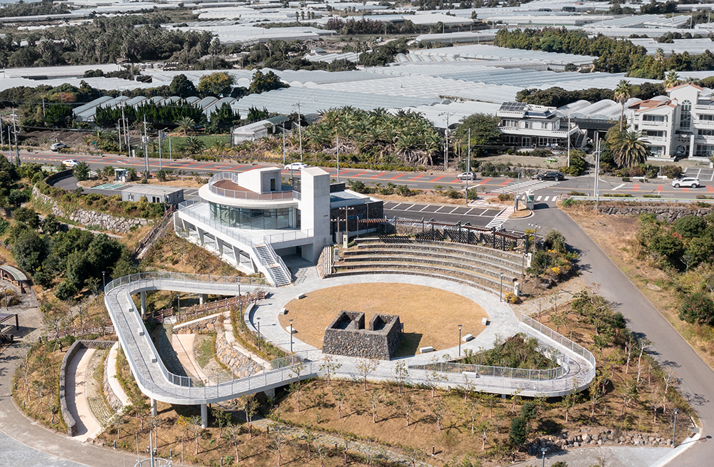 순환하는 고리는 강정 크루즈터미널에 세워진 휴양생태체험장 및 생태탐방센터, 전망 데크 전체를 아우르는 공간 개념이다. 기존의 대지에는 이미 조성된 친수 공원(광장)이 있었고, 체험관과 전망 데크가 새롭게 생겨나면서 크루즈를 이용하는 방문자들에게 볼거리를 제공하게 되었다. 10m가 넘는 경사지에 주차장과 원형 광장 사이 계획된 체험관은 누구에게나 평등하게 접근할 수 있도록 순환하는 고리의 형태를 가지고 있다. 휘감는 고리의 형태는 기존의 지형과 원형 극장을 더욱 돋보이게 하며, 출발과 도착을 반복하는 터미널이라는 공간이 가진 의미를 떠올리게 한다. 새로 조성된 원형 광장은 기존에 있었던 부정형 판석을 일부 걷어내고 녹색의 잔디 광장으로 만들었다. 보행자는 생태탐방센터를 지나 전망 데크를 걸으면서 서서히 드러나는 넓은 하늘과 탁 트인 바다를 만나는