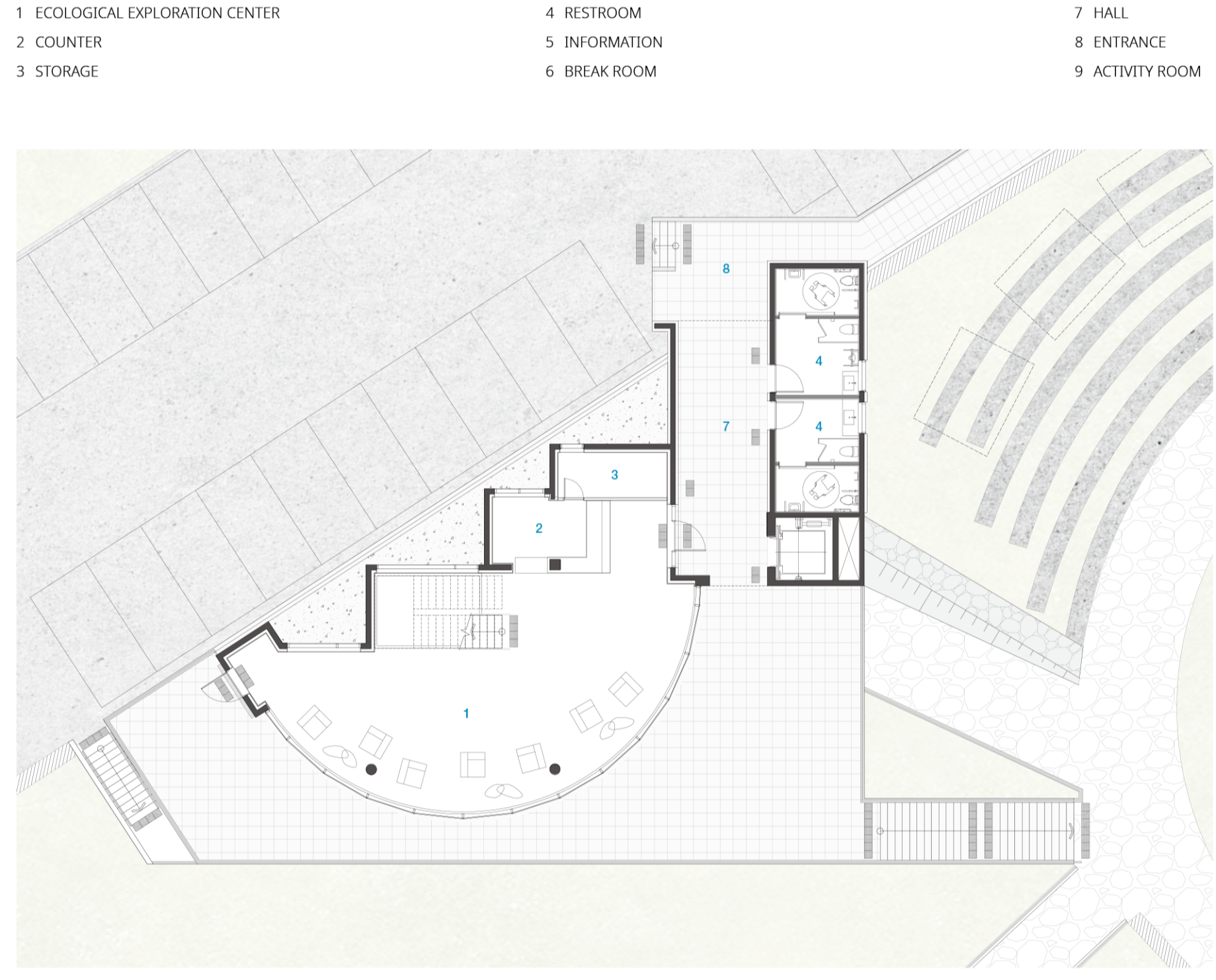 순환하는 고리는 강정 크루즈터미널에 세워진 휴양생태체험장 및 생태탐방센터, 전망 데크 전체를 아우르는 공간 개념이다. 기존의 대지에는 이미 조성된 친수 공원(광장)이 있었고, 체험관과 전망 데크가 새롭게 생겨나면서 크루즈를 이용하는 방문자들에게 볼거리를 제공하게 되었다. 10m가 넘는 경사지에 주차장과 원형 광장 사이 계획된 체험관은 누구에게나 평등하게 접근할 수 있도록 순환하는 고리의 형태를 가지고 있다. 휘감는 고리의 형태는 기존의 지형과 원형 극장을 더욱 돋보이게 하며, 출발과 도착을 반복하는 터미널이라는 공간이 가진 의미를 떠올리게 한다. 새로 조성된 원형 광장은 기존에 있었던 부정형 판석을 일부 걷어내고 녹색의 잔디 광장으로 만들었다. 보행자는 생태탐방센터를 지나 전망 데크를 걸으면서 서서히 드러나는 넓은 하늘과 탁 트인 바다를 만나는