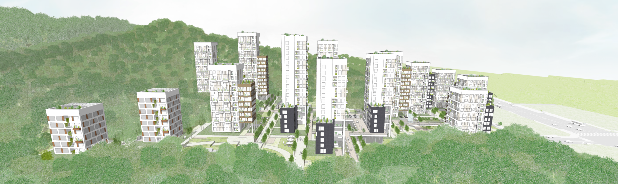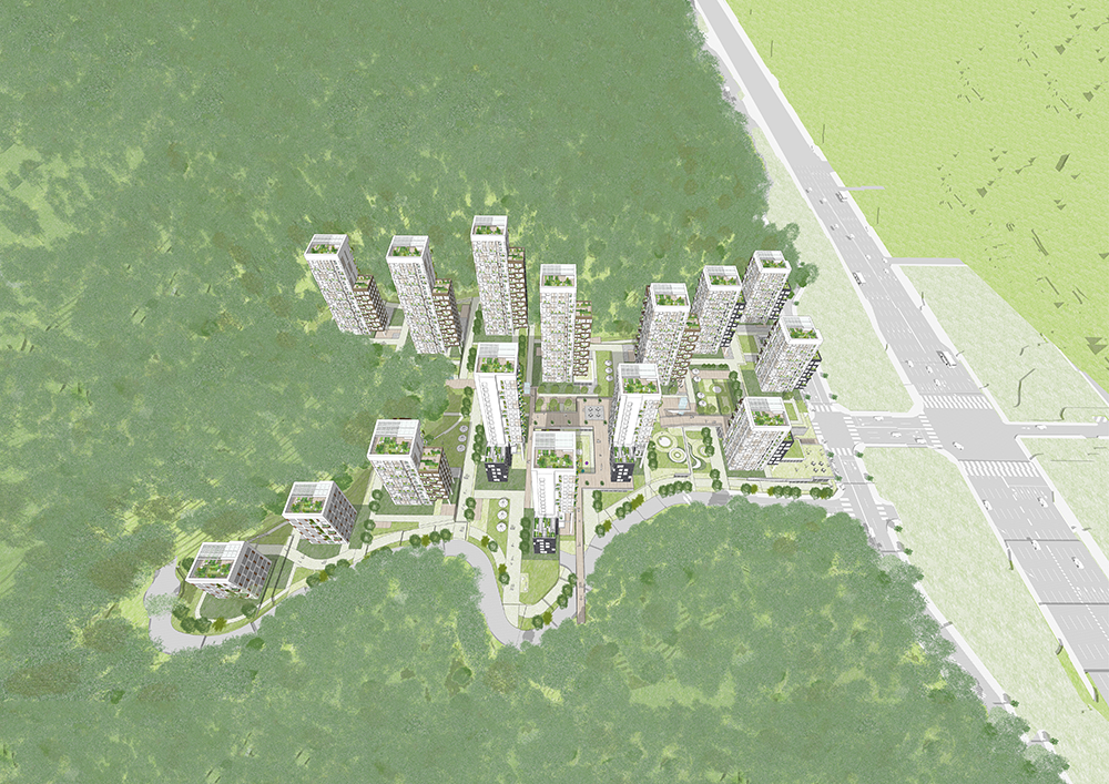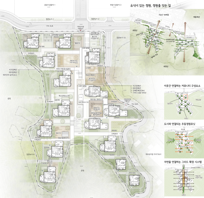 여러 방향으로 열린 정원위로 점적인 요소의 주동들이 서로 대면하지 않게 배치된다. 도시에 반응하는 도시컨텍스트 대응형, 입체적 커뮤니티시설과 연계한 커뮤니티 특화형, 인접 녹지의 흐름을 받아들이는 녹지 인프라 대응형으로 조닝 된 주동들은 우면산 산세를 따라 텐트형의 스카이라인을 형성하며 자연에 스며든다.
