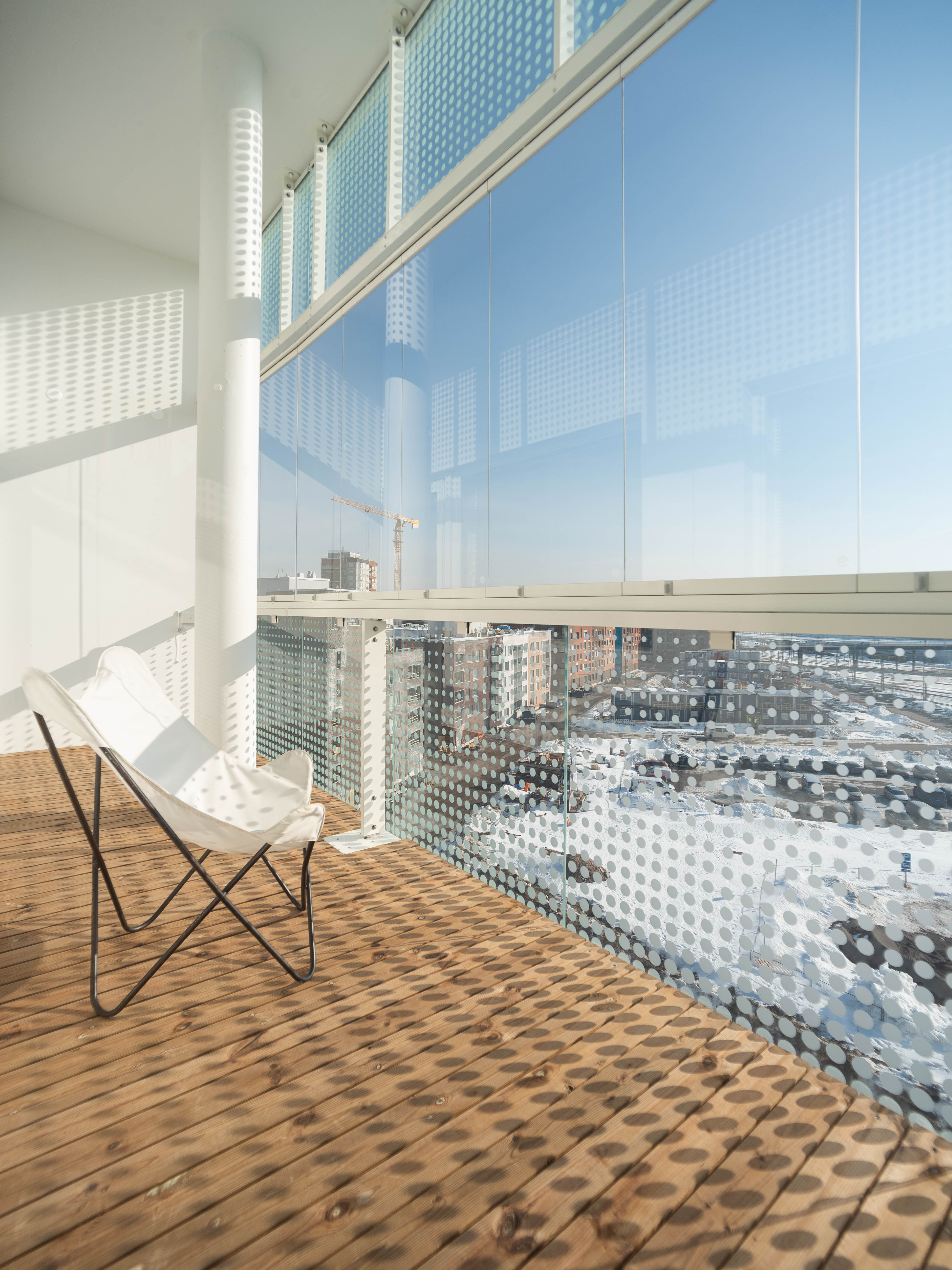 이 건축물은 다양한 유형의 파사드를 가지고 있습니다. 상층부 아파트는 다른 층 보다 크고 넓은 발코니를 갖추고 있어 빛이 많이 들어오는 형태입니다. 유리로 된 발코니와 백색 입면으로 이루어진 볼륨은 벽돌로 디자인 된 입면과 대조를 이루면서도 통일된 요소를 만들어냅니다. 이에 따라 하층부는 활기찬 거리 풍경을 만들고, 시각적으로 더 가벼운 볼륨을 가지고 있는 상층부는 인접한 철도 지역과 시각적으로 조화를 이룹니다. 이 가로로 긴 랜드마크는 철도 경관 너머에서도 잘 보입니다.