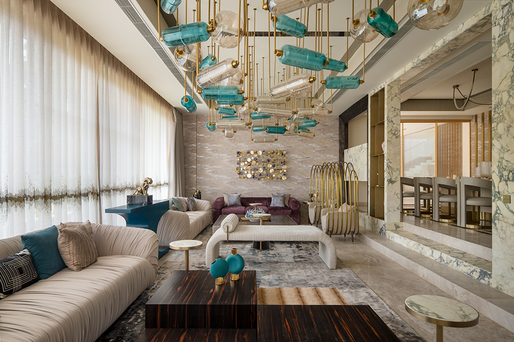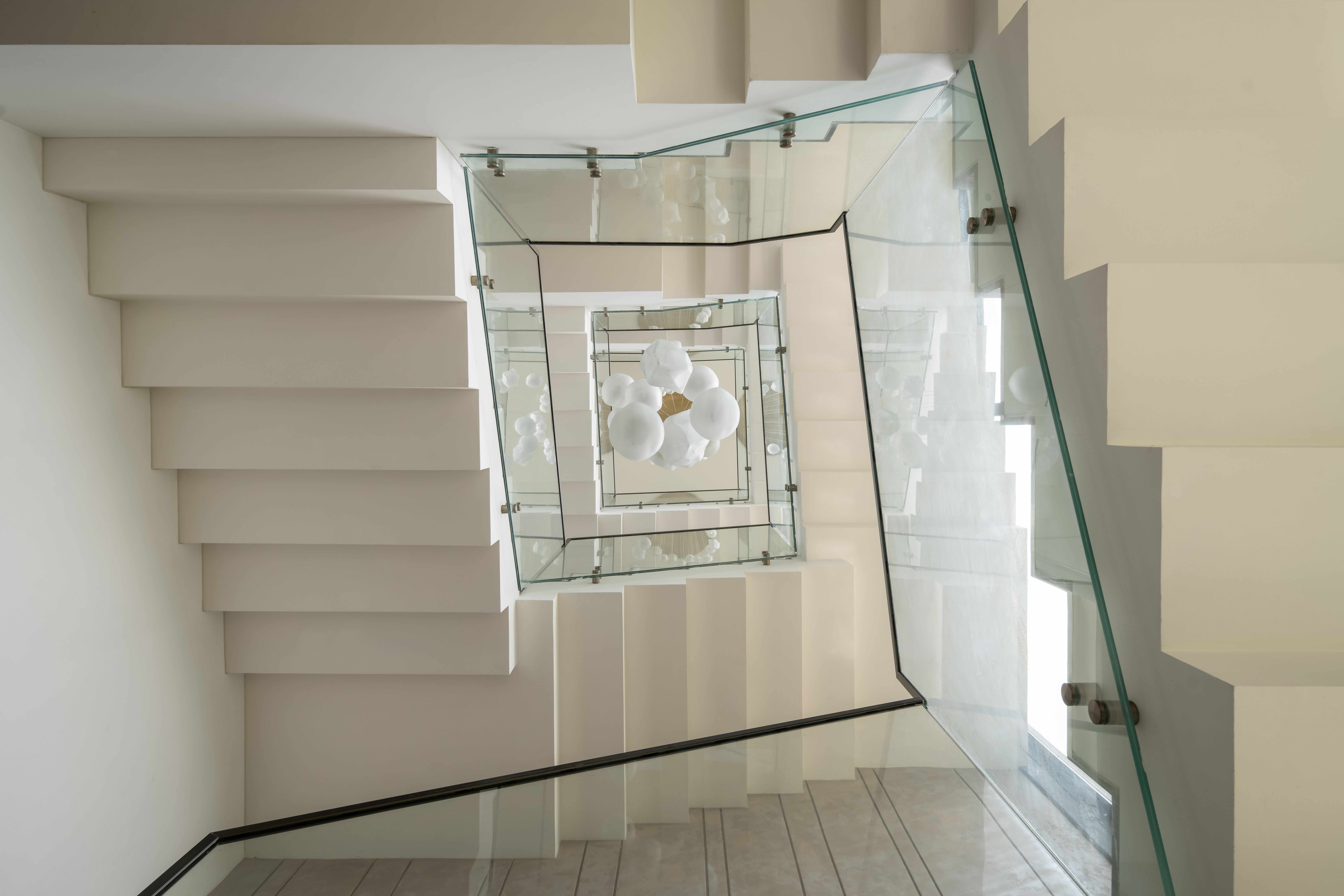 건축적으로는 햇빛이 쏟아지는 극적인 이중 높이의 현관과 중앙 계단이 특징입니다. 이 공간은 하루 종일 밝기와 그림자가 변화하며 역동적인 시각적 효과를 연출합니다. 마감은 돌, 목재, 와 같이 은은한 빛을 띄는 재료로 구성되어 있는데, 빛이 마감재의 표면을 비추며 질감과 따스함을 강조해 몽환적인 분위기를 자아냅니다. 태양의 움직임에 따라 트리비크라마라야는 빛과 그림자가 조화를 이루며 끊임없이 각 방의 분위기를 새롭게 정의하는 살아 있는 캔버스로 변모합니다. AND Studio는 세심한 설계를 통해 자이푸르의 사막 기후에 대응하는 동시에 안식처이자 역동적인 생활 공간을 만들어냈습니다.