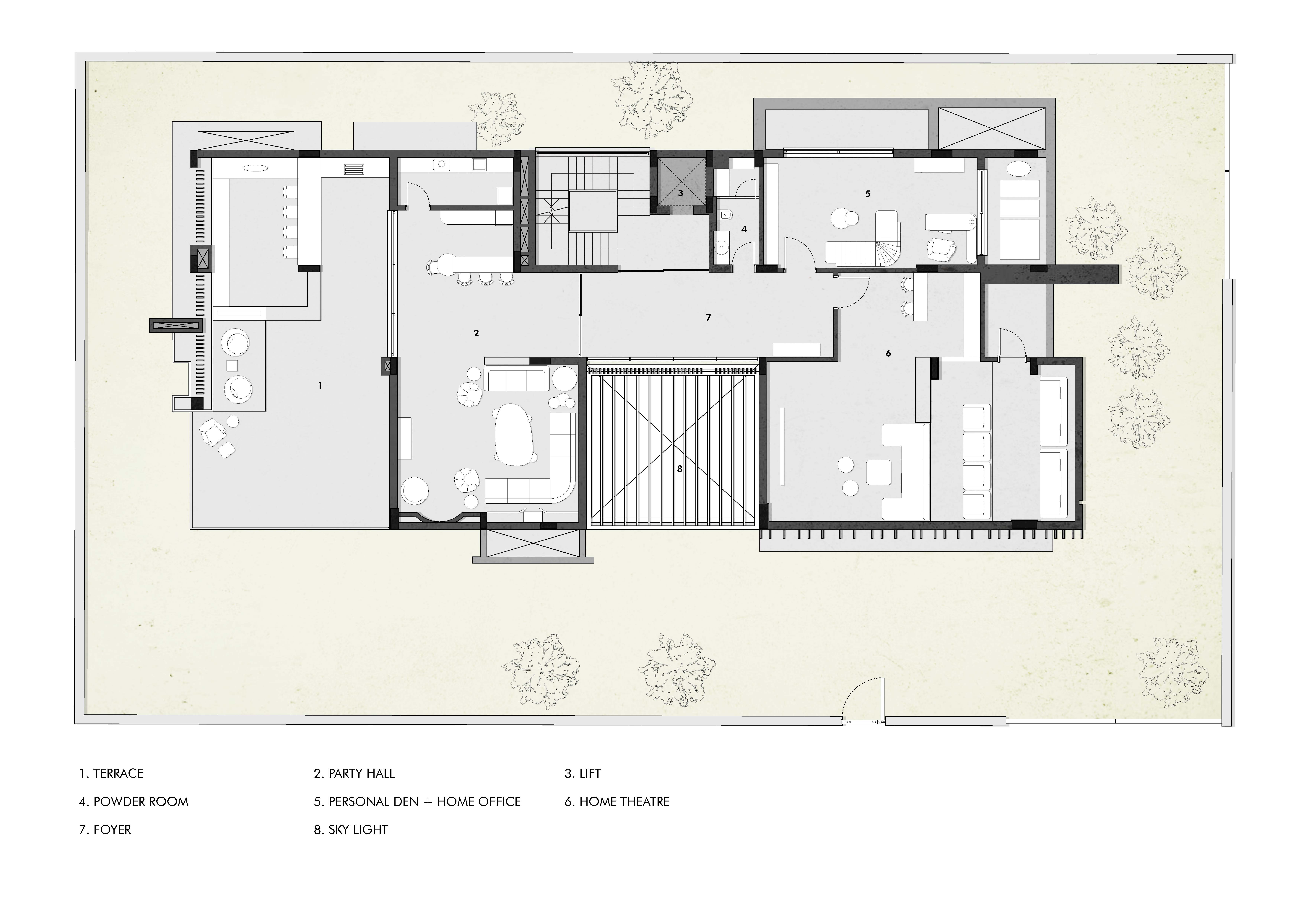 트리비크라마라야는 연결성을 고려한 설계를 통해 넓은 사교 공간과 아늑한 개인 공간을 조화롭게 만듭니다. 이 집은 대규모 모임과 조용한 휴식을 모두 수용할 수 있는 다목적 공간을 제공합니다. 사교 공간에는 비공식 라운지, 야외 테라스, 바 공간이 포함되어 있으며, 실내외 전환을 통해 개방성과 공간사이의 상호작용을 극대화합니다. 홈시어터는 몰입형 엔터테인먼트와 축제를 위한 다목적 공간으로 사용할 수 있습니다. 반대로, 개인 서재와 고요한 데크와 같은 은밀한 휴식처는 사색과 휴식을 위한 차분한 공간으로 사용됩니다. 그늘진 테라스와 덮인 안뜰과 같은 야외 공간은 자연과 연결되면서도 사막의 거친 환경으로부터 보호해줍니다.