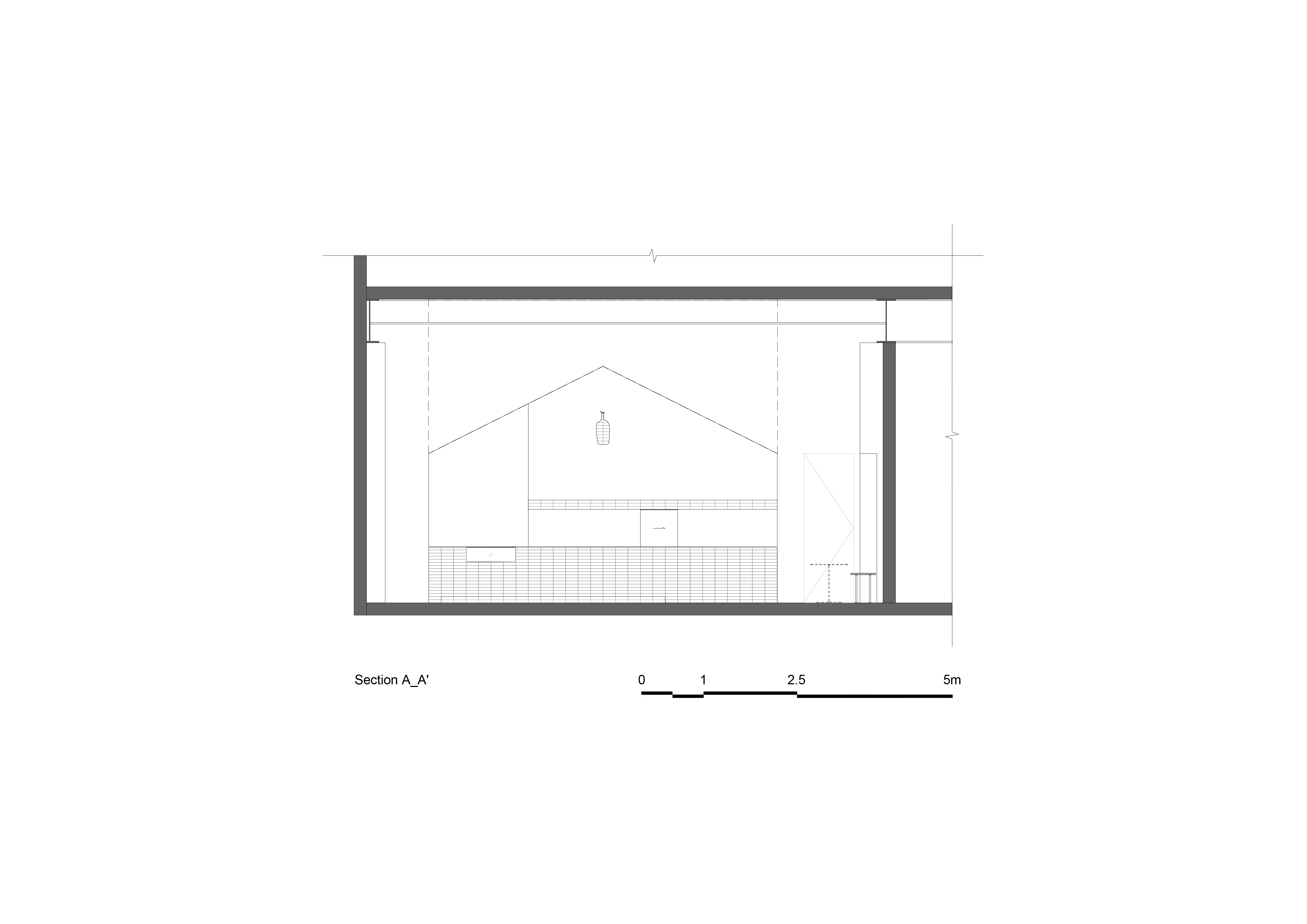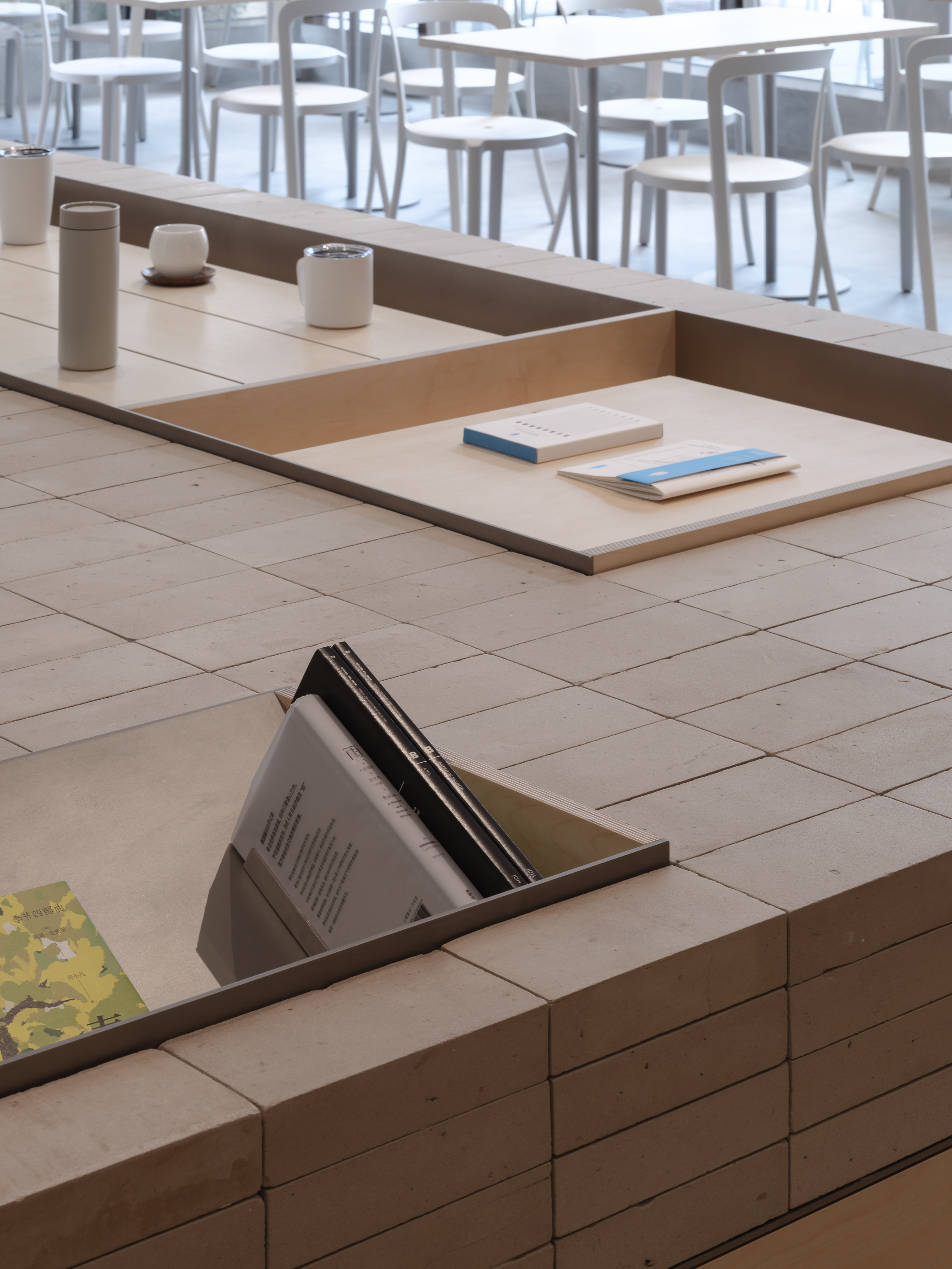 집의 물리적 부재에도 불구하고 사람들은 음각화 된 처마 아래에 있을 때 지붕 아래에 있는 듯한 공간적 경험을 느낄 수 있습니다. 흰색 매스 아래에는 커피 제조 공간과 다목적 플랫폼이 배치되어 있습니다. 메인 입구를 통해 들어오면, 방문객들은 상품 진열대를 지나 제품을 둘러볼 수 있습니다. 주문을 기다리며 책을 살펴볼 수도 있습니다. 이후 바닥 곳곳에 자리 잡고 커피를 즐길 수 있습니다. 중앙의 다목적 바닥 공간은 순환 동선을 형성합니다. 주변에는 테이블과 의자가 배치되어 있습니다. 부재하는 집이라는 중심적 초점을 통해 만들어진 "흔적"은 방문객들을 커뮤니티로 초대합니다. 이 공간에서 사람들은 일상의 다양한 의식에 참여하고, 새로운 만남과 교류를 즐길 수 있습니다.