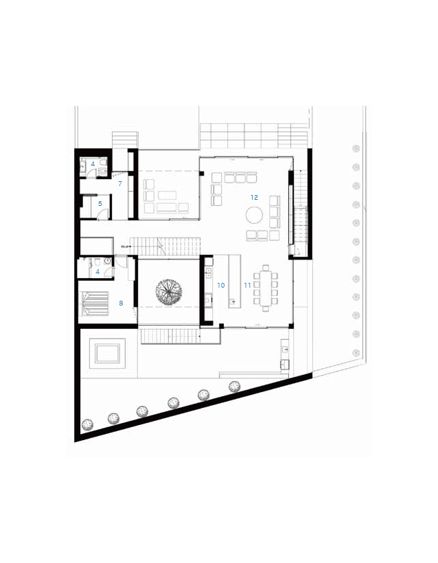 수영장과 이어지는 북쪽의 정원은 넓은 곳에서 풍경을 즐기며 쉴 수 있는 공간이지만, 남쪽 정원은 작고 아늑한 공간으로 조성했다. 주택의 중심에 위치한 정원은 세 개의 층에 걸쳐 덮힌 공간과 열린 빈 공간을 이어주며 일정한 연속성을 유지한다. 정원은 주변의 공간들을 모으고 빛을 지하까지 전달한다.