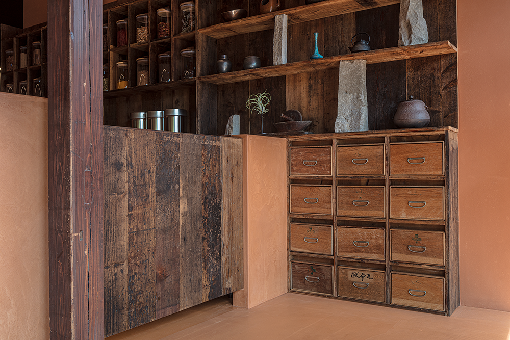 공간의 중심에 도마(土間, 일본건축에서 현관과 방사이의 실외와 실내의 중간적인 공간)와같은 장소와, 단차가 있는 공간에 계단이나 벤치를 설치해 방문객들이 다양한 방법으로 시간을 보낼 수 있도록 했다. 이는 안과 밖이 경계 없이 이어지는 편안한 공간을 체험을 하게 한다. 도마의 중심에 기존 전통가옥의 바닥 밑에 있던 석재와 목재로 바닥 마감을 하고 약초를 심은 아트를 배치했다. 이는 과거의 그리운 기억과 가게의 브랜드 스토리를 연결하는 디자인 요소이다. 그리고 도마를 둘러싼 로프파티션에는 덩굴식물을 심어 가게의 성장과 함께 변화하는 경치를 즐길 수 있다. 방문객들이 혼잡한 일상에서 벗어나 각자의 몸과 마음에 집중하는 하나의 계기가 되었으면 한다.