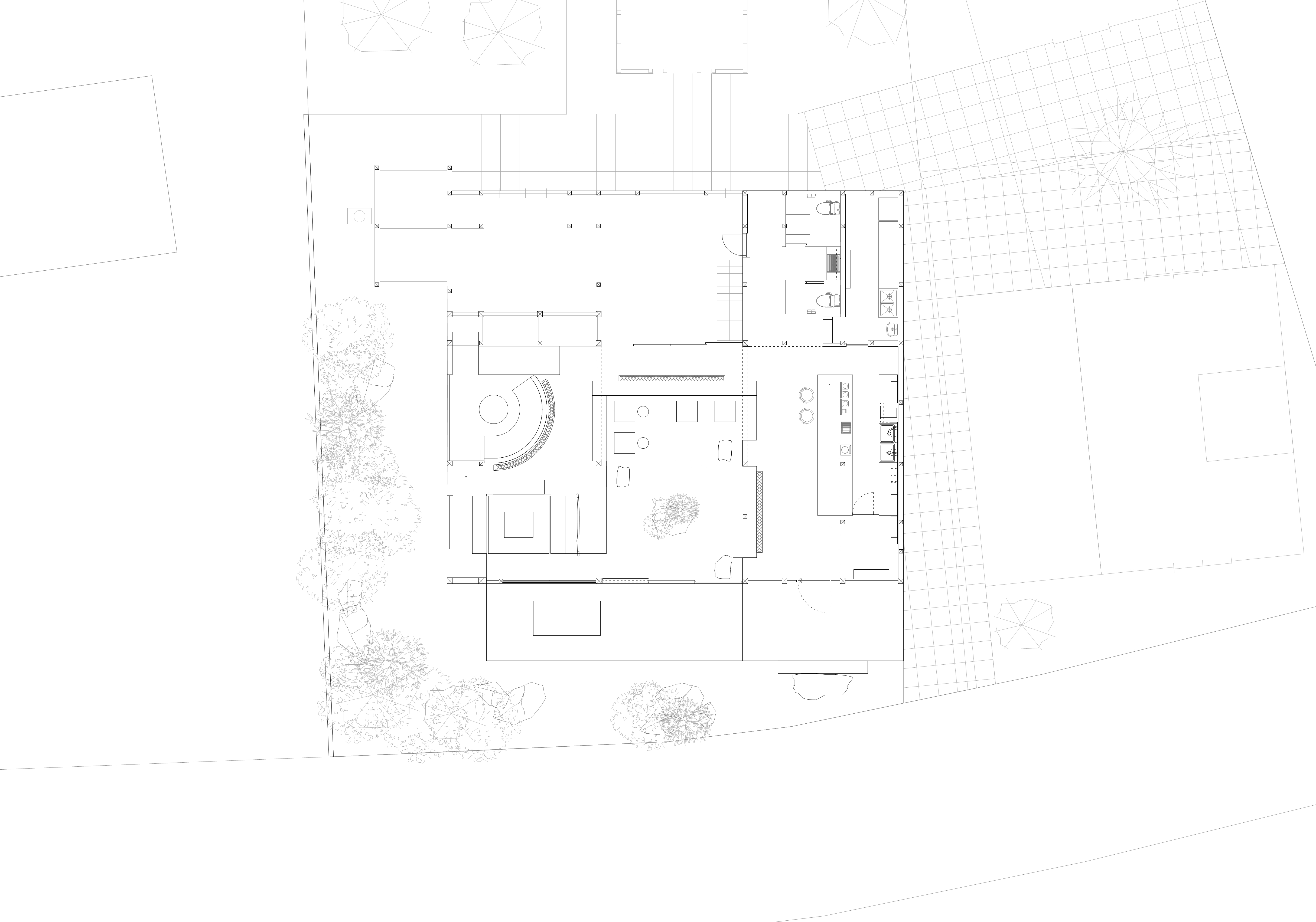 공간의 중심에 도마(土間, 일본건축에서 현관과 방사이의 실외와 실내의 중간적인 공간)와같은 장소와, 단차가 있는 공간에 계단이나 벤치를 설치해 방문객들이 다양한 방법으로 시간을 보낼 수 있도록 했다. 이는 안과 밖이 경계 없이 이어지는 편안한 공간을 체험을 하게 한다. 도마의 중심에 기존 전통가옥의 바닥 밑에 있던 석재와 목재로 바닥 마감을 하고 약초를 심은 아트를 배치했다. 이는 과거의 그리운 기억과 가게의 브랜드 스토리를 연결하는 디자인 요소이다. 그리고 도마를 둘러싼 로프파티션에는 덩굴식물을 심어 가게의 성장과 함께 변화하는 경치를 즐길 수 있다. 방문객들이 혼잡한 일상에서 벗어나 각자의 몸과 마음에 집중하는 하나의 계기가 되었으면 한다.